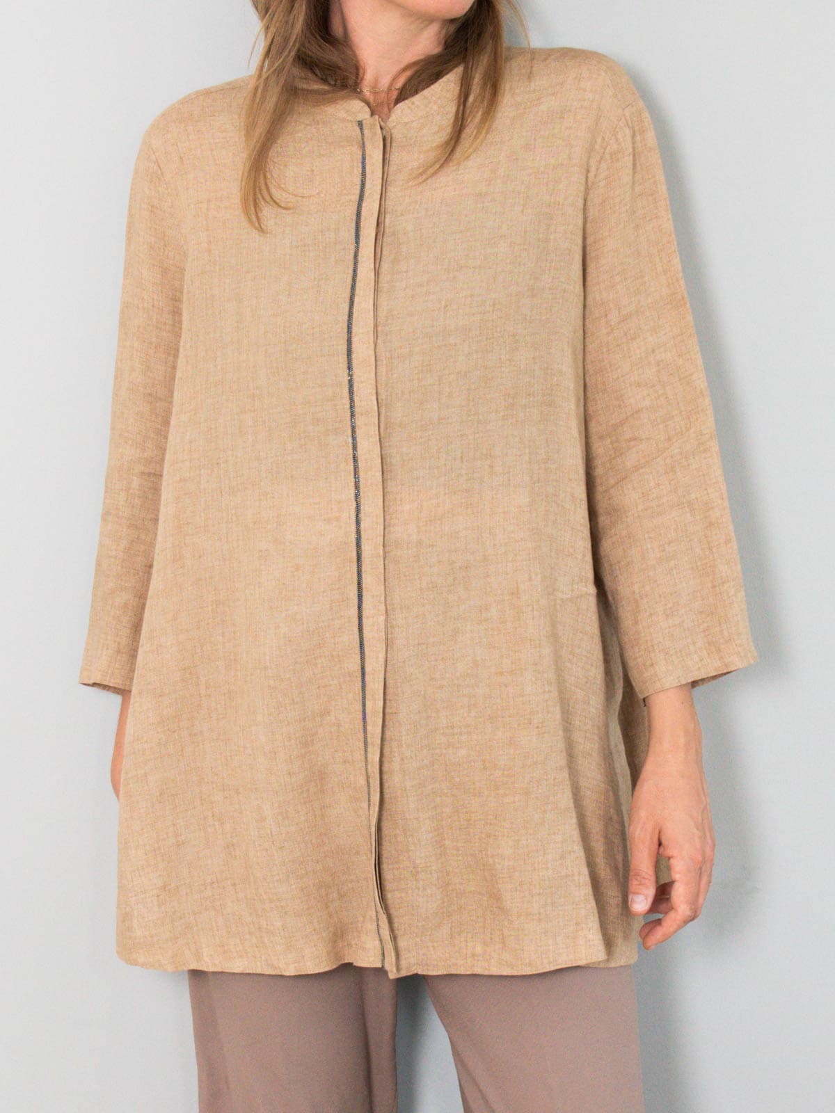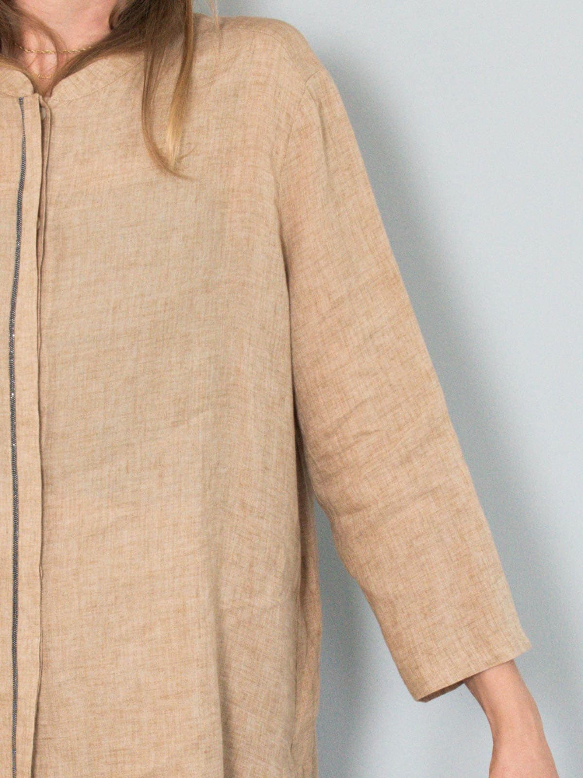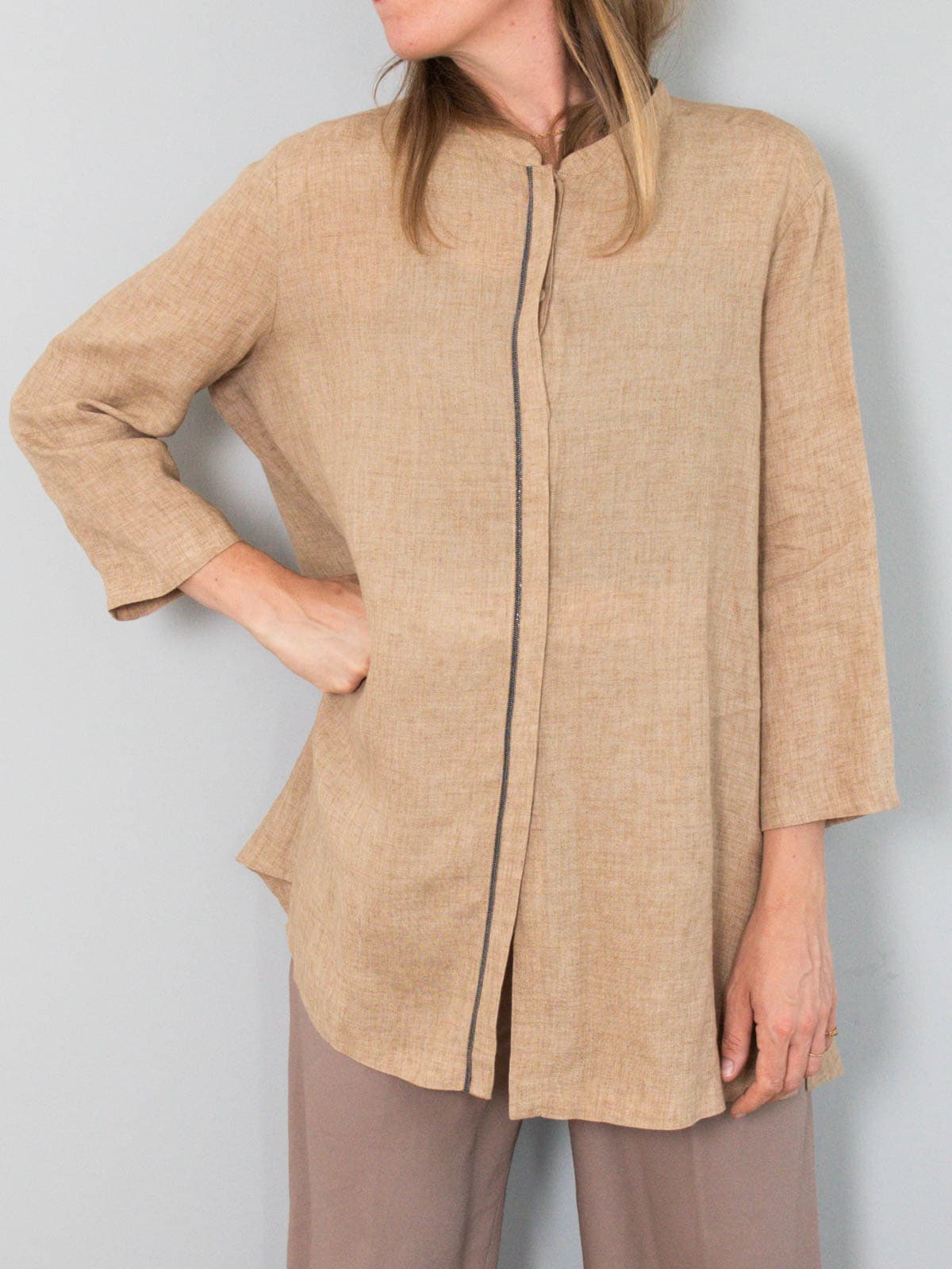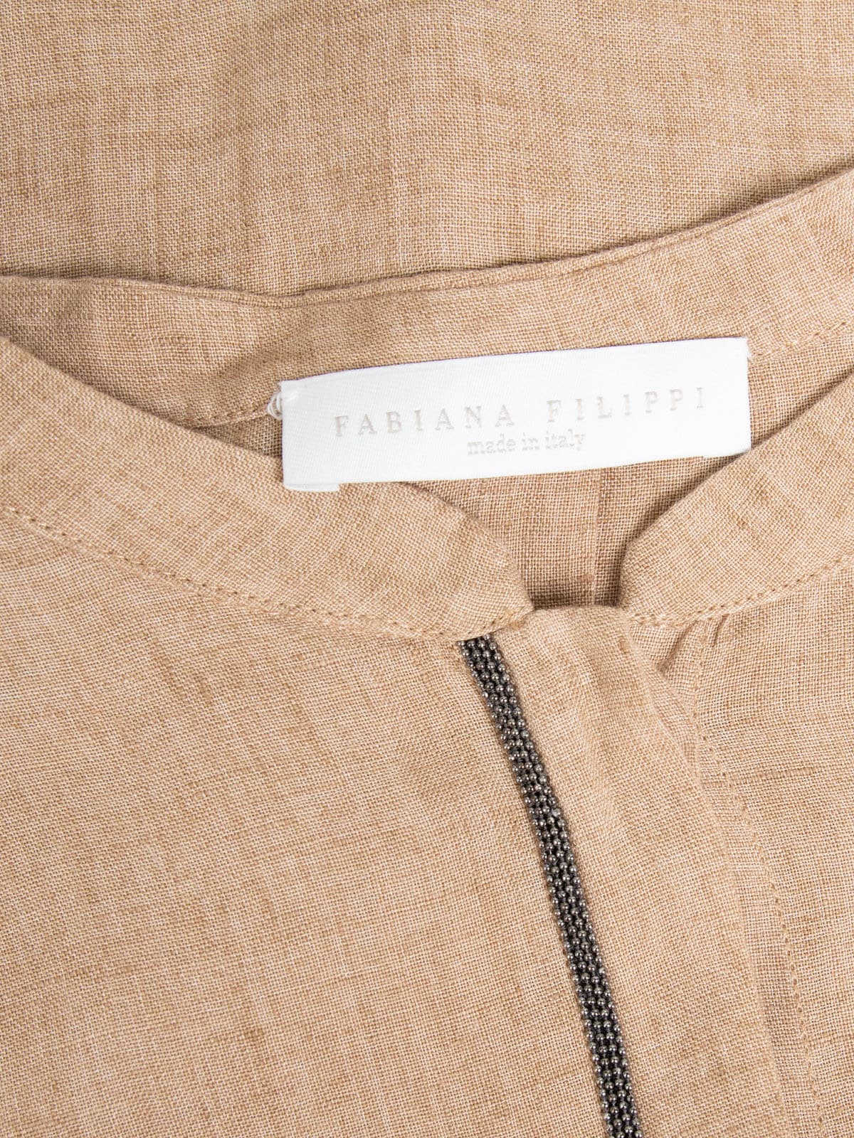 Beschreibung: Beigefarbene Tunika aus Leinen vom italienischen Luxuslabel Fabiana Filippi. Ausgezeichnet als deutsche Größe M (38) und großzügig geschnitten. Nachträglich wurde von der Vorbesitzerin ein braunes Taillenband nachgereicht, das zur Bluse dazugehört, auf den Fotos aber nicht zu sehen ist.