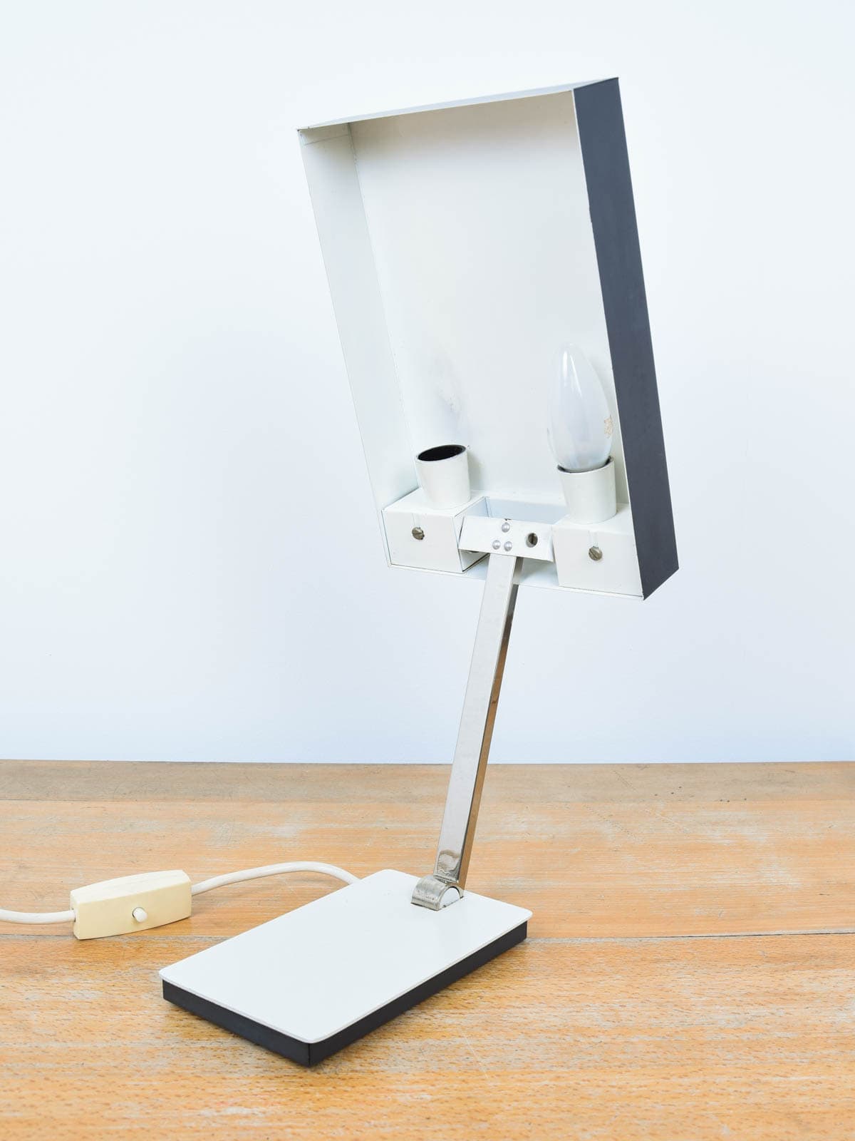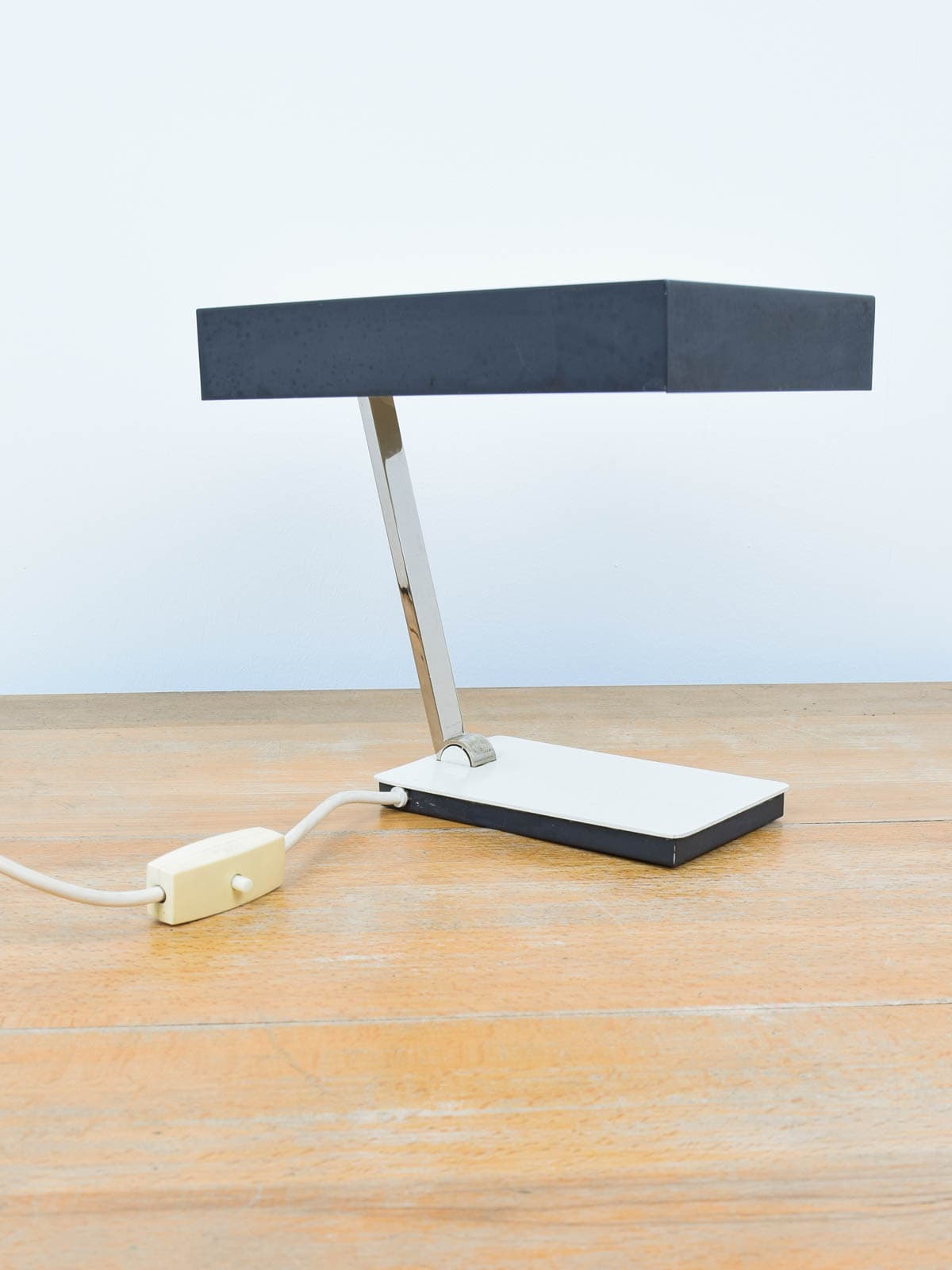 Beschreibung: Eine ausgefallene und massive Tischlampe aus den 60er Jahren. Die Lampe ist klappbar und lässt sich im Deckel verstauen.