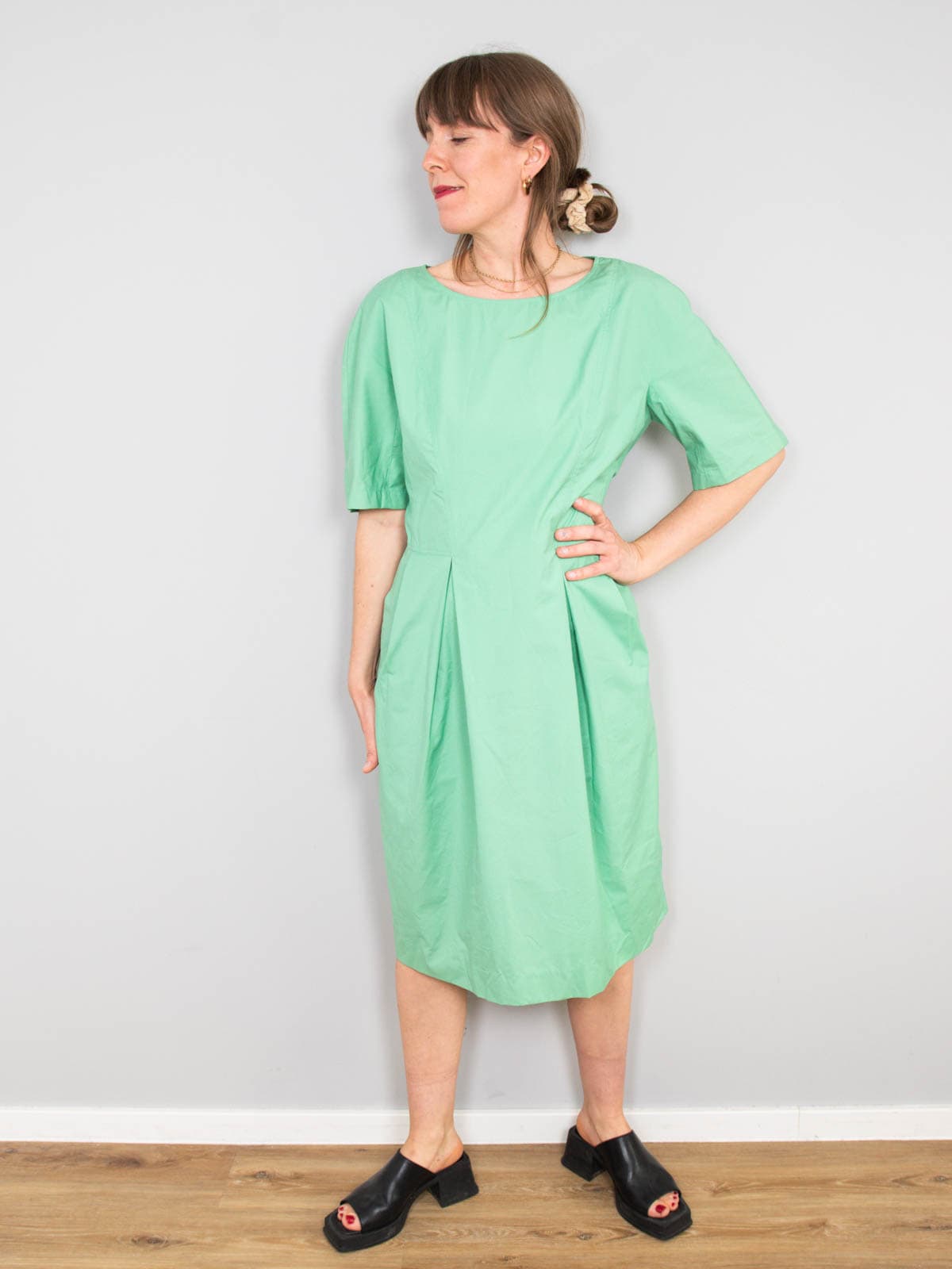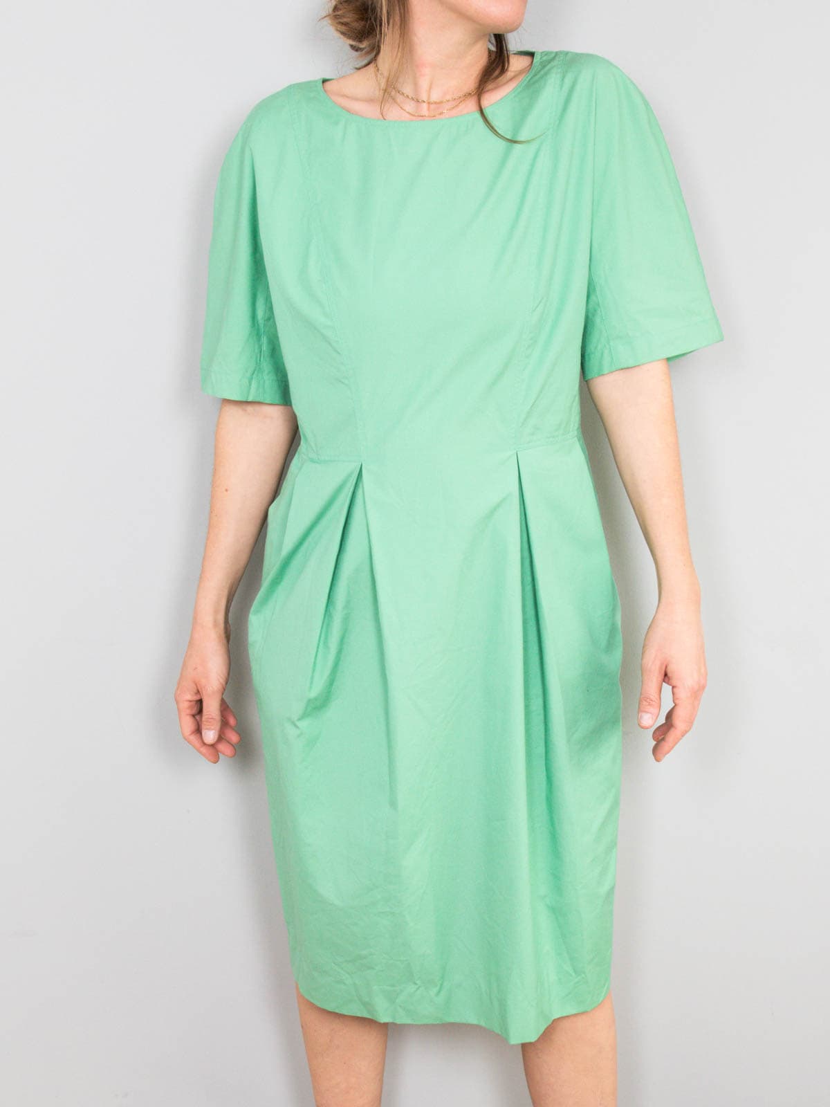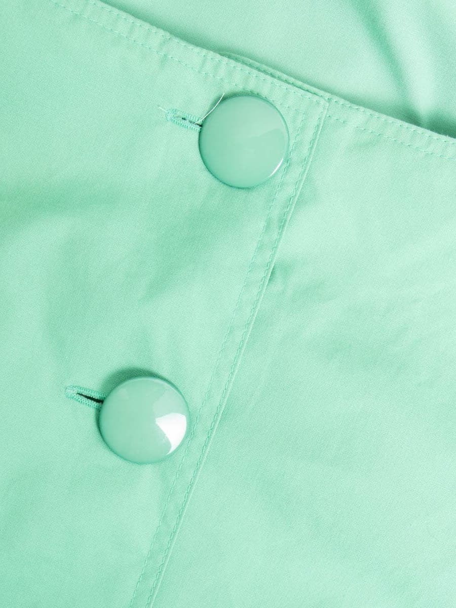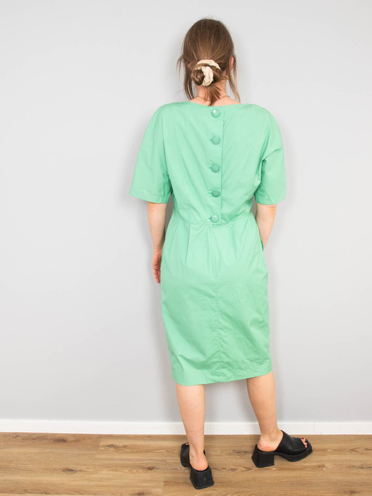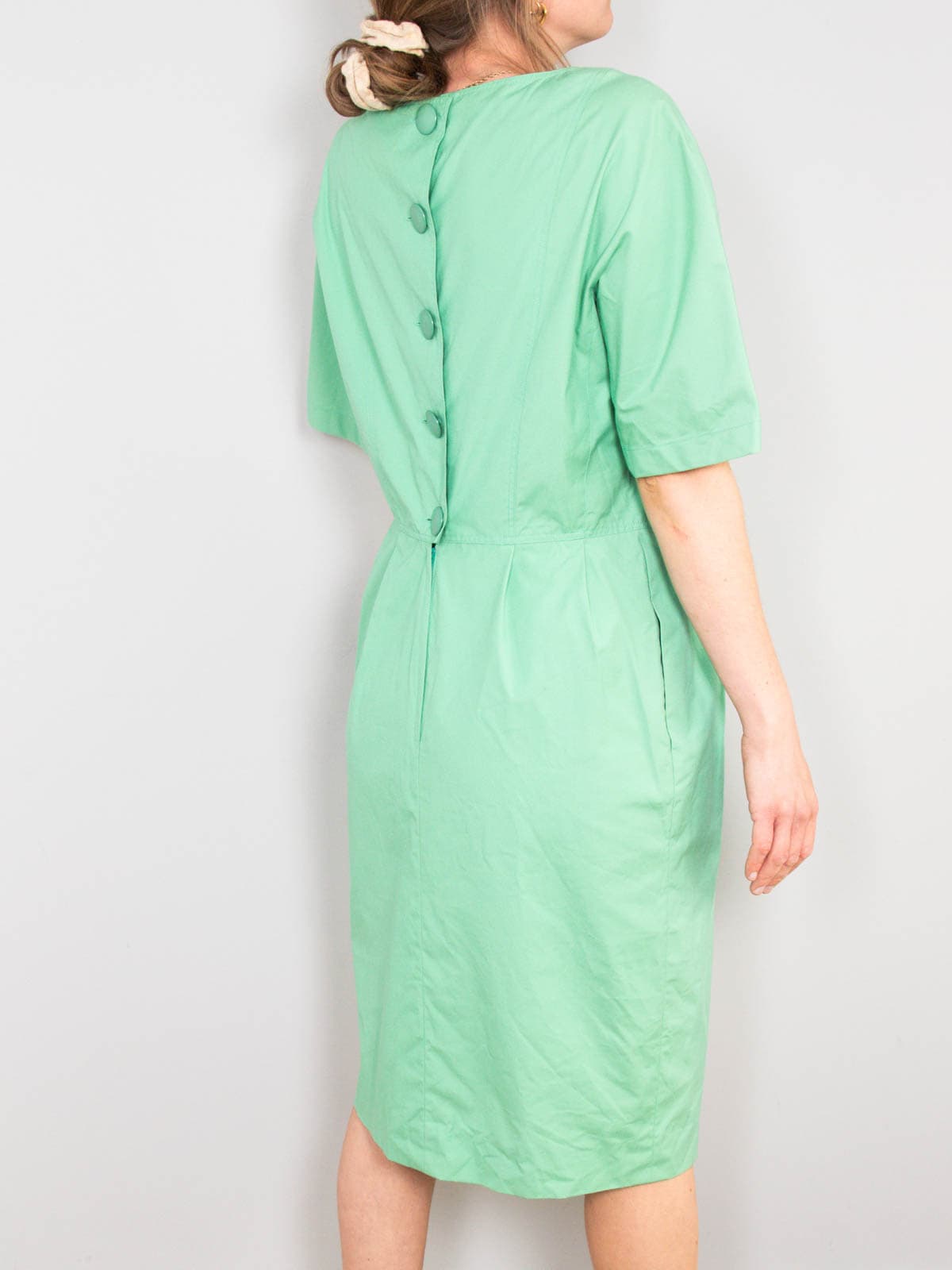 Beschreibung: Ausgefallenes Vintage Kleid in herrlichem Grün. Verschließbar mit dicken Knöpfen am Rücken plus Reißverschluss. Ausgestattet mit zwei Seitentaschen.