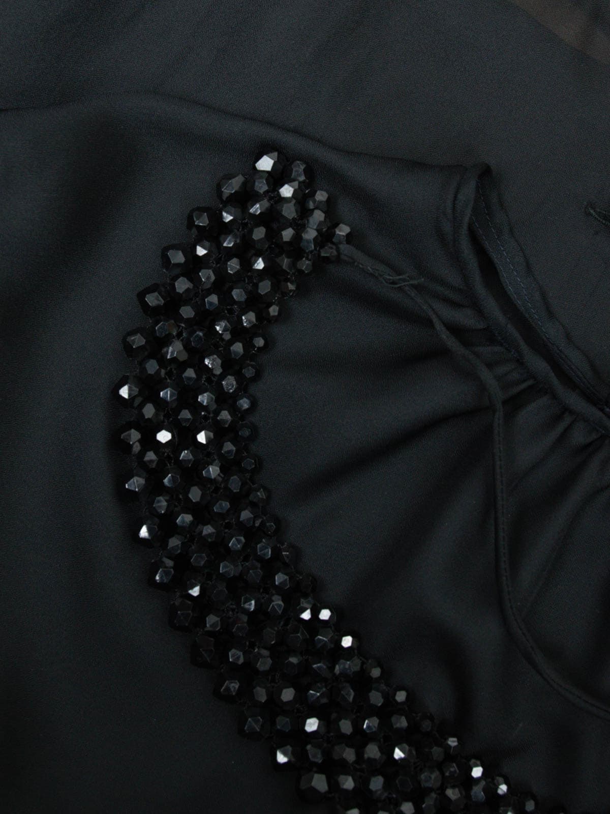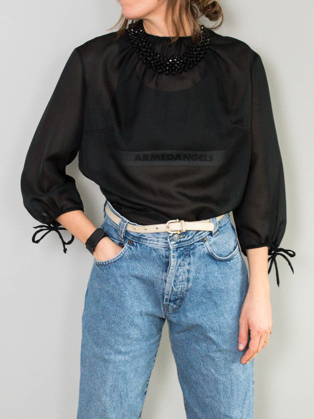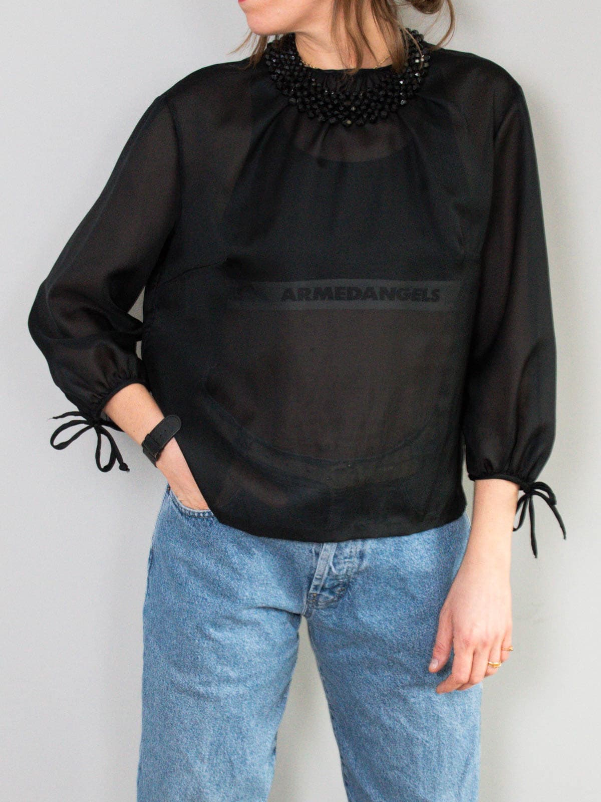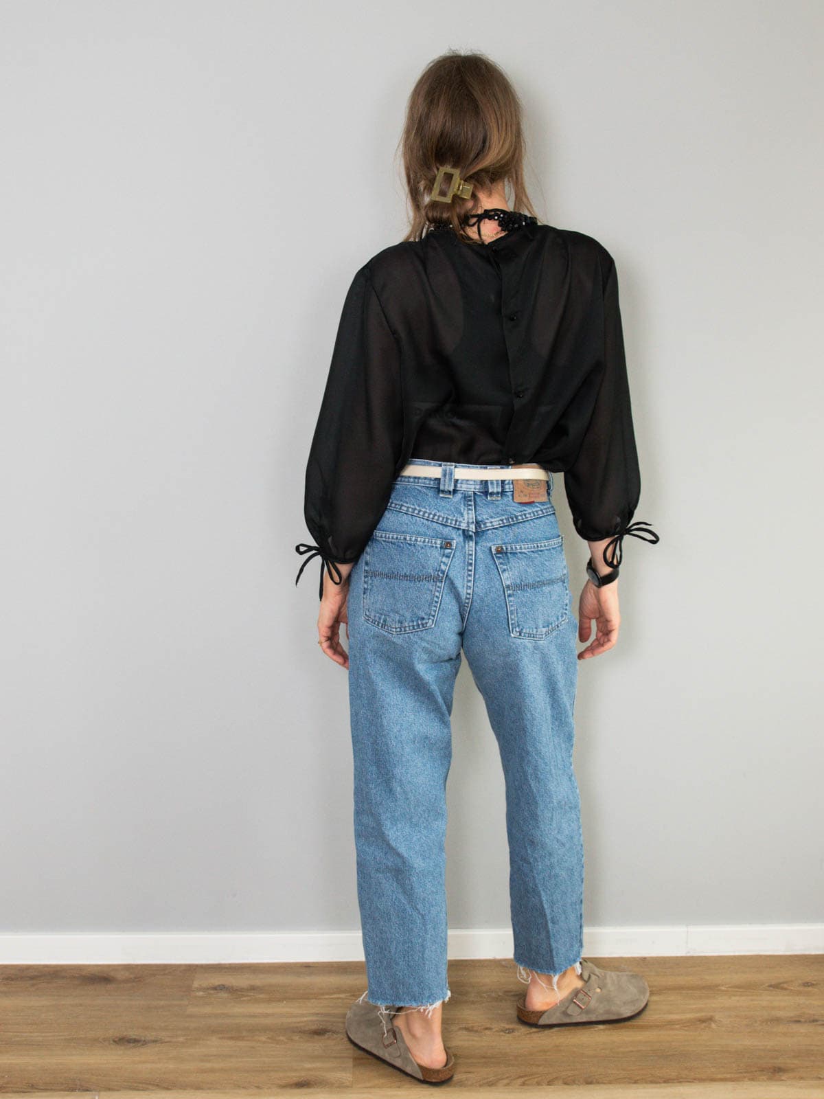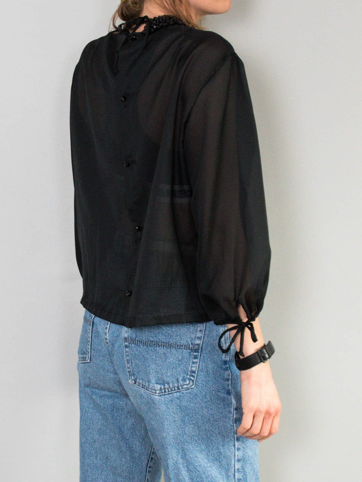 Beschreibung: Elegantes und transparentes Oberteil in Schwarz mit dazugehöriger Kette für den Hals, die sich am Hals beliebig eng oder weit binden lässt. Die Dreiviertelärmel sind am Abschluss ebenfalls zum binden. Das Oberteil ist mit einer durchgehenden Knopfleiste am Rücken ausgestattet.