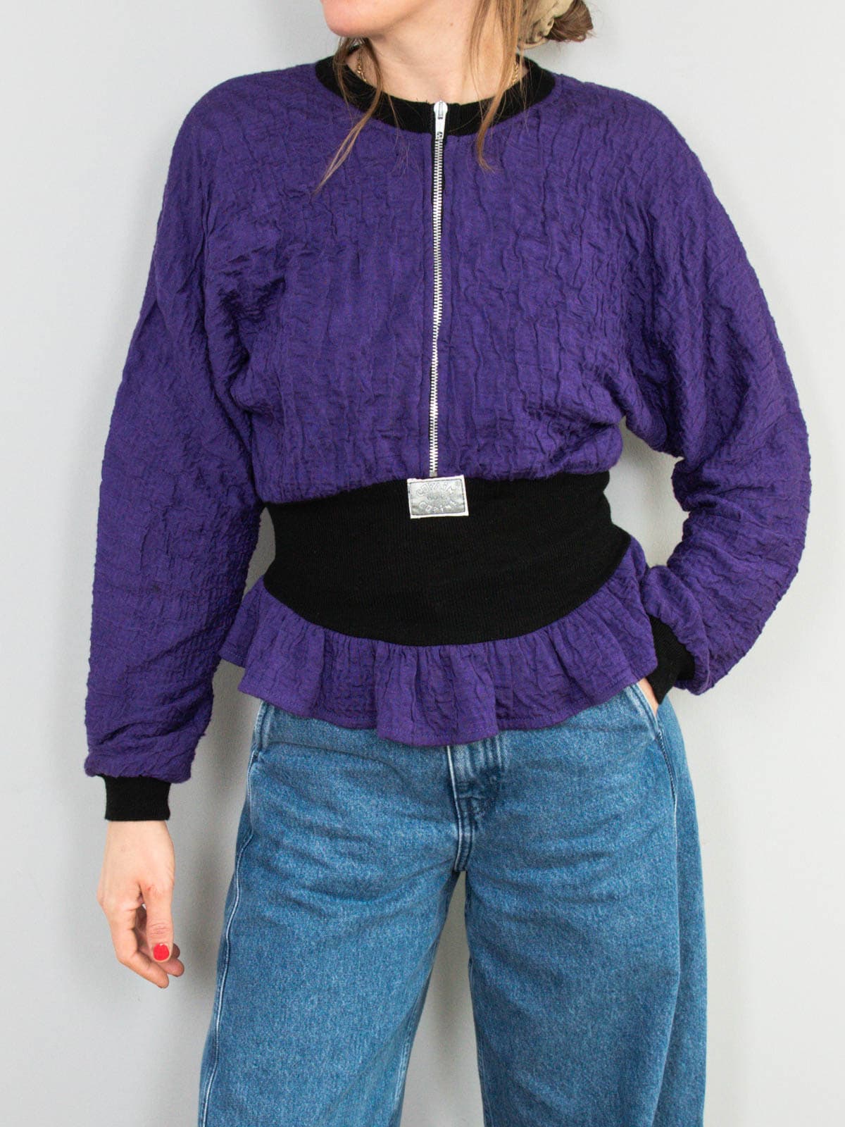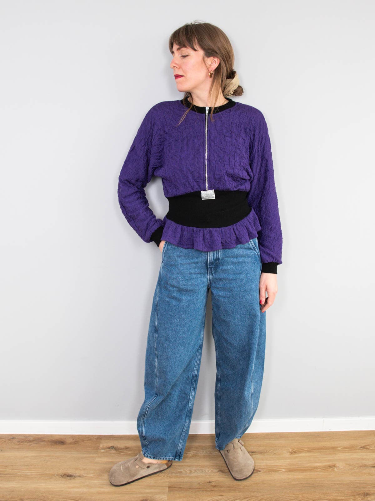 Beschreibung: Ausgefallener und dünner Vintage Sweater mit Fledermausärmeln und breitem Bündchen in der Taille.