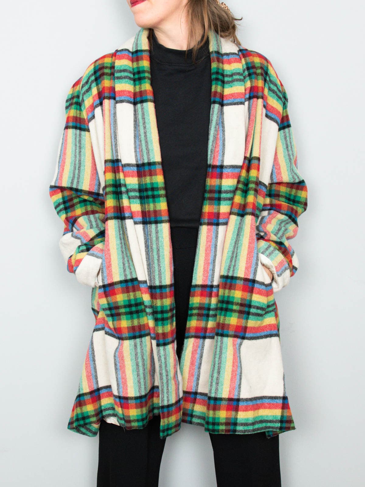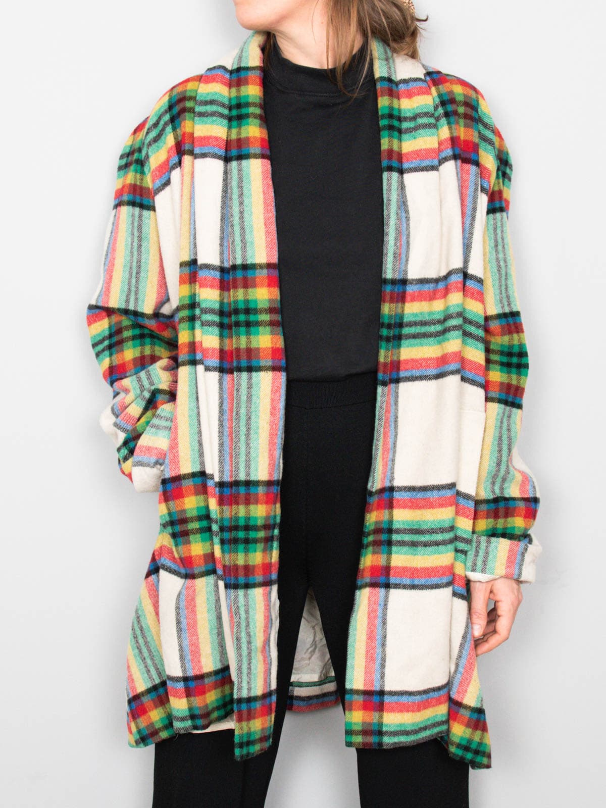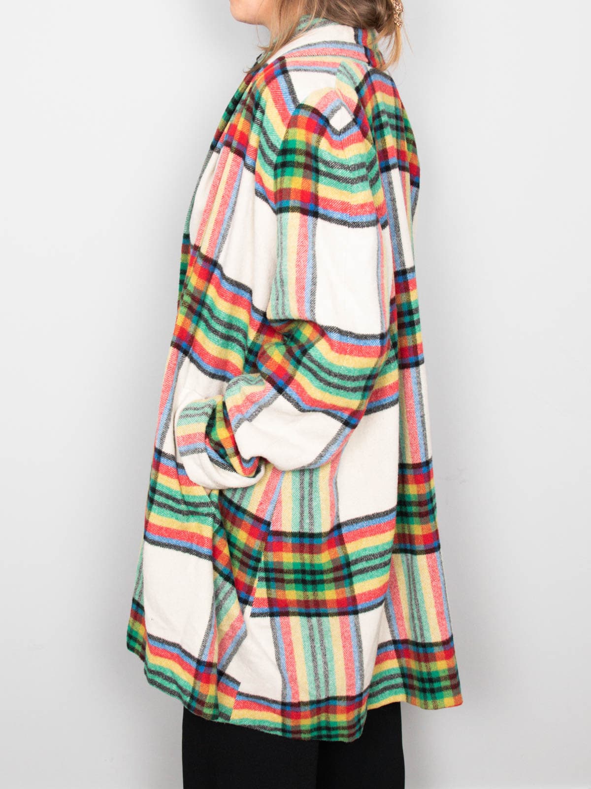 Beschreibung: Hinreißender karierter Vintage Wollmantel im Oversize Schnitt. An der Schulterpartie ist der Mantel weiter geschnitten. Ausgestattet ist er mit zwei Taschen und der Mantel ist nicht zu verschließen. Der ideale Begleiter für die Übergangstemperaturen.