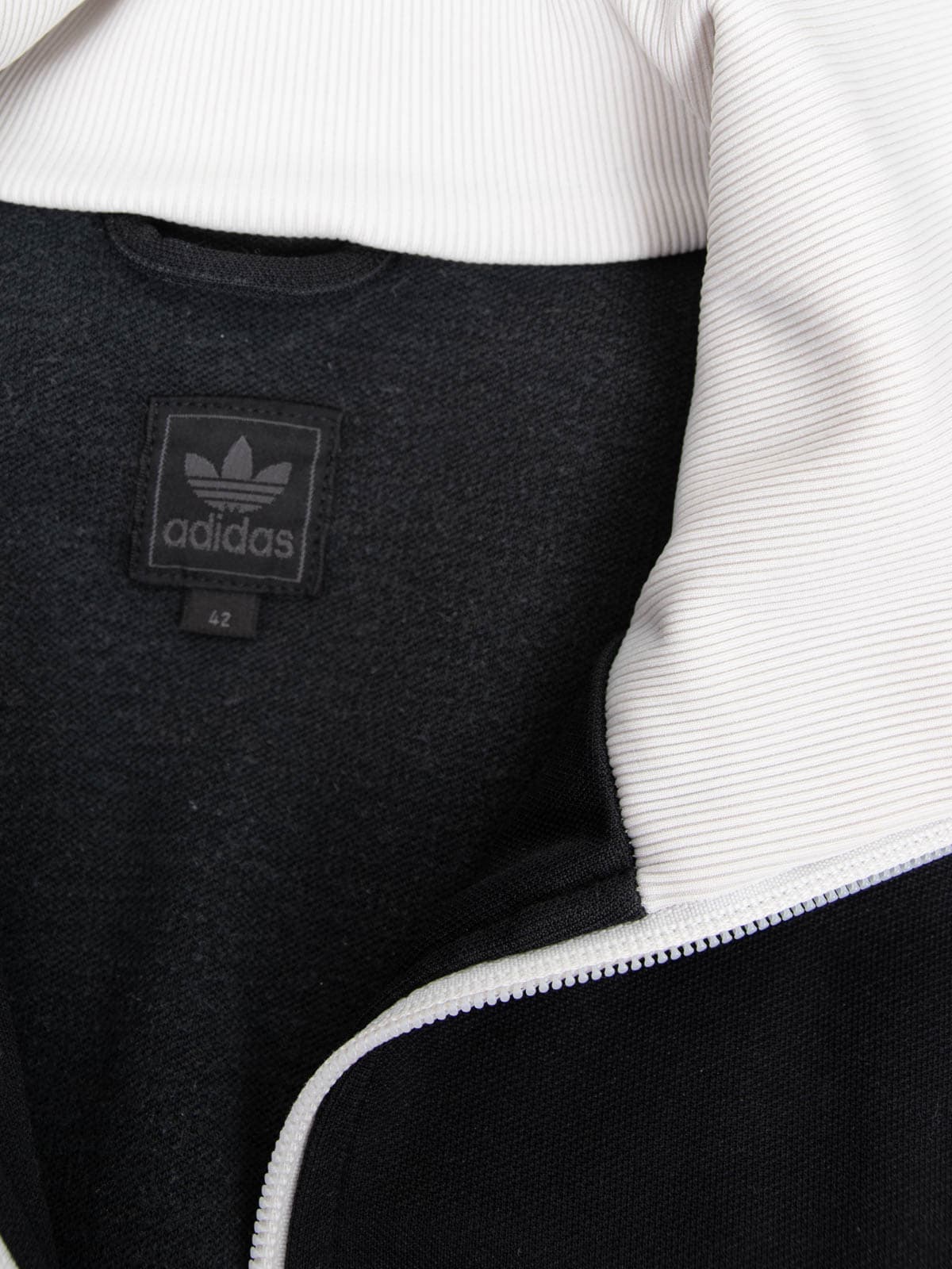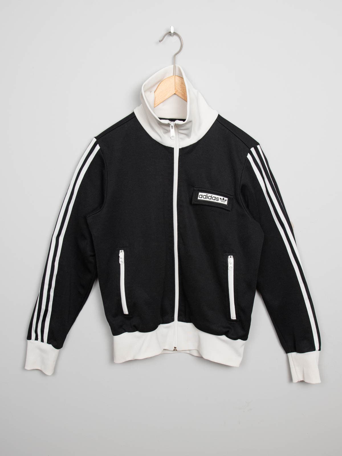 Beschreibung: Kultige Adidas Zipperjacke in Schwarzweiß. Ausgestattet mit zwei Reißverschlusstaschen plus Brusttasche mit Klettverschluss und Adidas Stickerei.