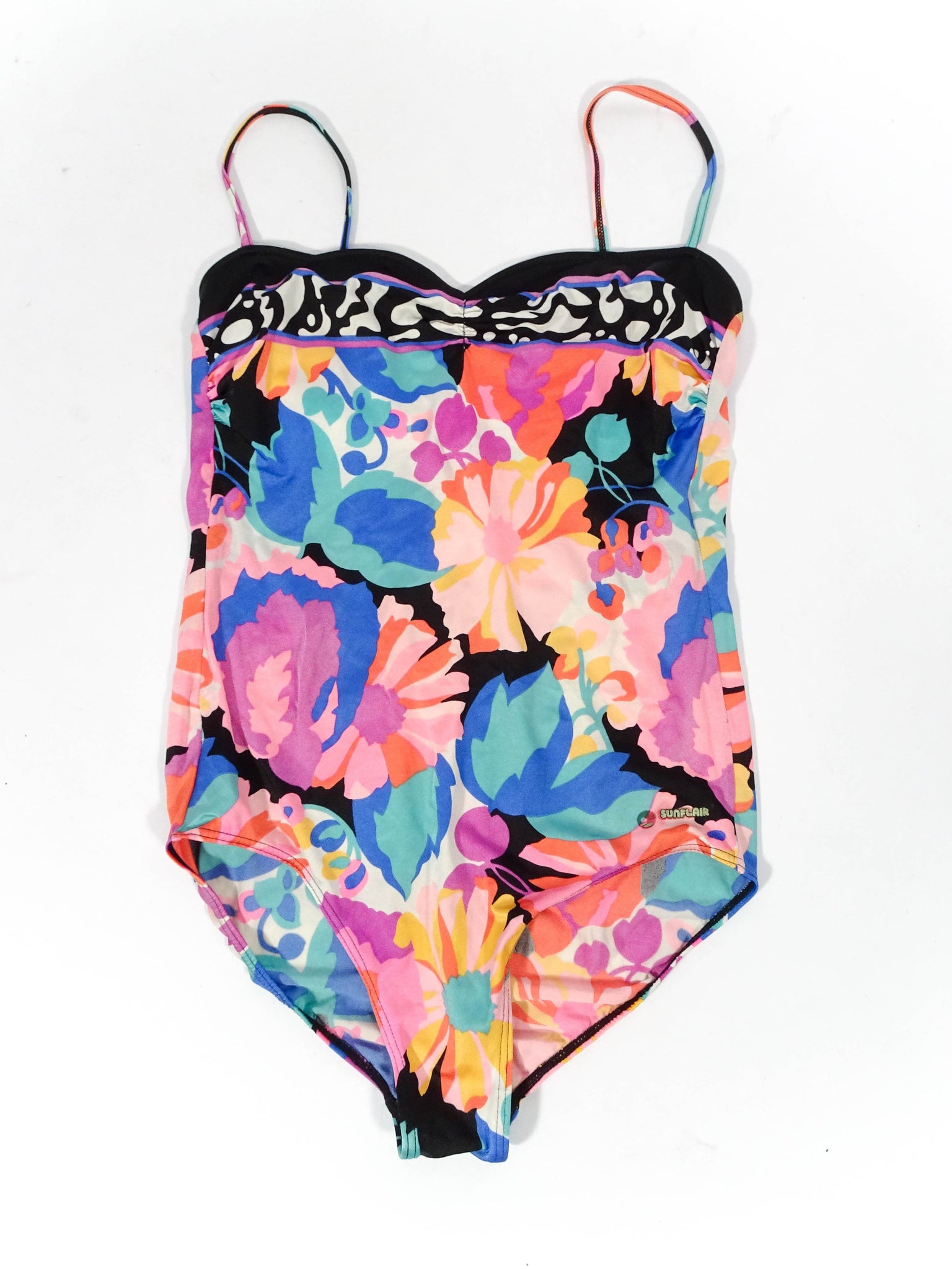 Beschreibung: Ein hinreißender schwarzer Badeanzug mit kunterbuntem Blumenmotiv. Das Dekolleté ist leicht gerafft.