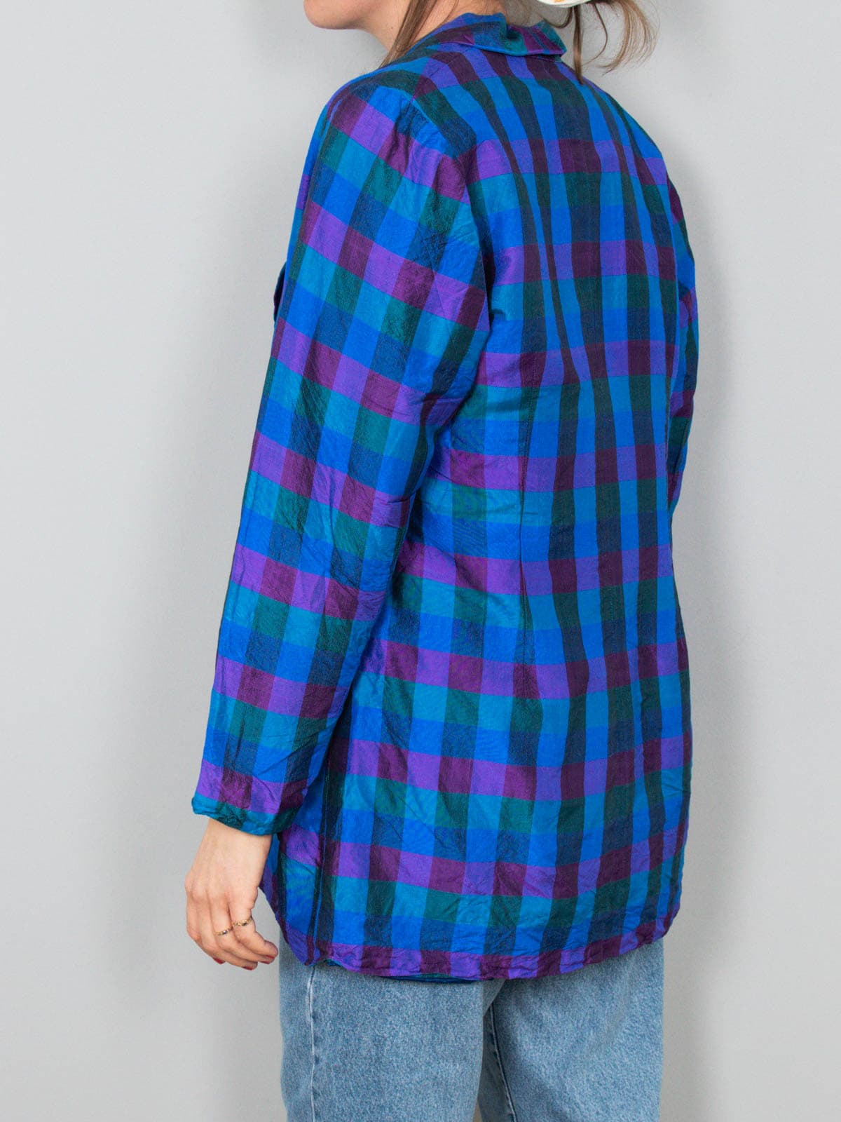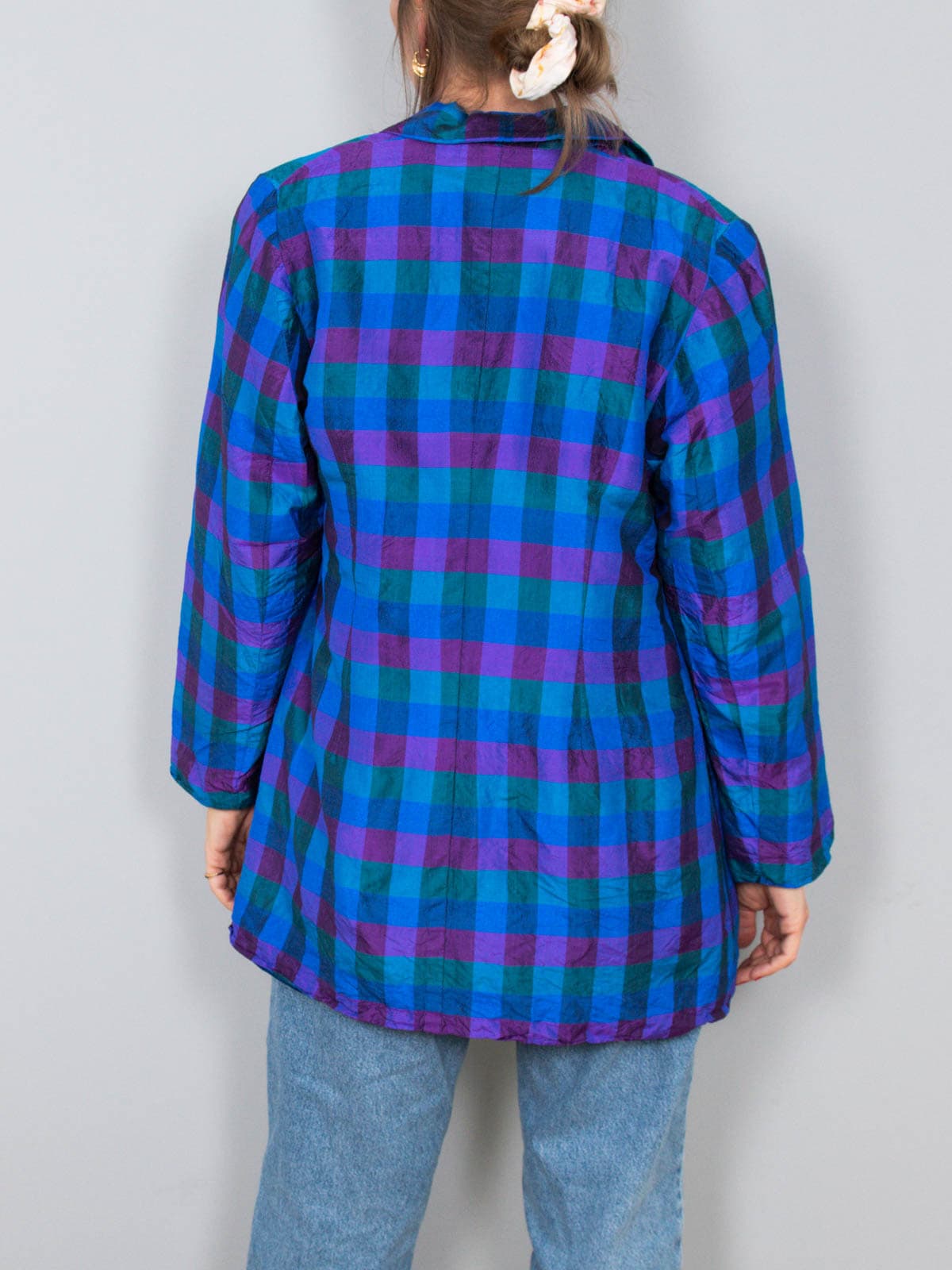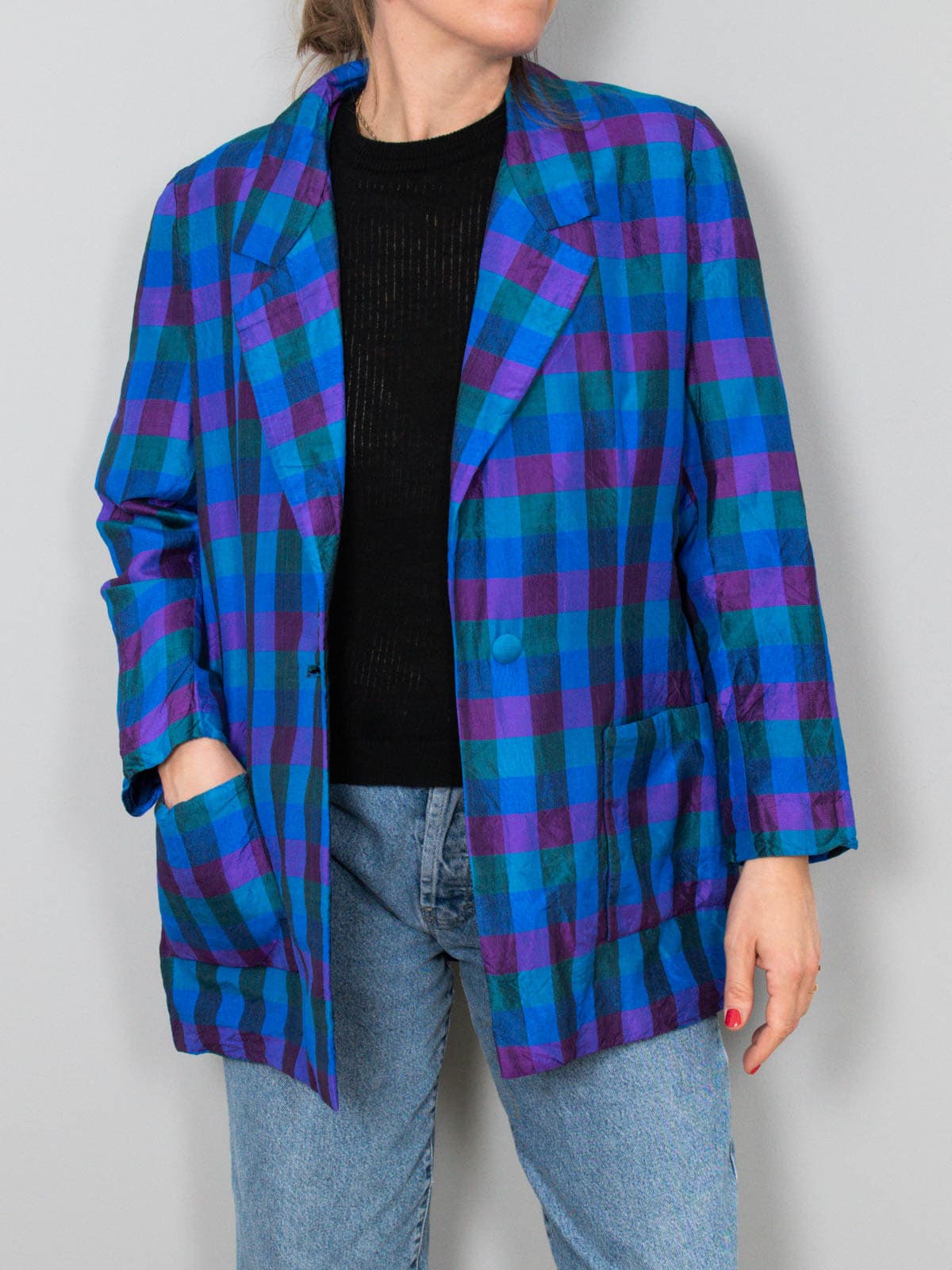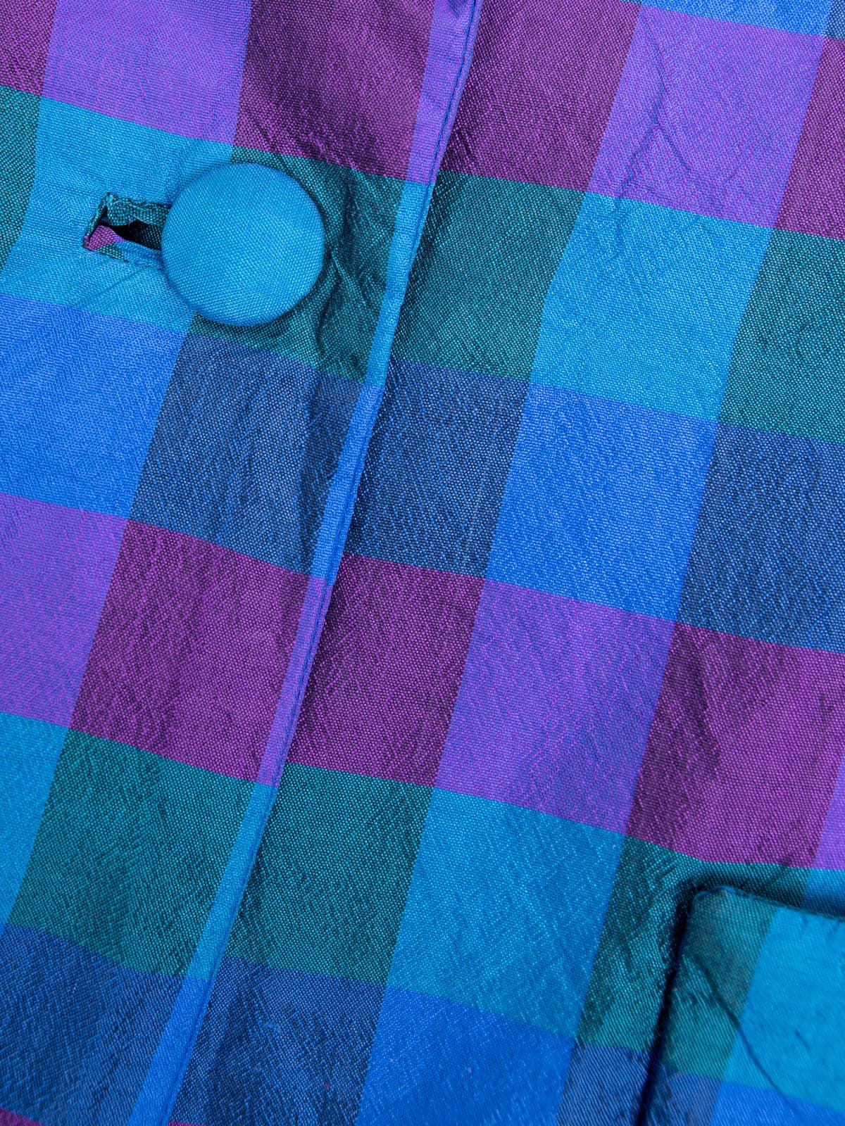 Beschreibung: Edler, karierter Vintage Blazer aus reiner Wildseide. Ausgestattet mit zwei Seitentaschen.