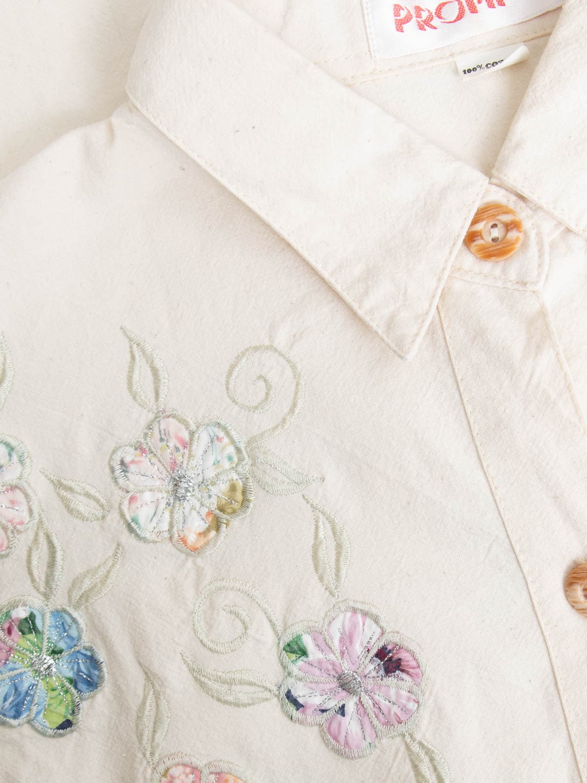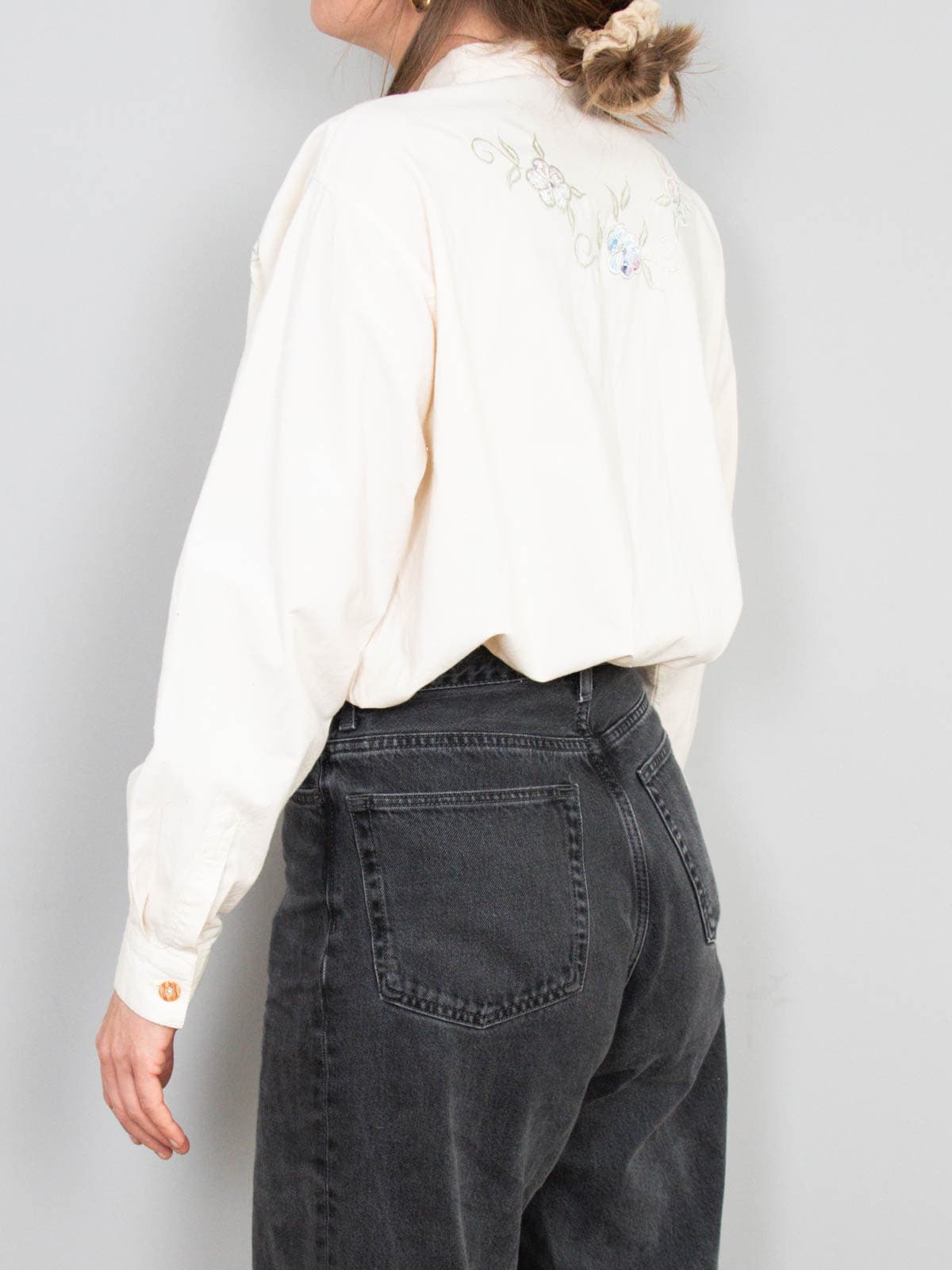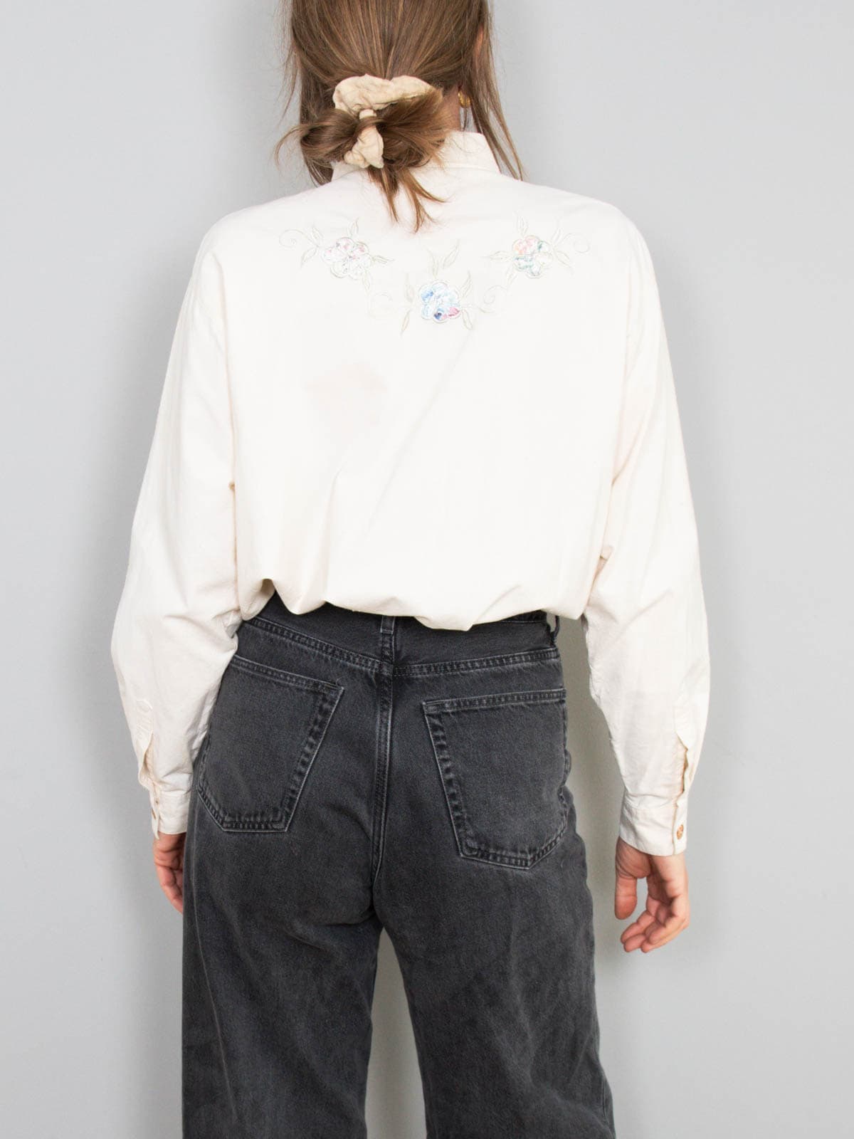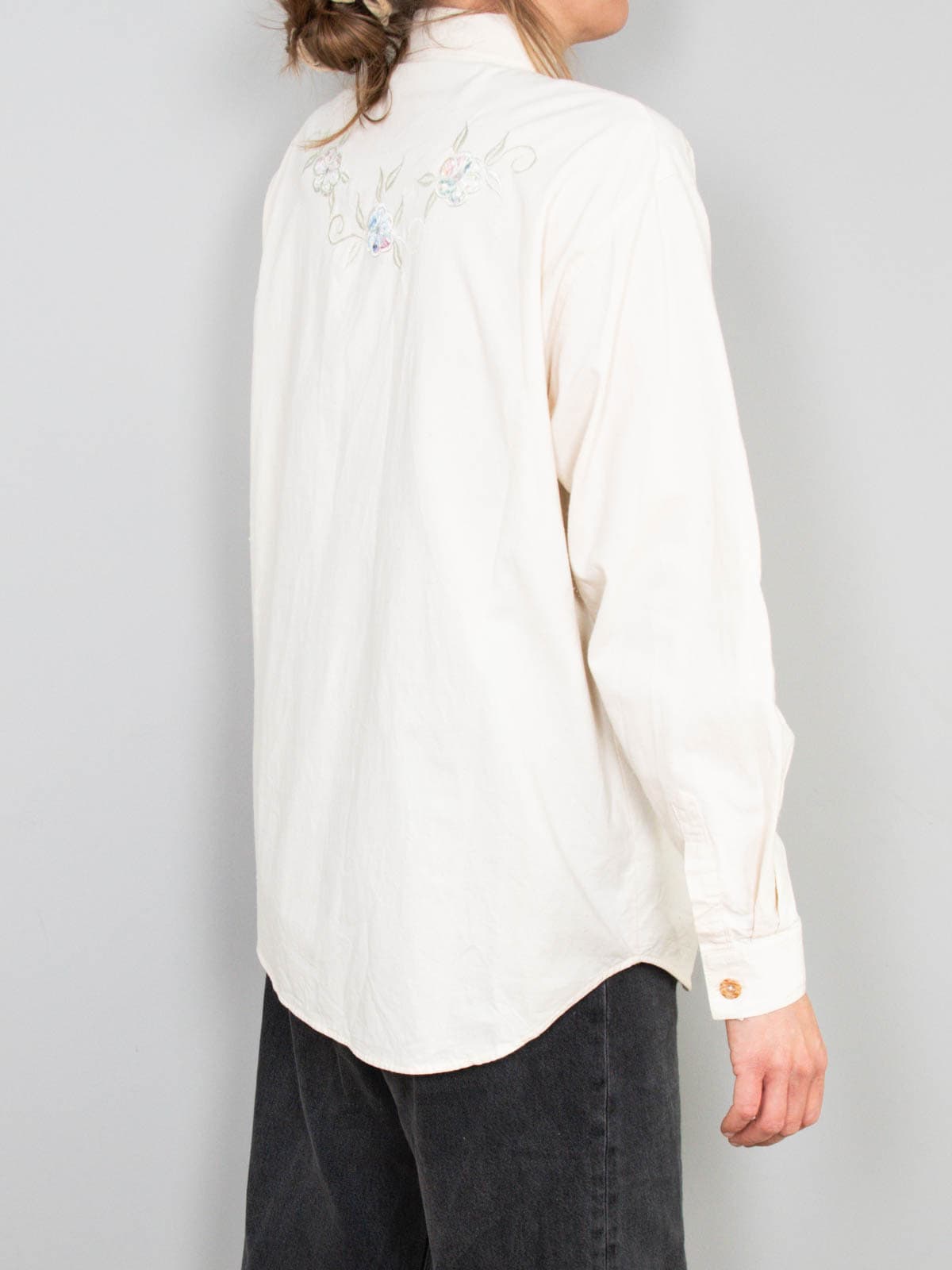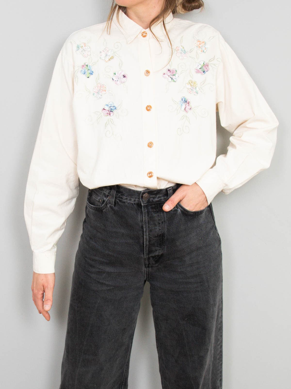 Beschreibung: Vintage Bluse in Creme mit Blumenstickereien auf der Front.