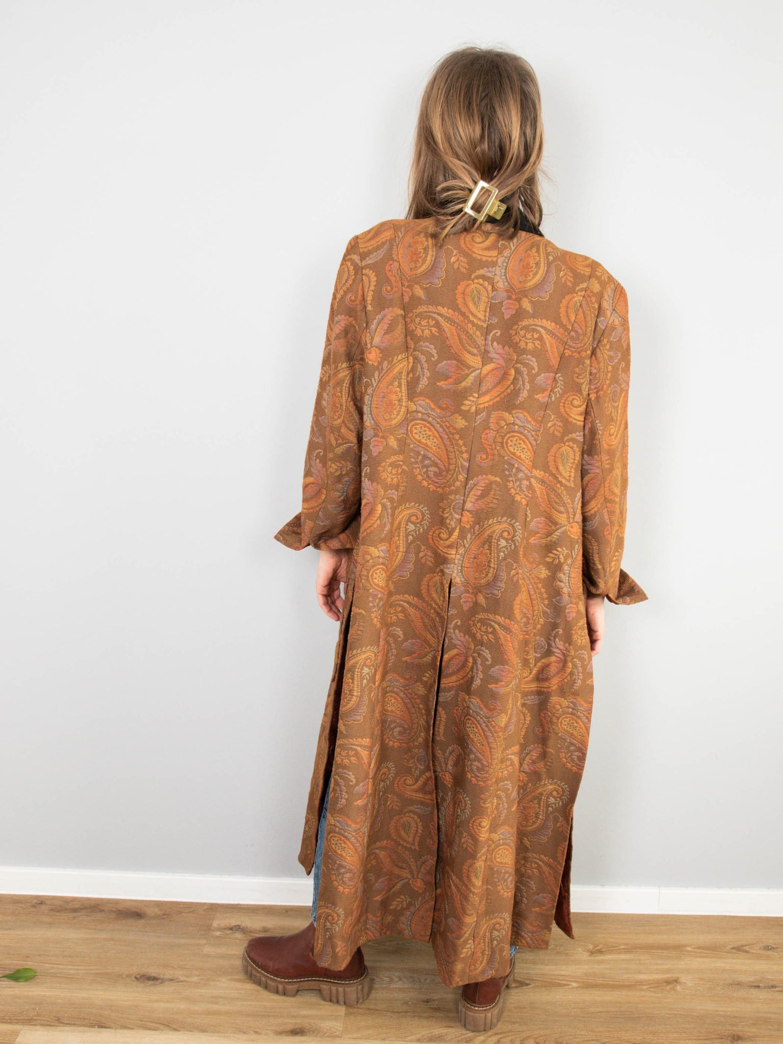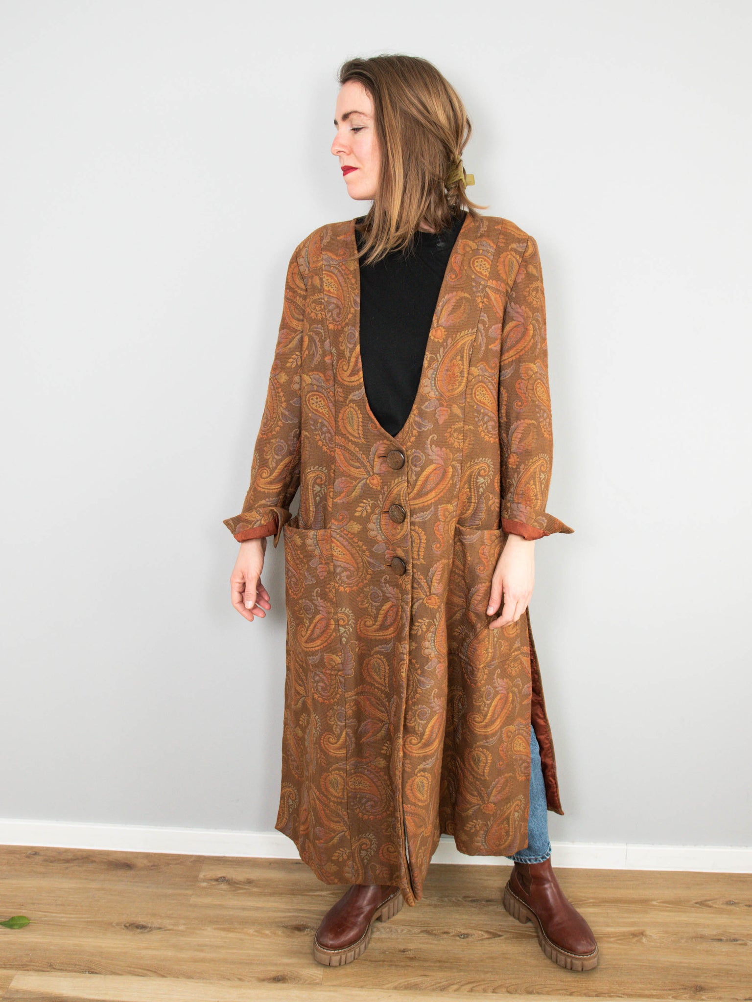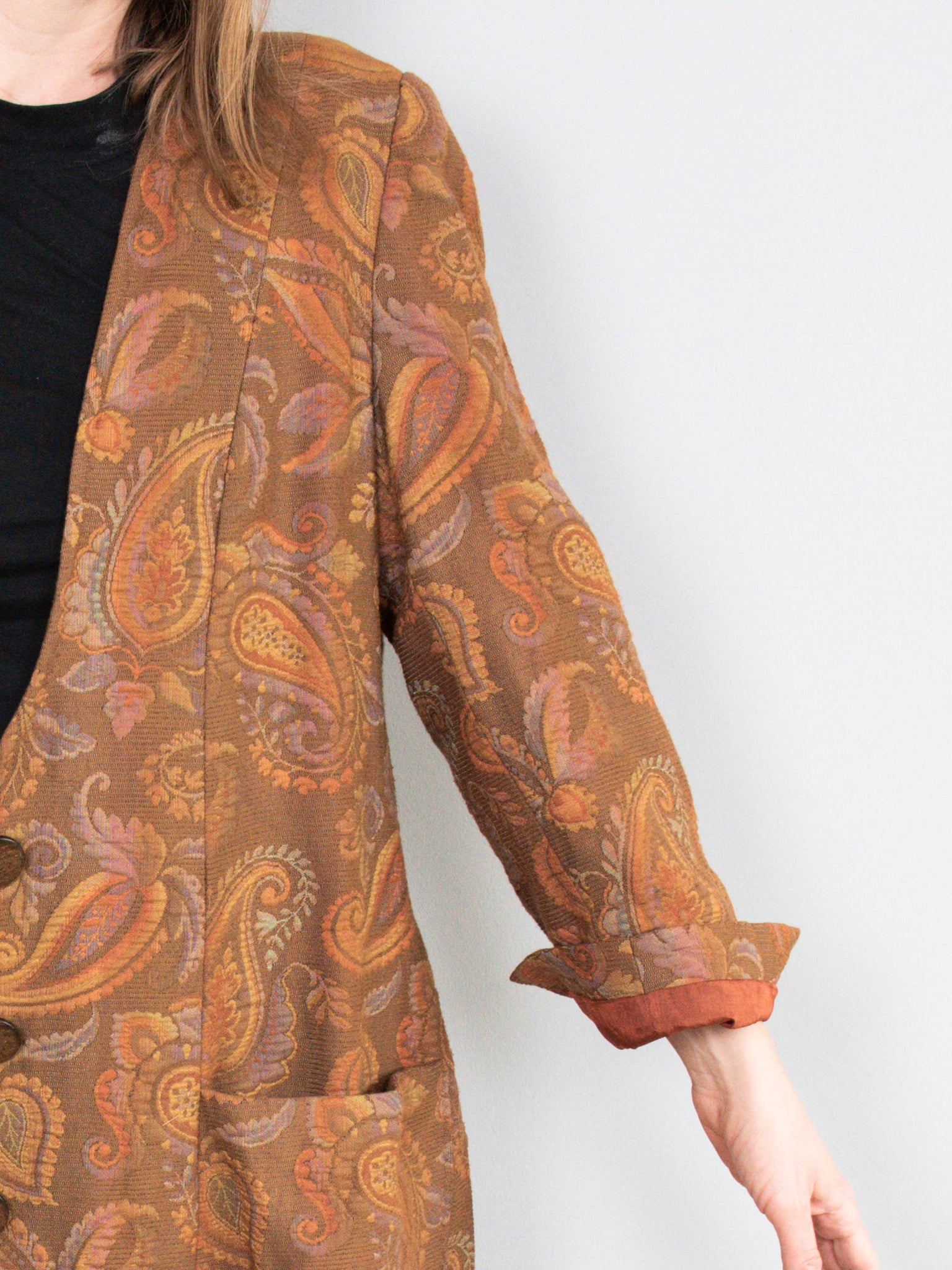Beschreibung: Ein Vintage Brokatmantel der besonderen Art! Das Unikat kommt in einem einmaligen Braunton mit Kupfernote daher, geschmückt mit einem bunten Paisleymotiv. Für einen lockeren Sitz ist der Mantel seitlich und am Rücken hoch geschlitzt. Verschließbar mit drei Knöpfen und ausgestattet mit zwei Taschen.