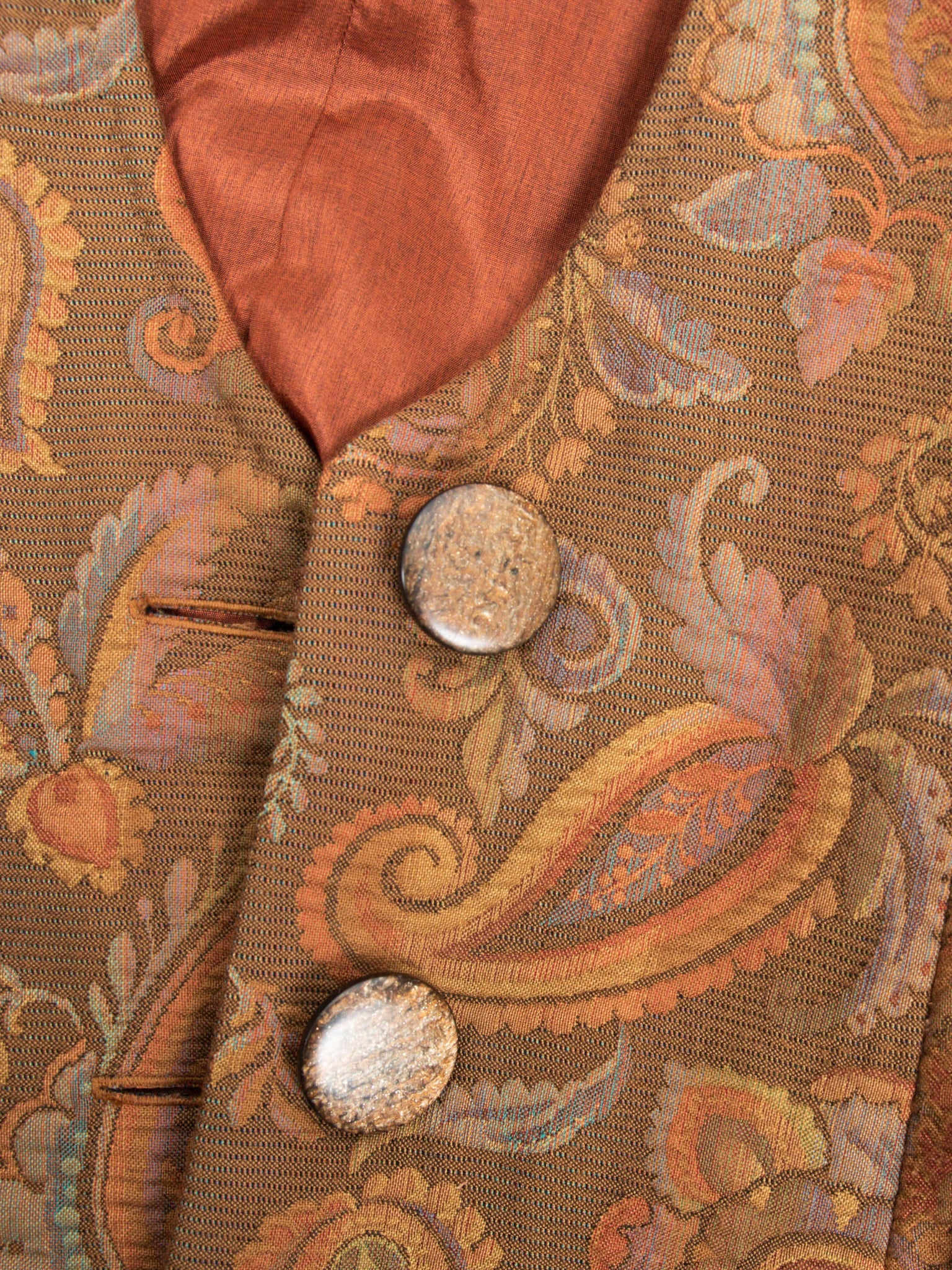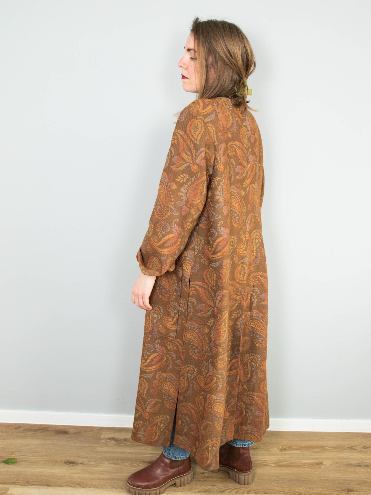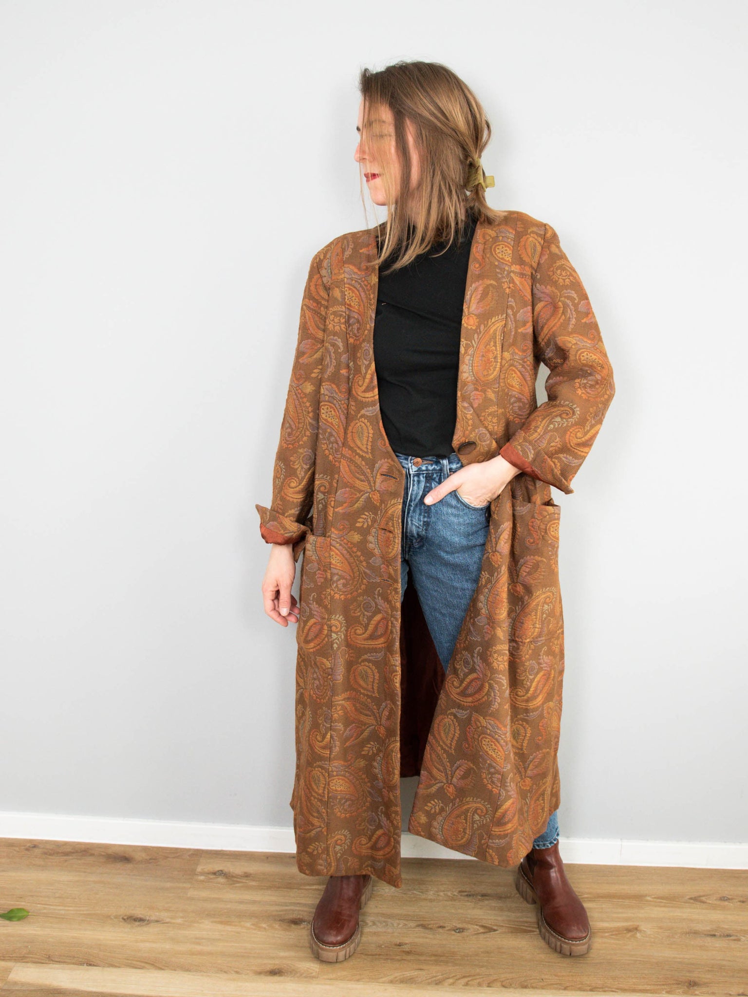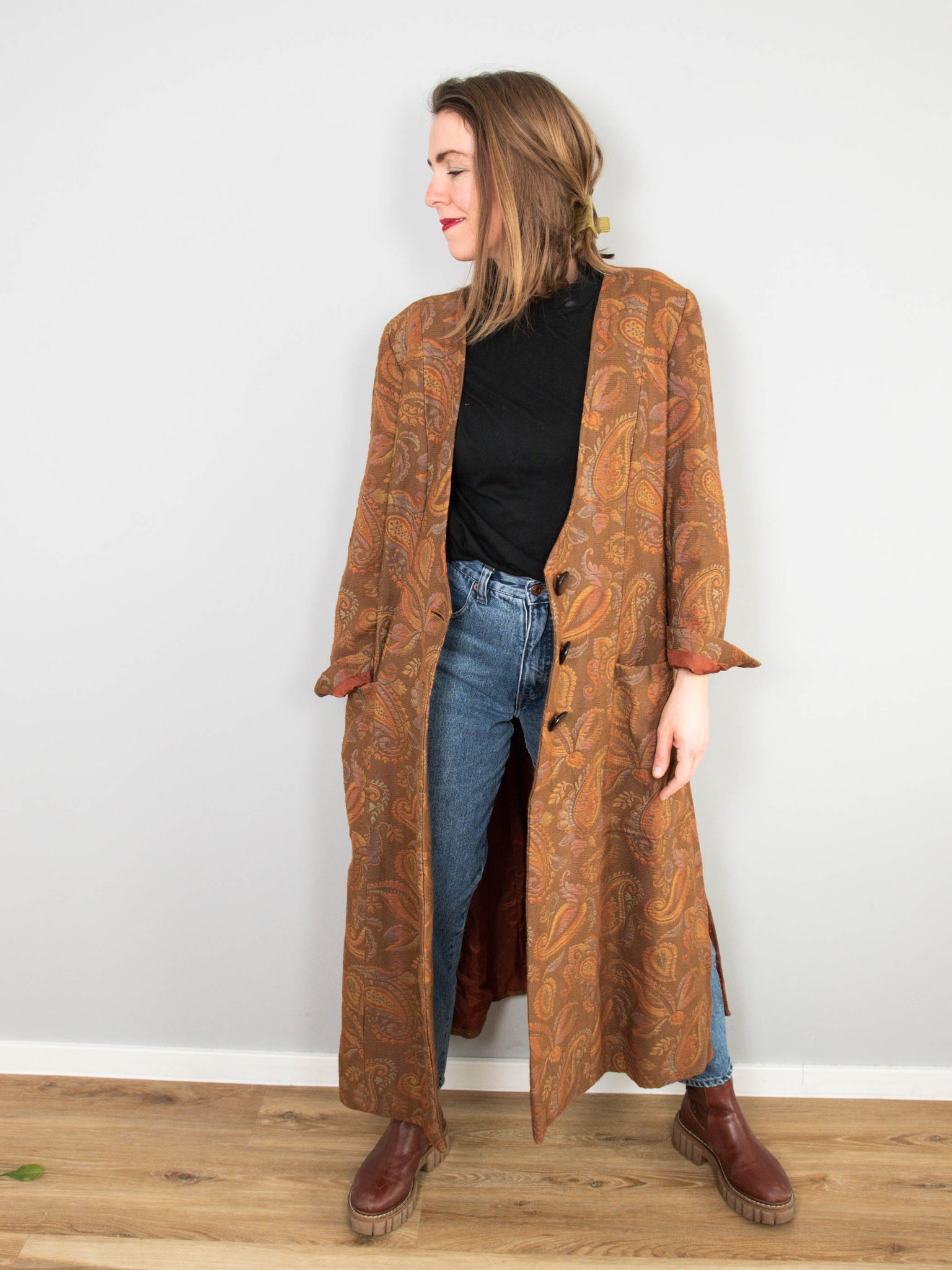 Beschreibung: Ein Vintage Brokatmantel der besonderen Art! Das Unikat kommt in einem einmaligen Braunton mit Kupfernote daher, geschmückt mit einem bunten Paisleymotiv. Für einen lockeren Sitz ist der Mantel seitlich und am Rücken hoch geschlitzt. Verschließbar mit drei Knöpfen und ausgestattet mit zwei Taschen.