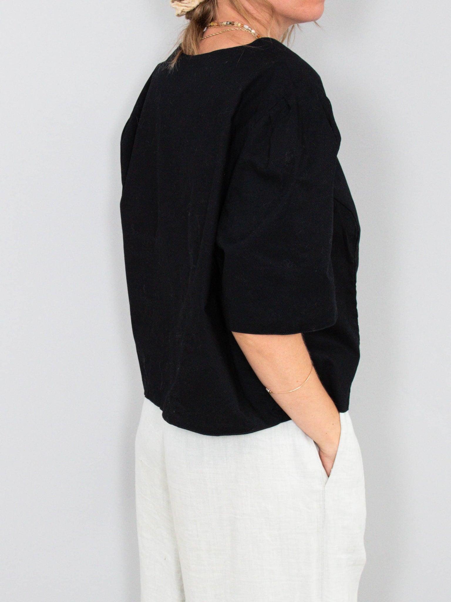 Beschreibung: Schwarze Vintage Bluse mit verkürztem Schnitt.