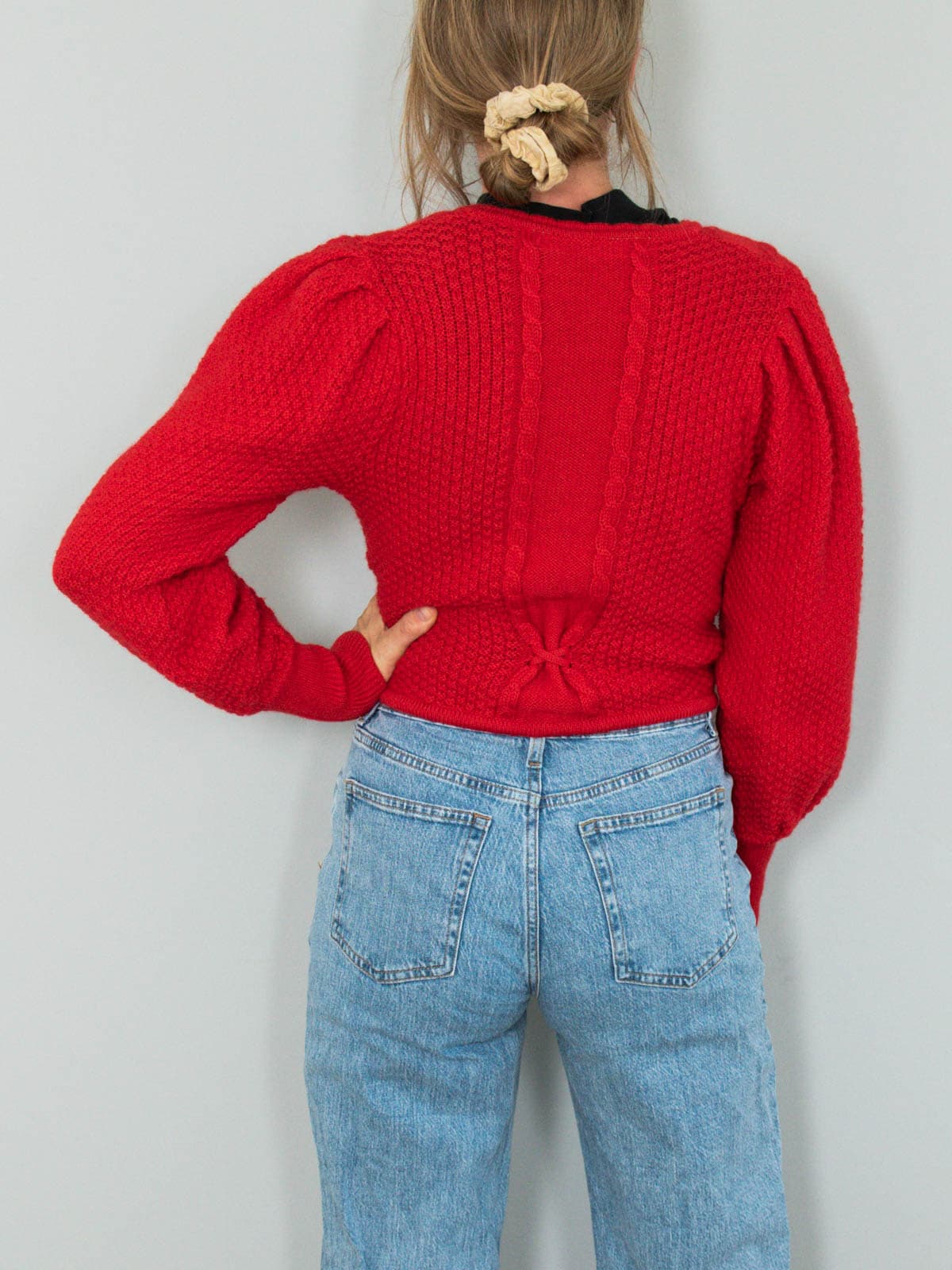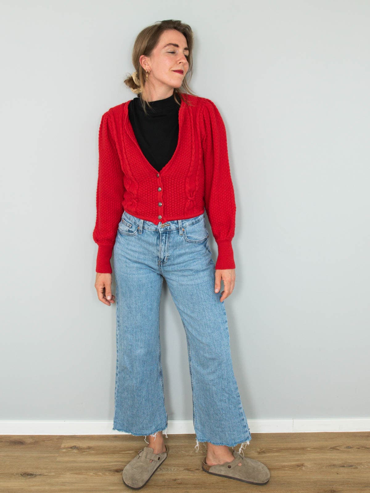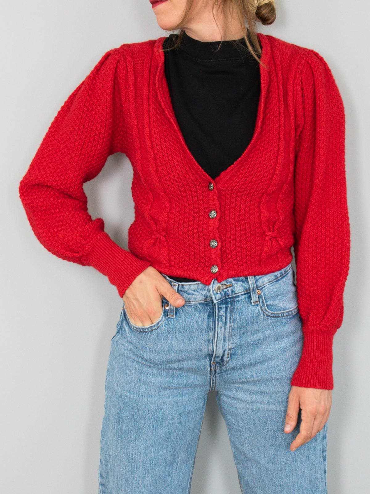 Beschreibung: Kurz geschnittene Folkore Strickjacke aus reiner Wolle.