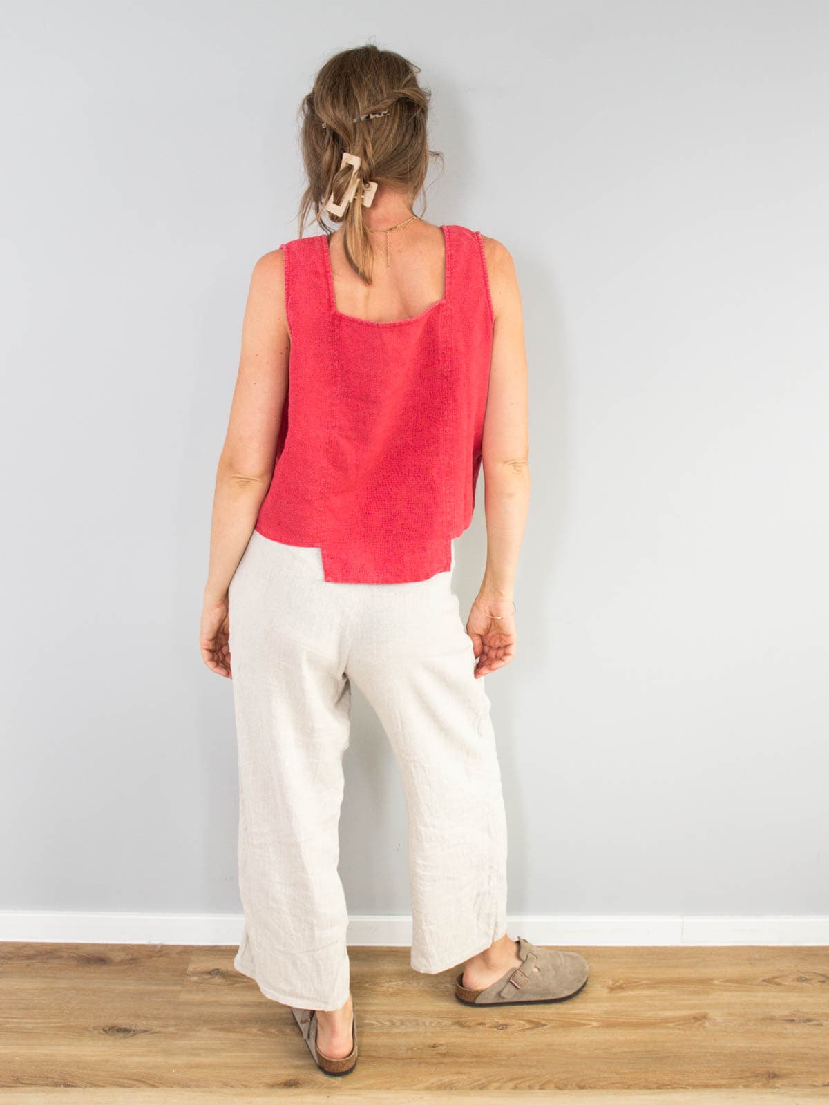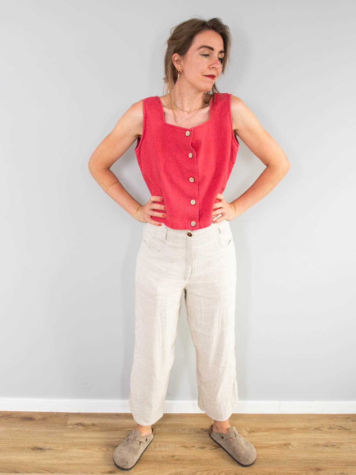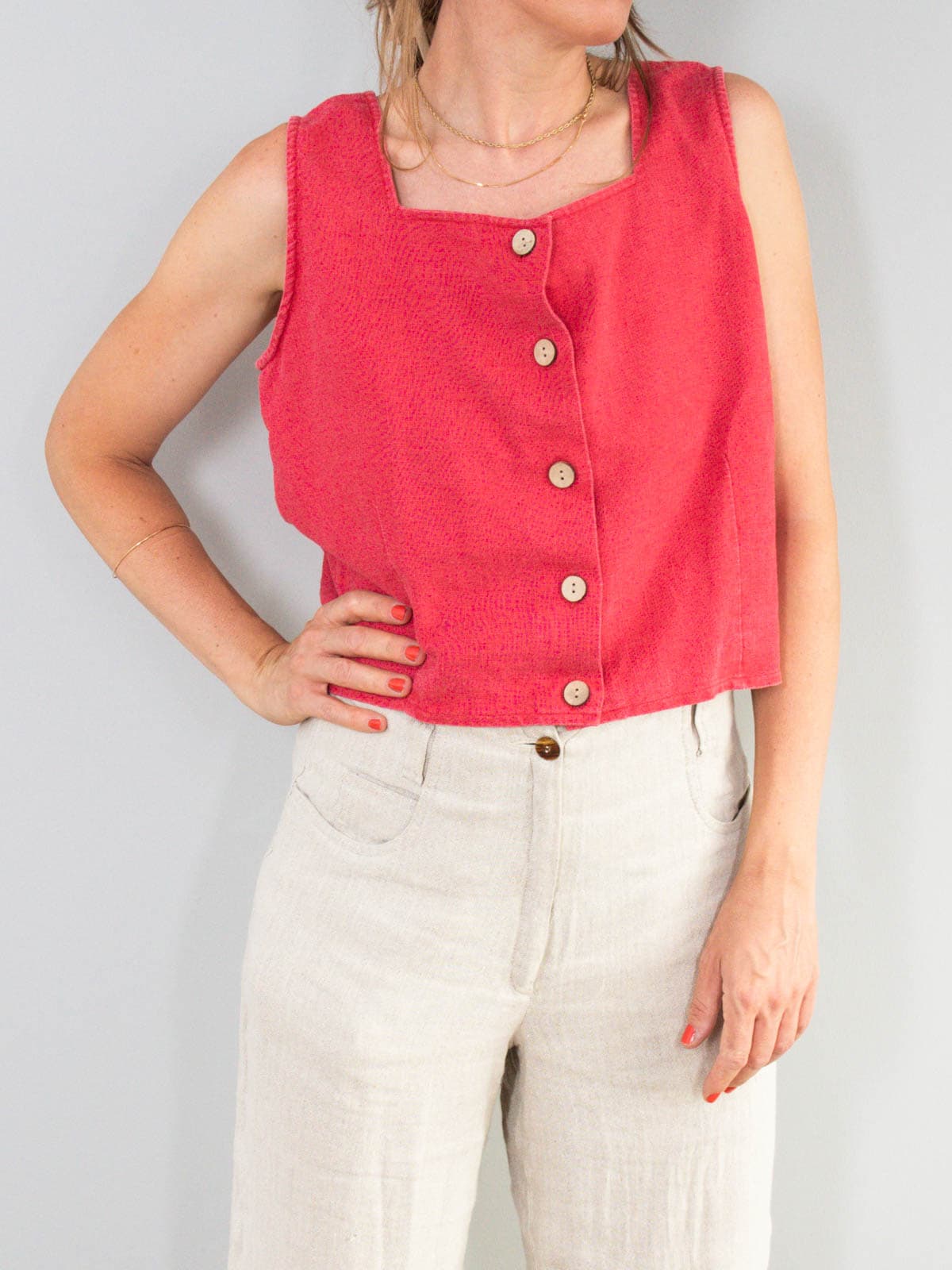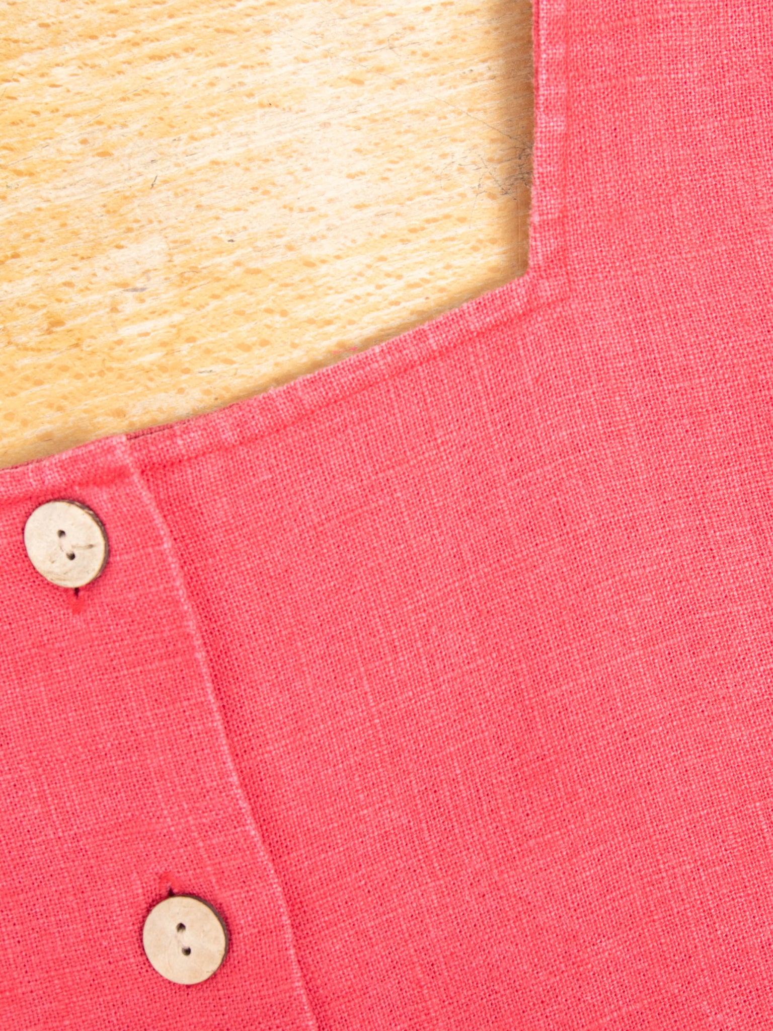 Beschreibung: Hinreißendes und kurz geschnittenes Oberteil in verwaschenem Rot. Bei dem Material Ramie handelt es sich um eine Naturfaser, die Leinen und Hanf stark ähnelt.