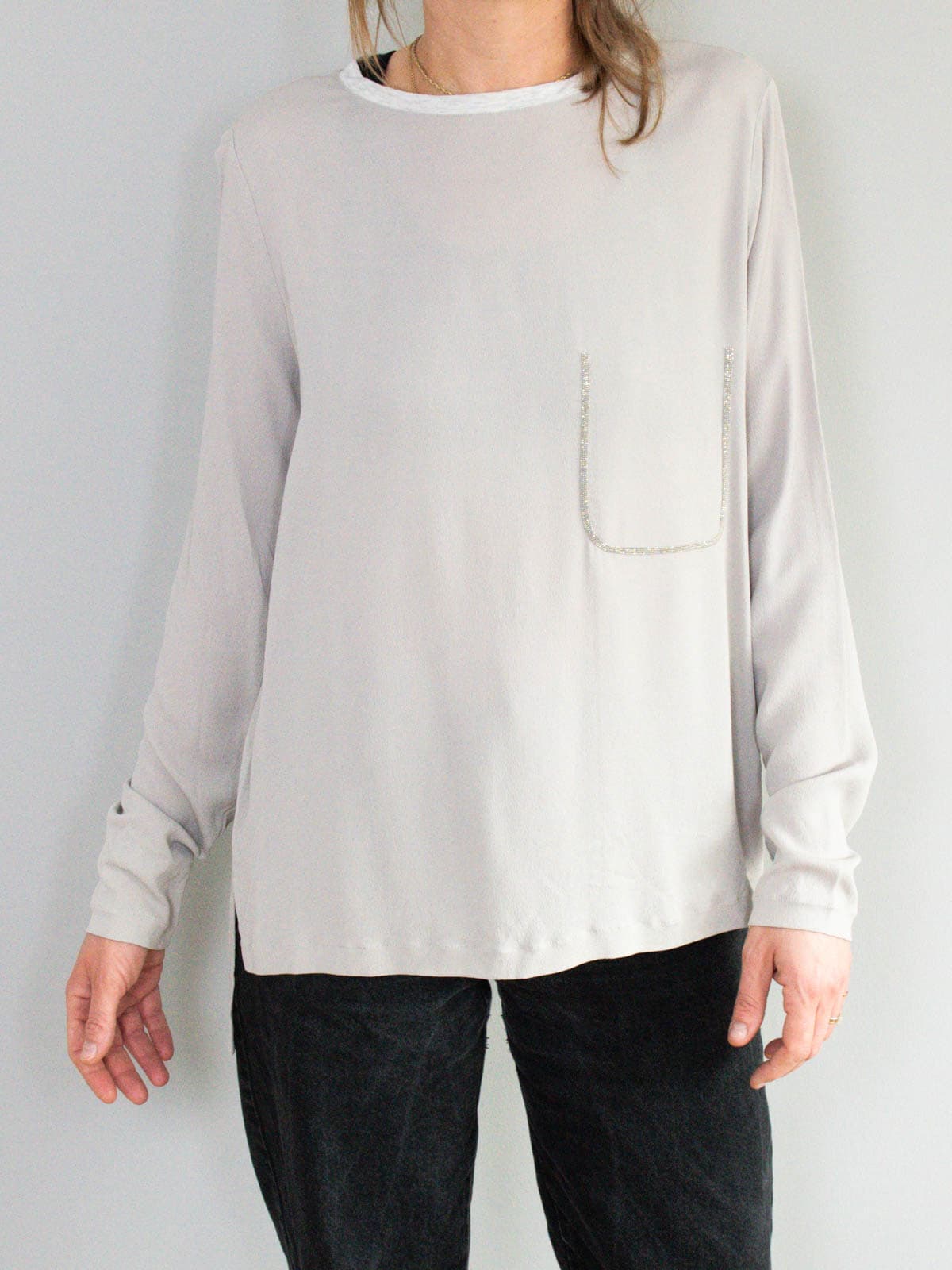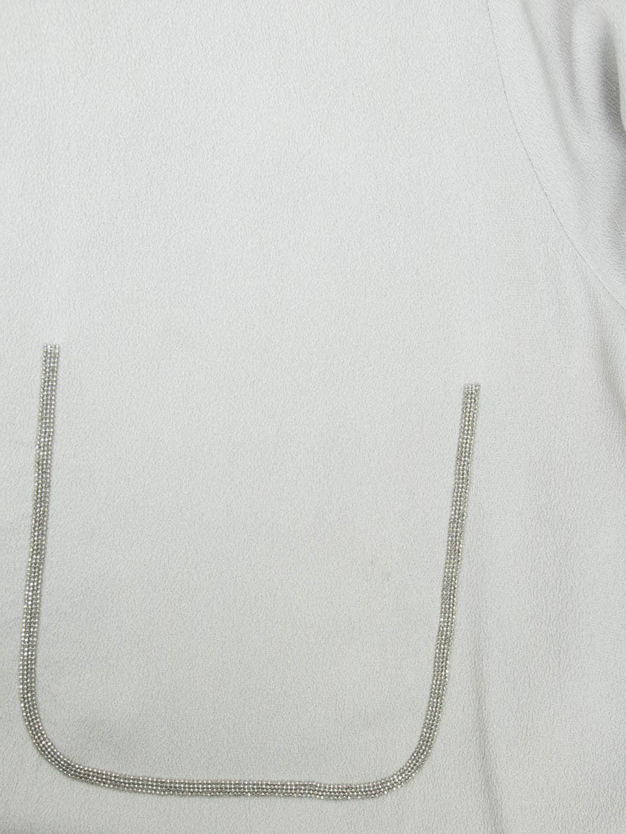 Beschreibung: Elegantes Oberteil vom italienischen Designerlabel Fabiana Filippi. Die angedeutete Brusttasche aus Schmucksteinen verleiht dem hauchdünnen Oberteil einen eleganten Touch. Ausgezeichnet ist das Designerstück als eine deutsche Größe 42/XL.