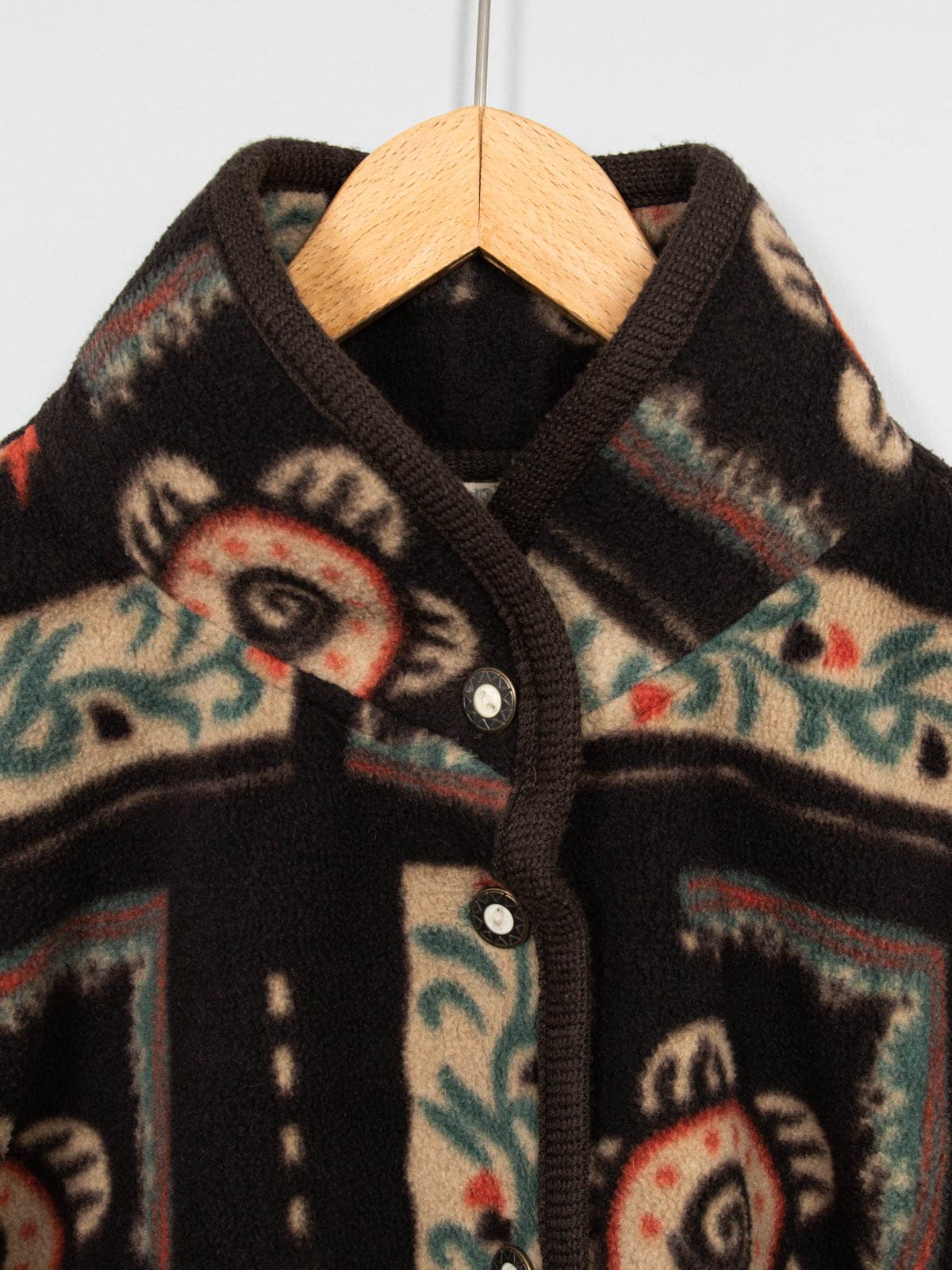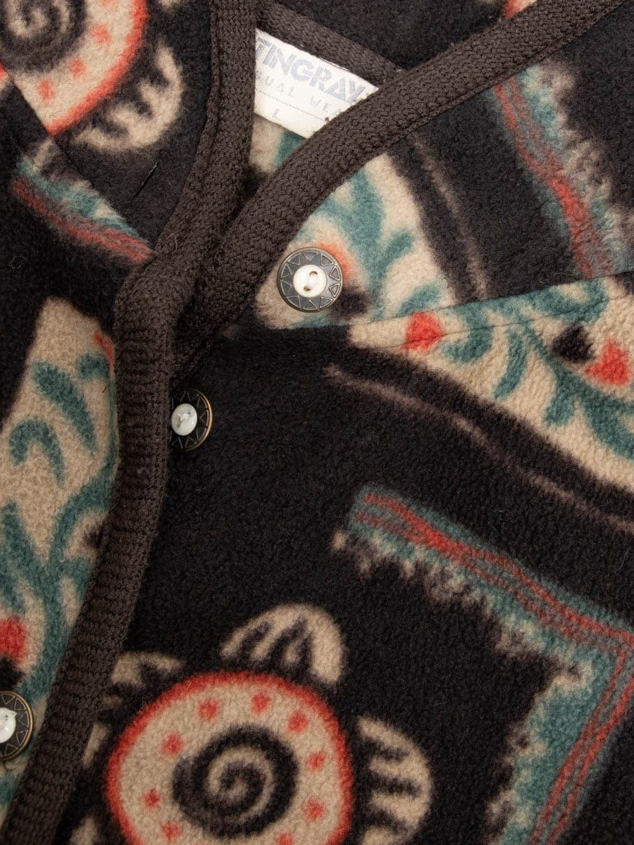 Beschreibung: Braune Vintage Fleecejacke mit bunten Motiv.