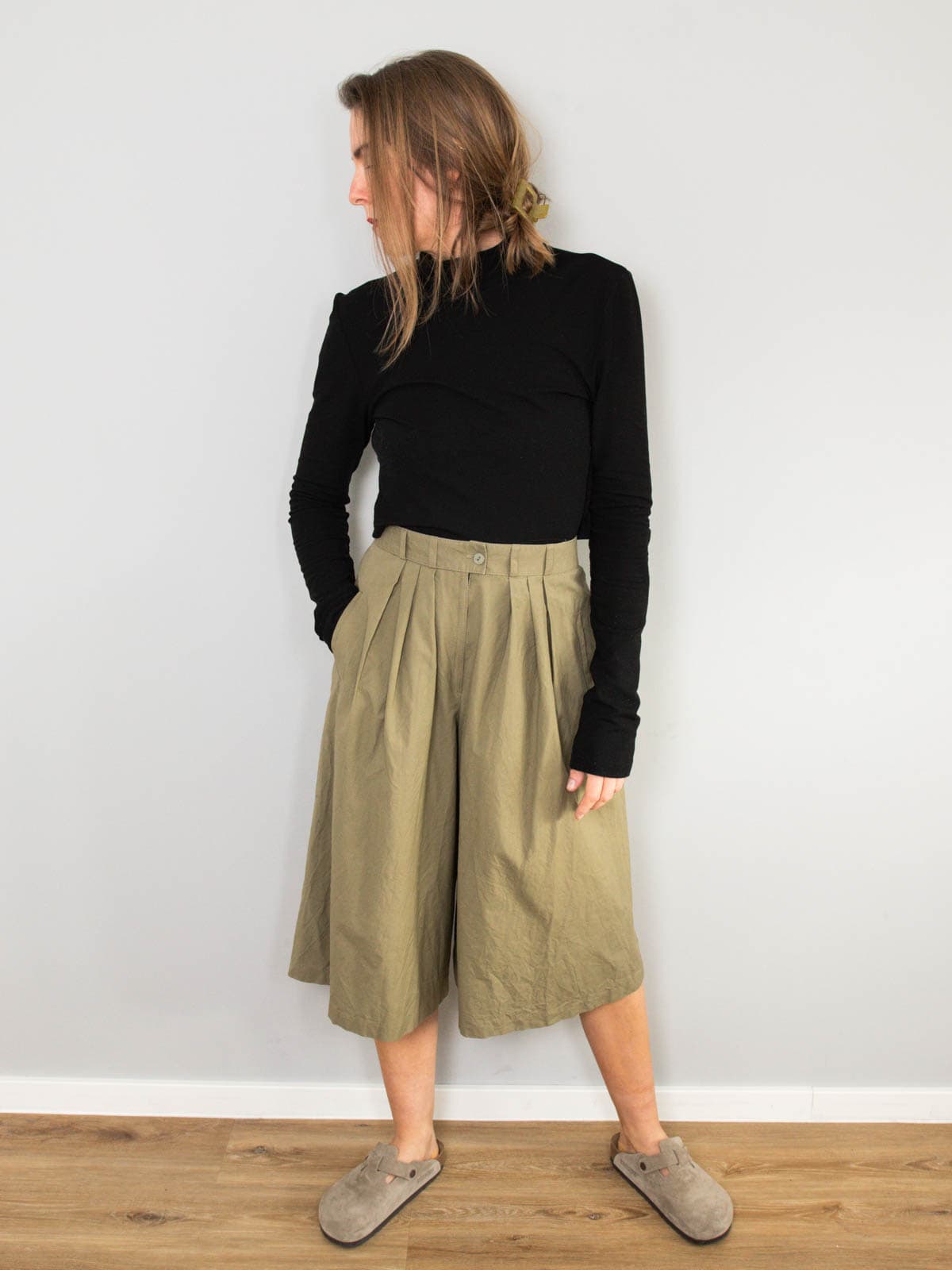 Beschreibung: High Waist Vintage Hosenrock in Dreiviertellänge. Ausgestattet mit zwei Seitentaschen.