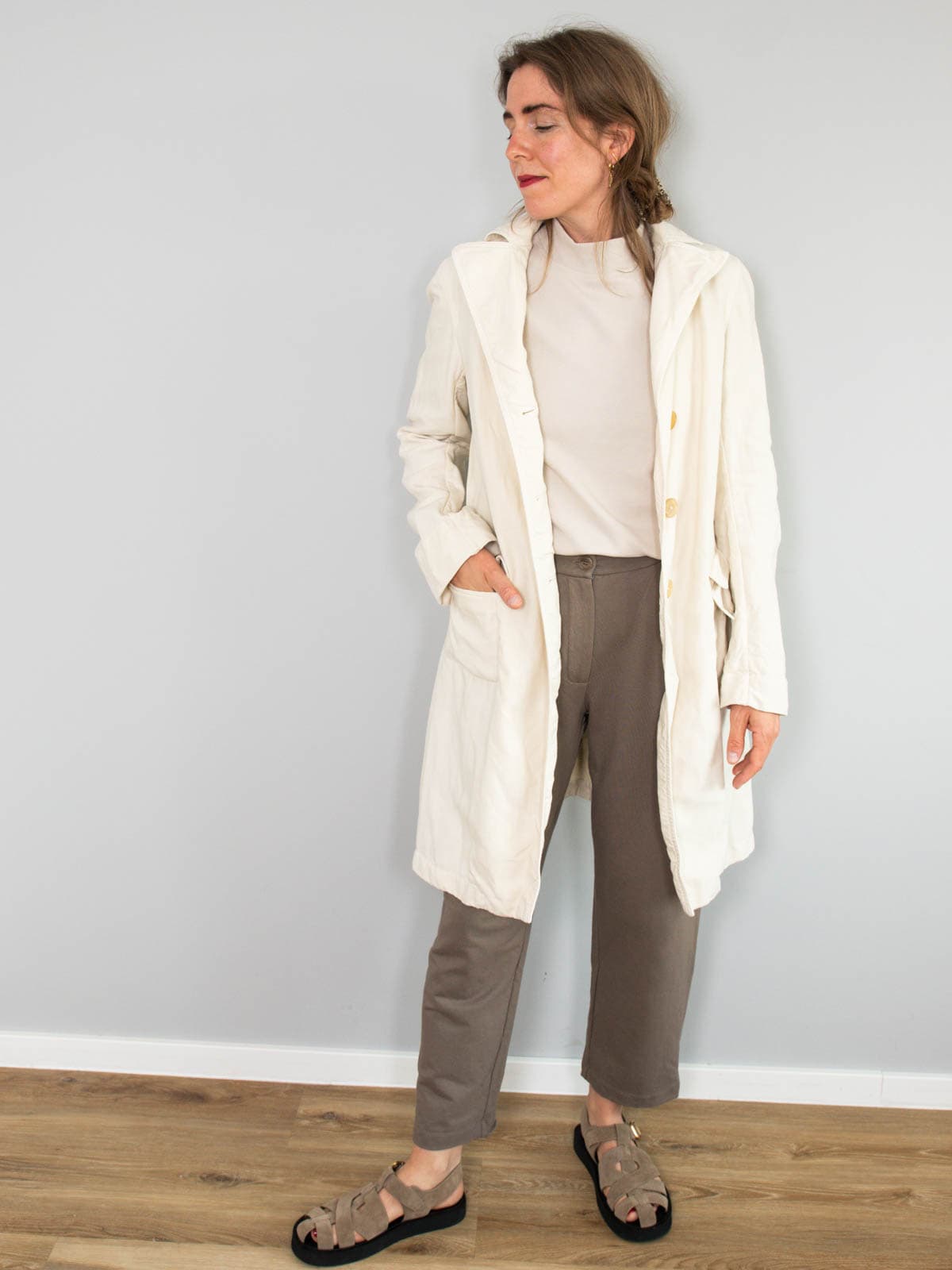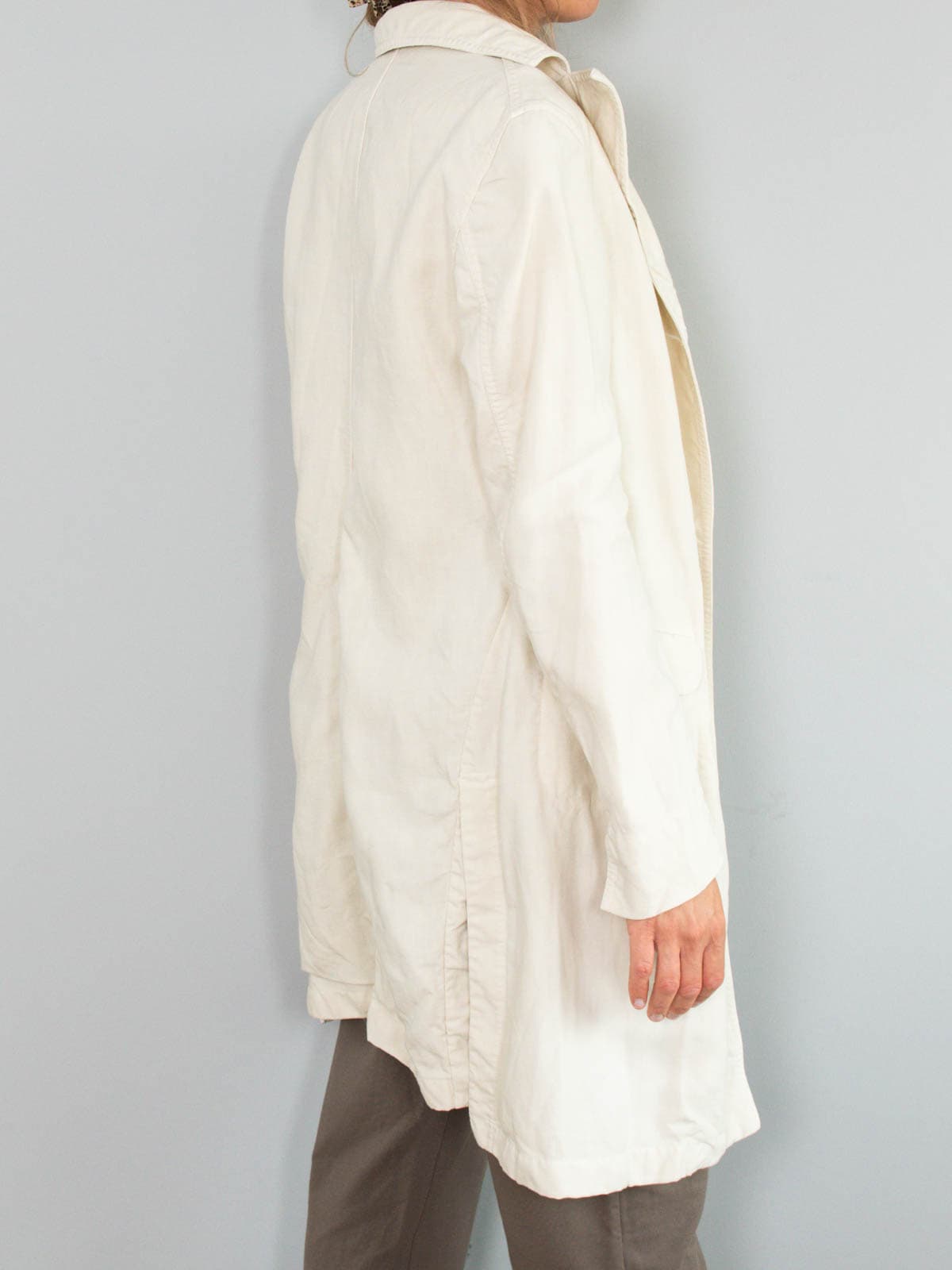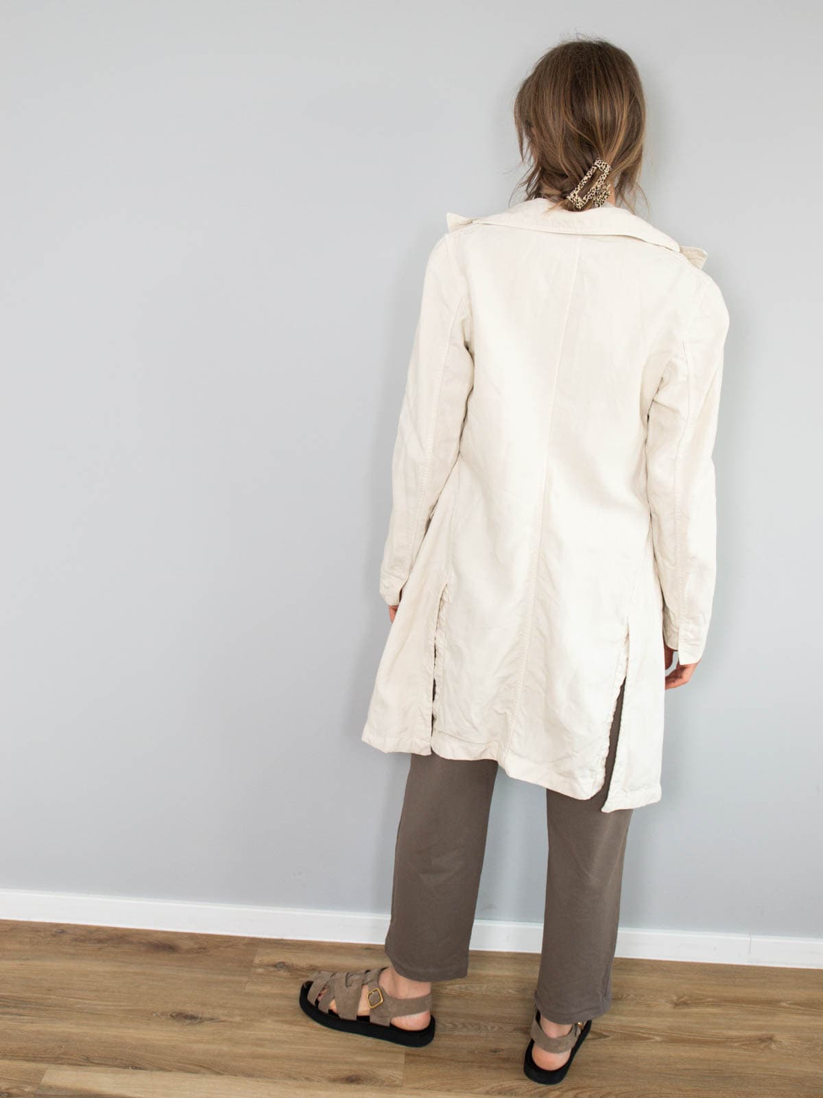 Beschreibung: Zeitlos, elegant und minimalistisch - das ist die Mode, mit der sich Jil Sander als bekannteste deutsche Designerin ihren Namen gemacht hat. Mit der Geburt des Minimalismus und ihrer puristischen Mode konnte Jil Sander mit ihren androgynen Schnitte in den 90er Jahren ihre größten Erfolge verzeichnen. Der cremefarbene Leinenmantel ist mit drei Taschen ausgestattet.