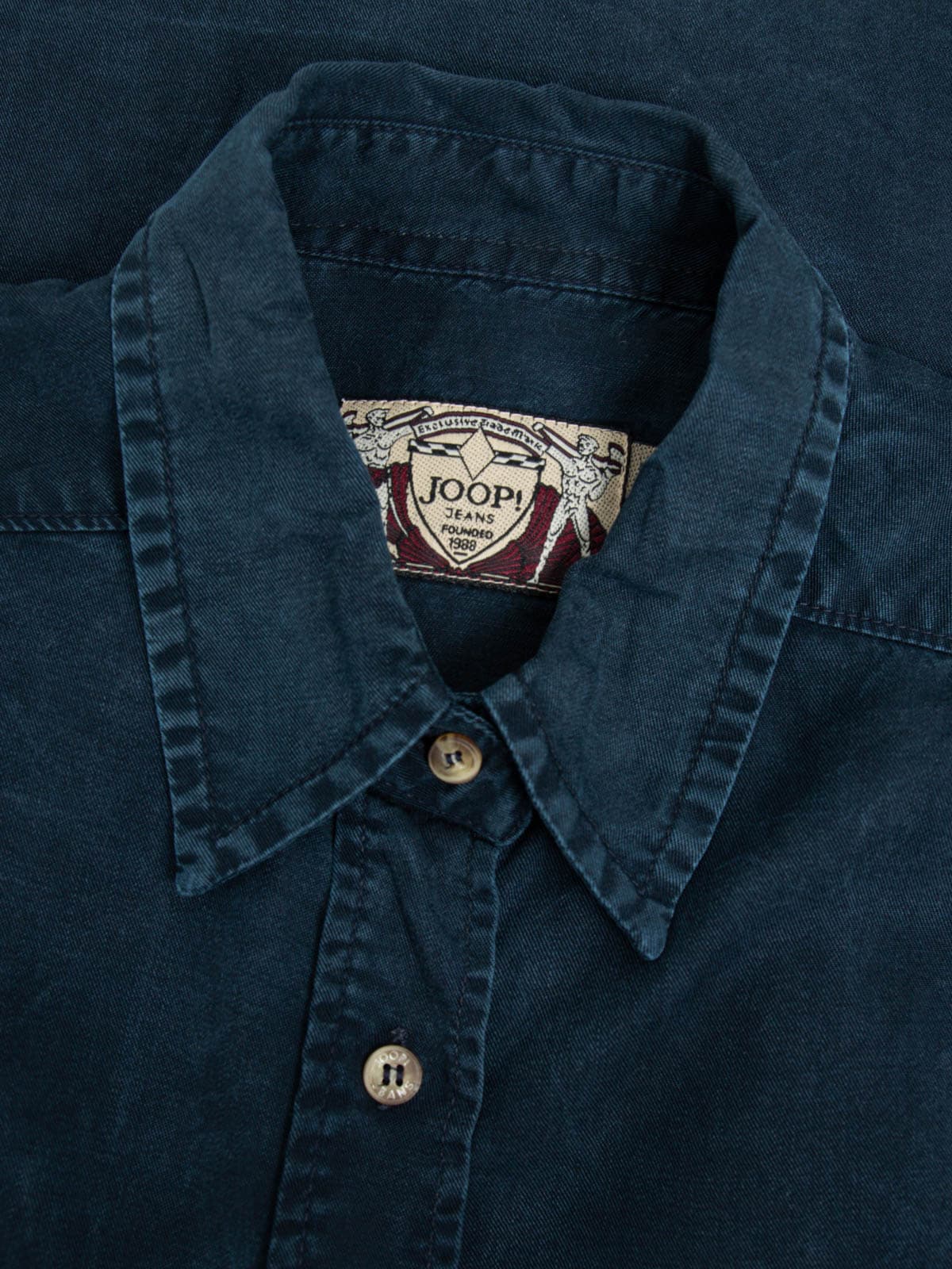 Beschreibung: Kurz geschnittenes, dunkelblaues Vintage Jeanshemd aus tollem Material vom Designerlabel Joop!. Auf der linken Brusttasche ist der Schriftzug eingestickt.