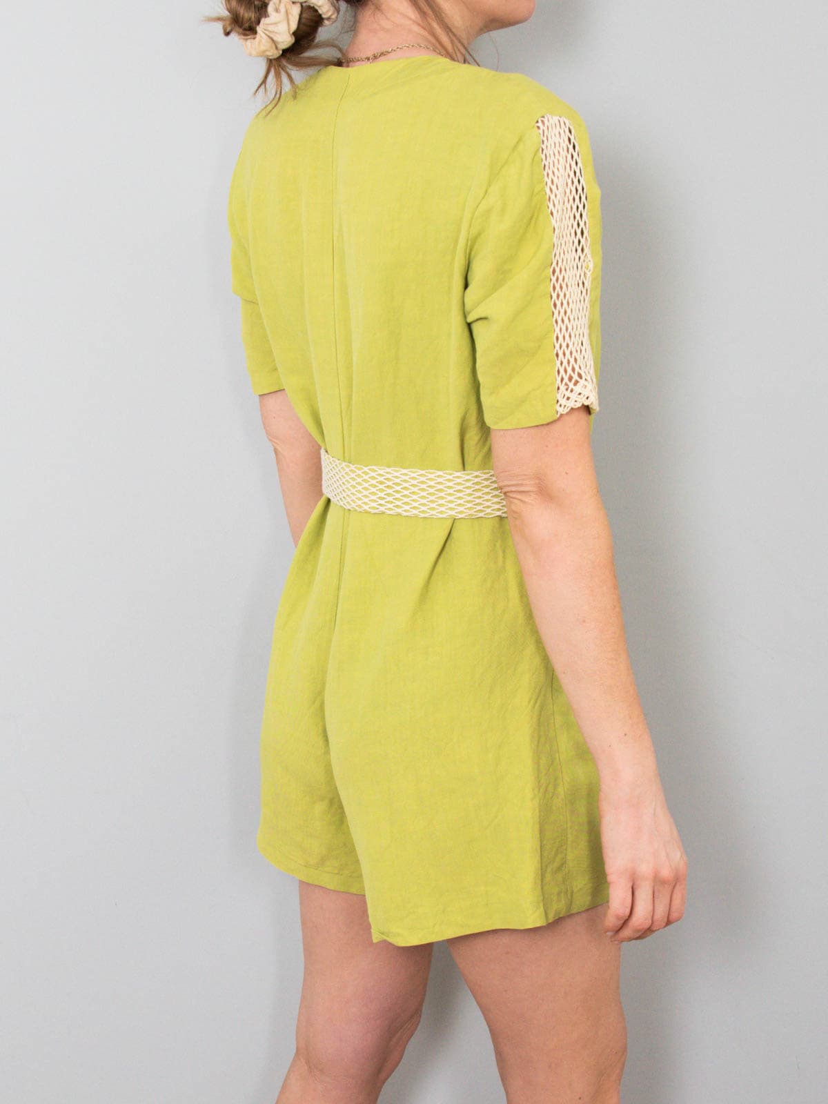 Beschreibung: Ausgefallener Vintage Jumpsuit aus Leinen in Grün. Ausgestattet mit zwei Seitentaschen. Im Idealfall ist die neue Besitzerin unter 165 cm groß, um ein Kneifen im Schritt zu vermeiden.