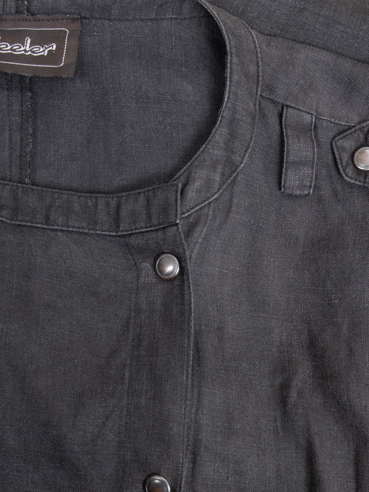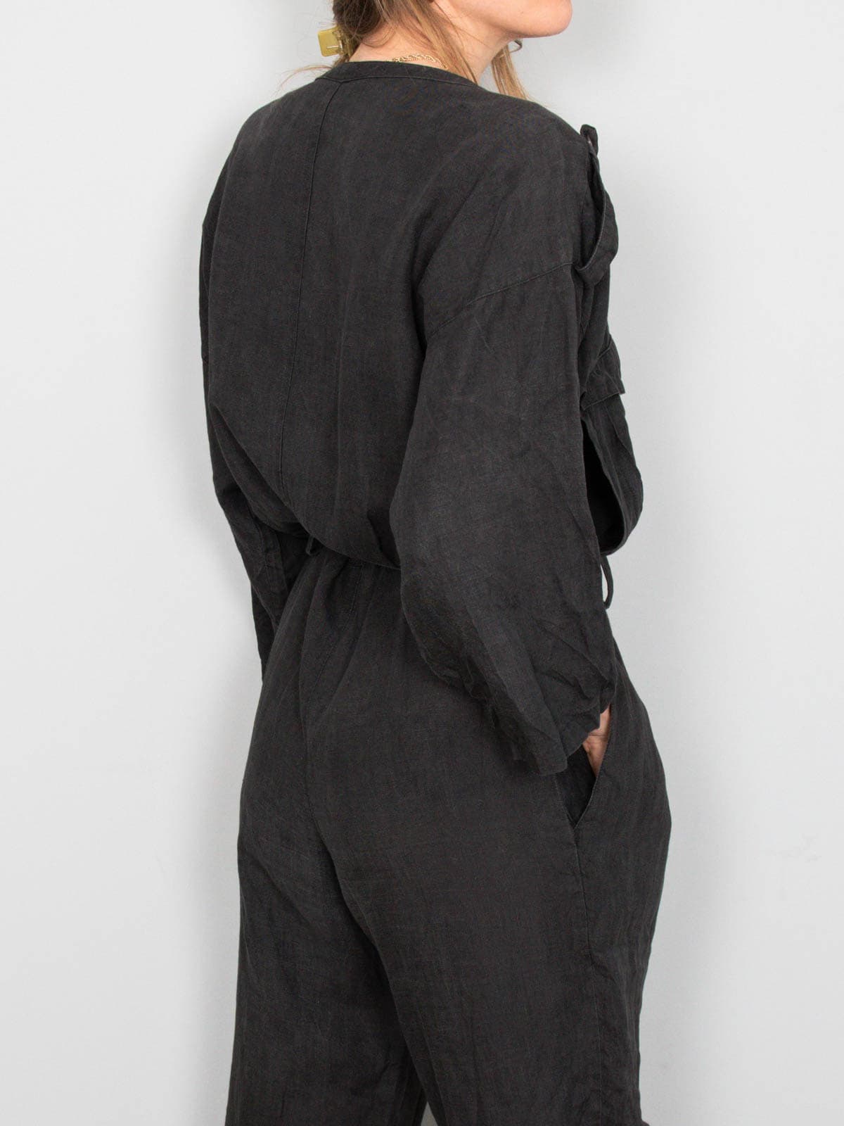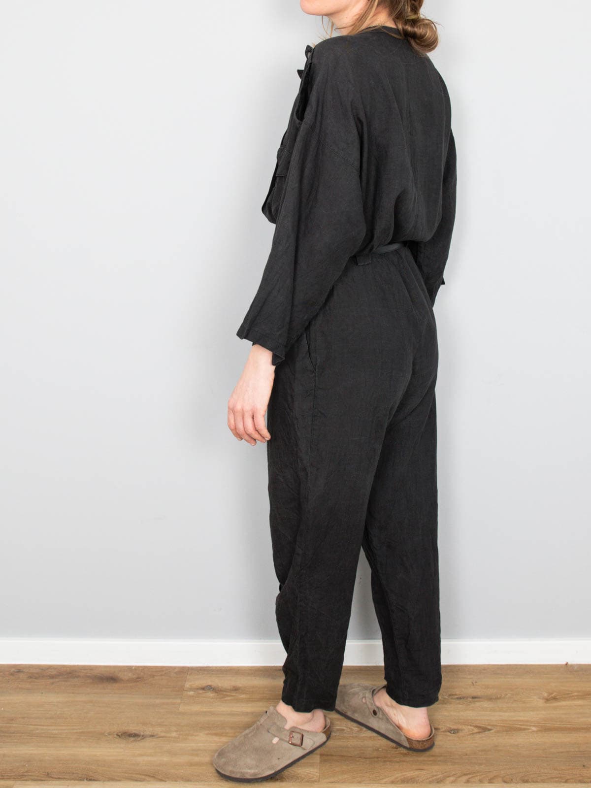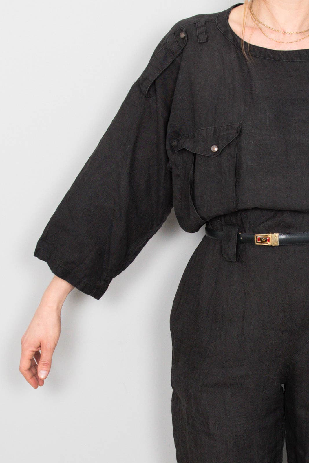 Beschreibung: Schwarzer Vintage Jumpsuit aus Leinen, verschließbar mit Druckknöpfen und ausgestattet mit zwei Seitentaschen.