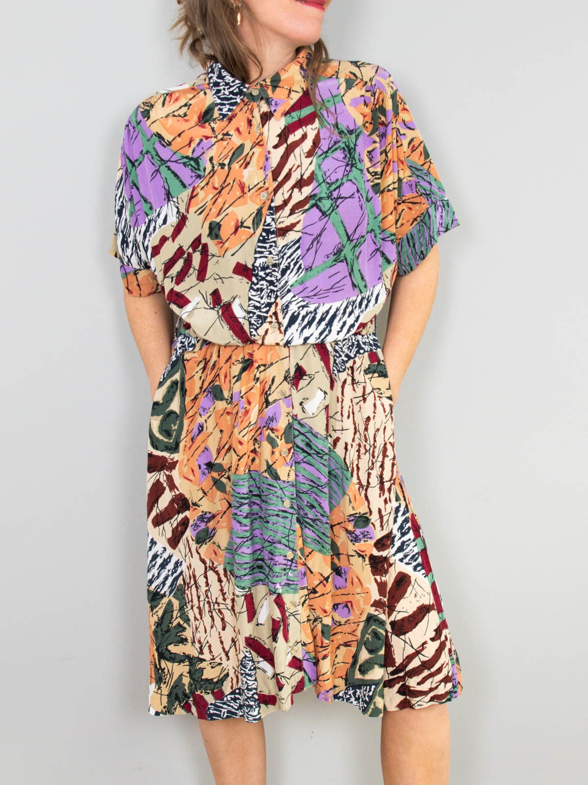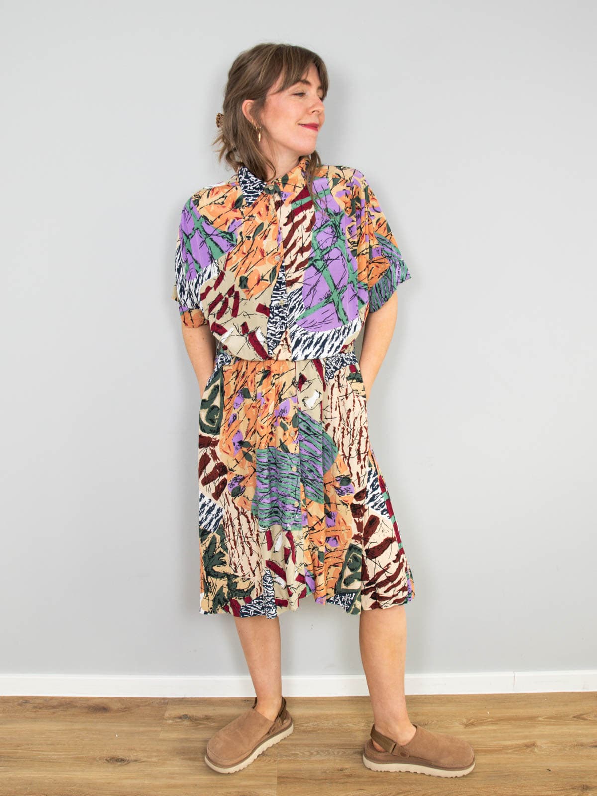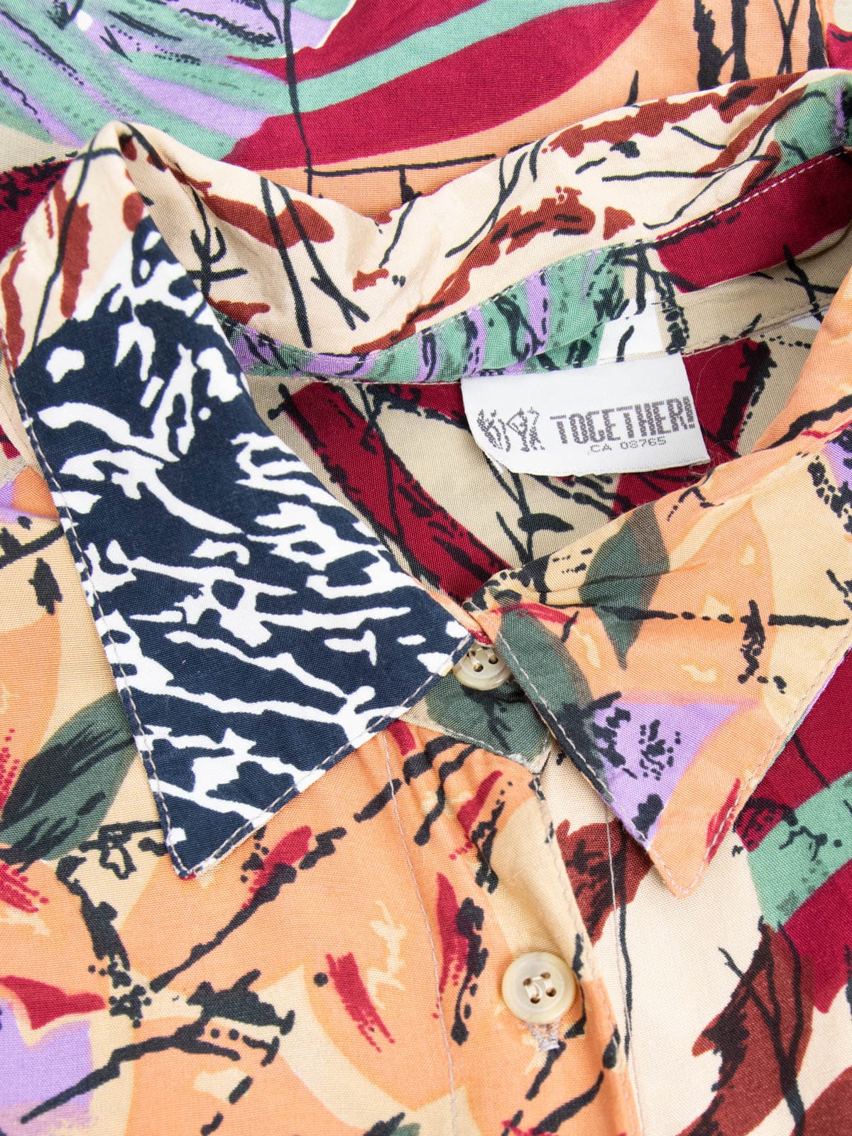 Beschreibung: Fließendes und dünnes Vintage Oberteil mit weitem Armschnitt und sommerlicher Farbgebung aus den 90er Jahren.