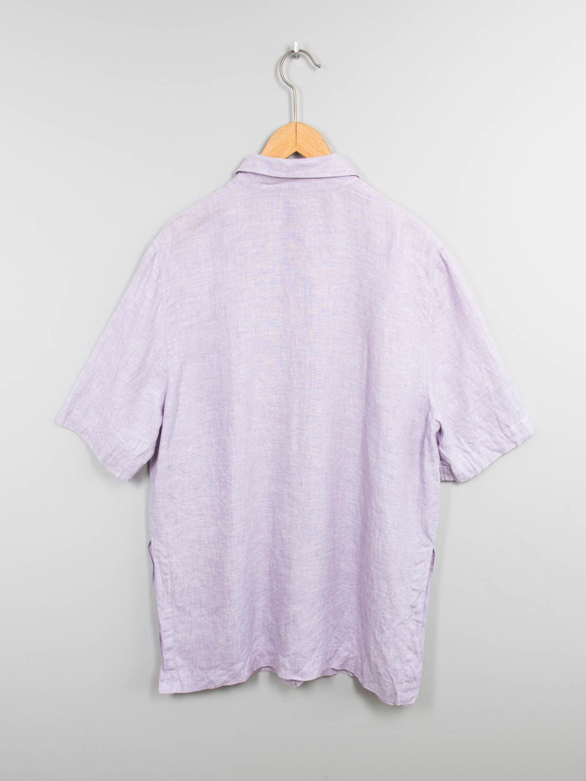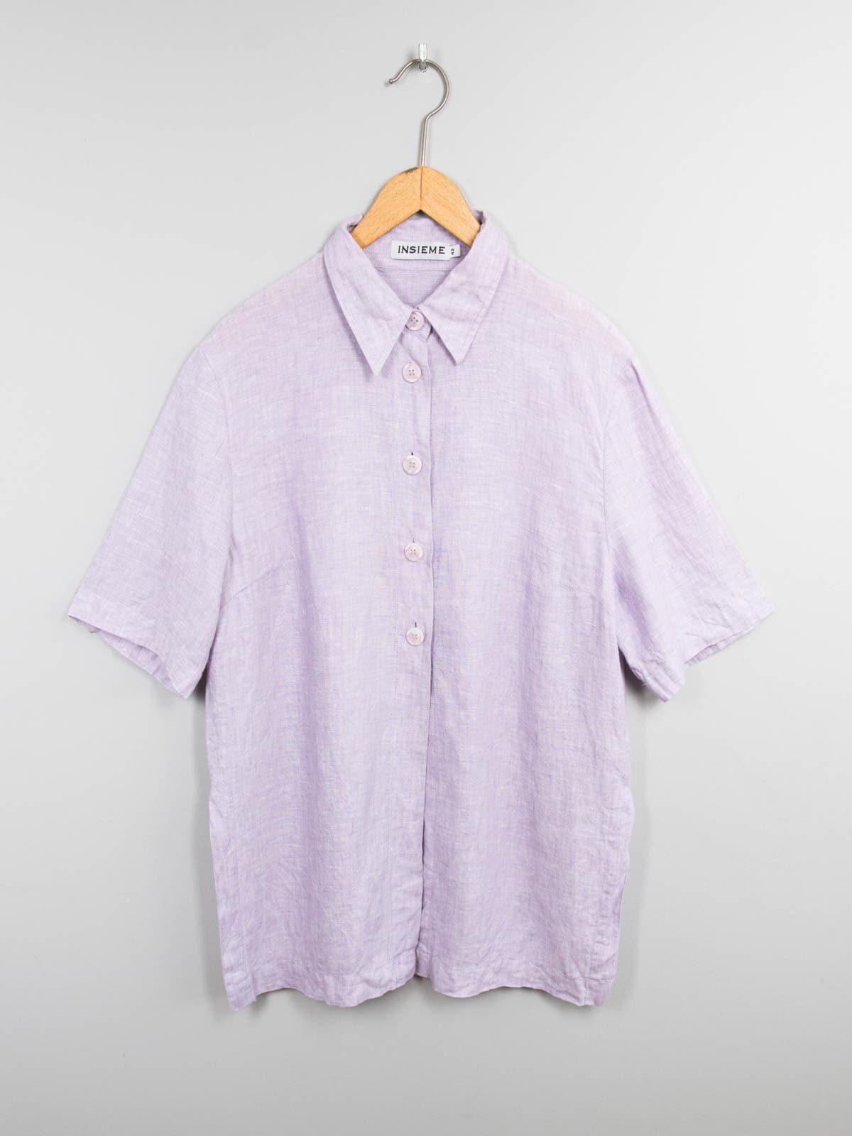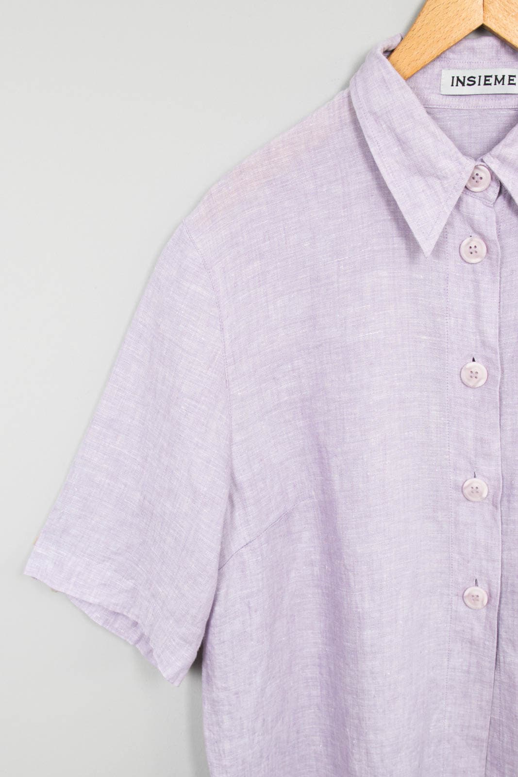 Beschreibung: Fliederfarbene Vintage Bluse aus Leinen. Die Knopfleiste endet ca. auf halber Höhe und die Bluse ist seitlich geschlitzt.