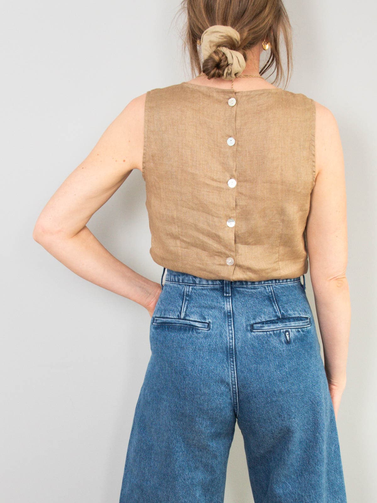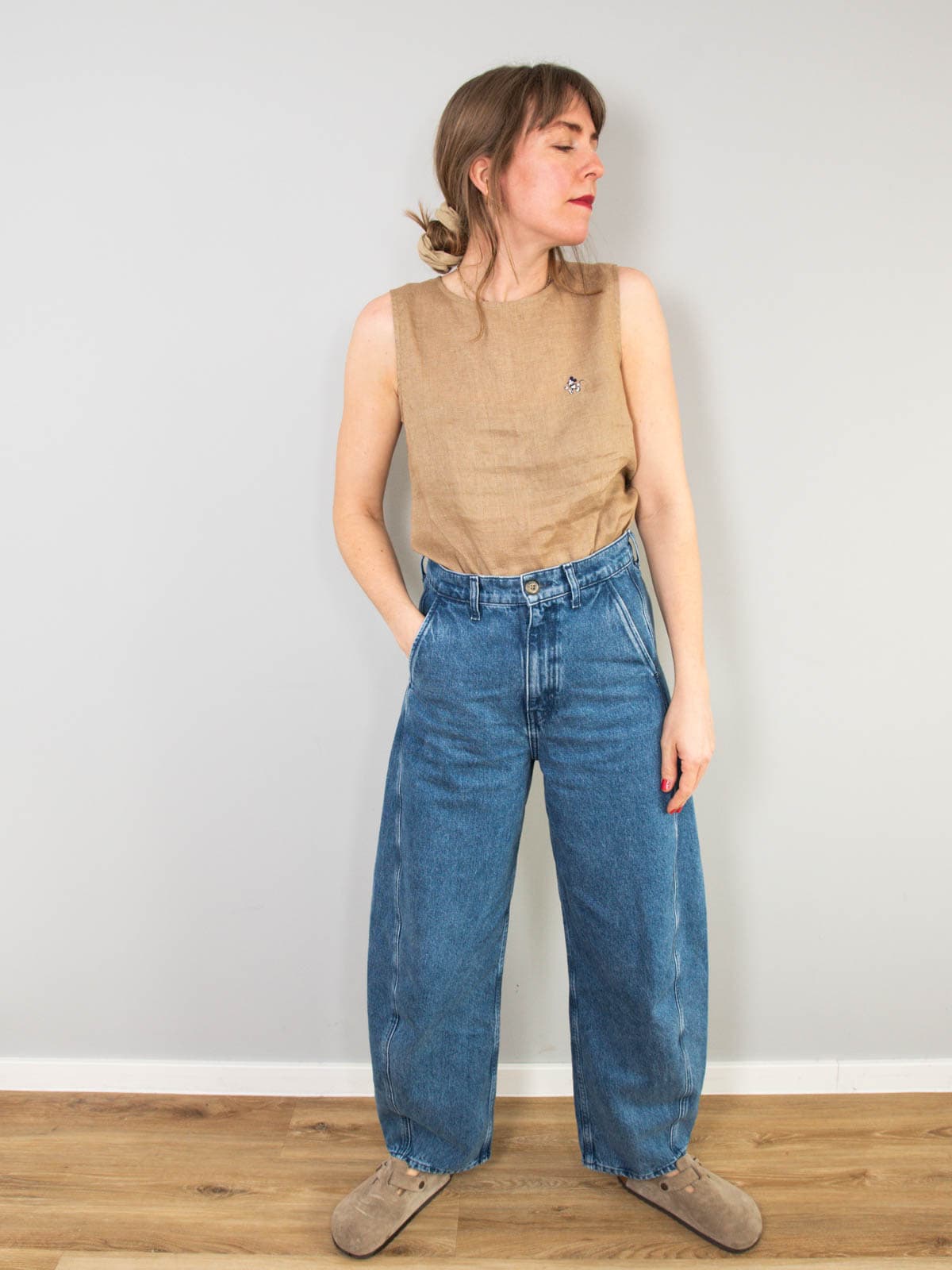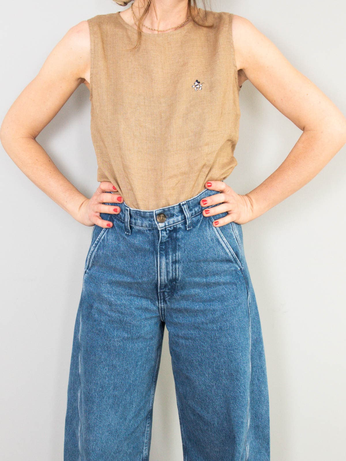 Beschreibung: Beigefarbenes Leinentop mit Mickey Mouse Stickerei. Verschließbar mit durchgehender Knopfleiste am Rücken.