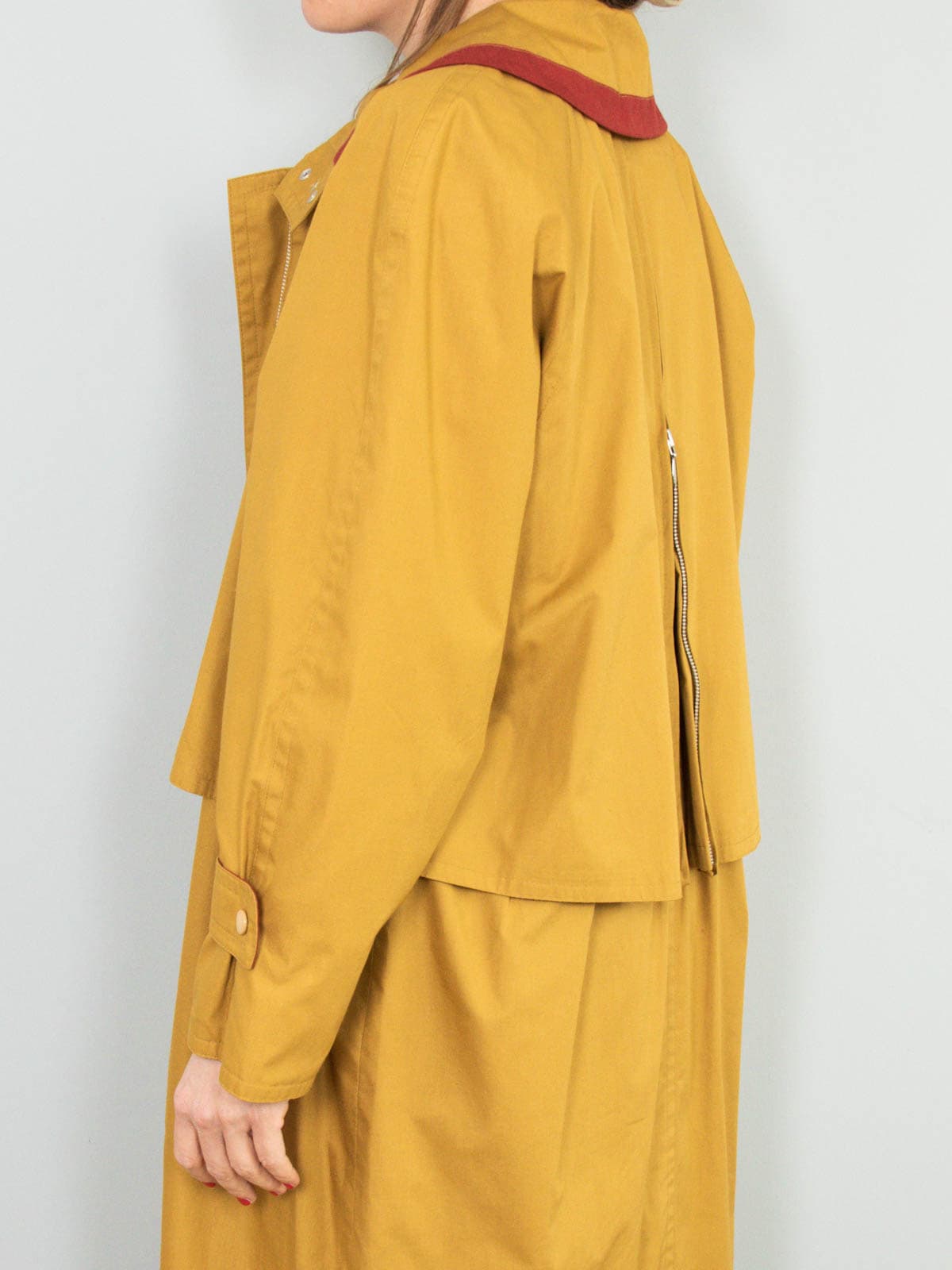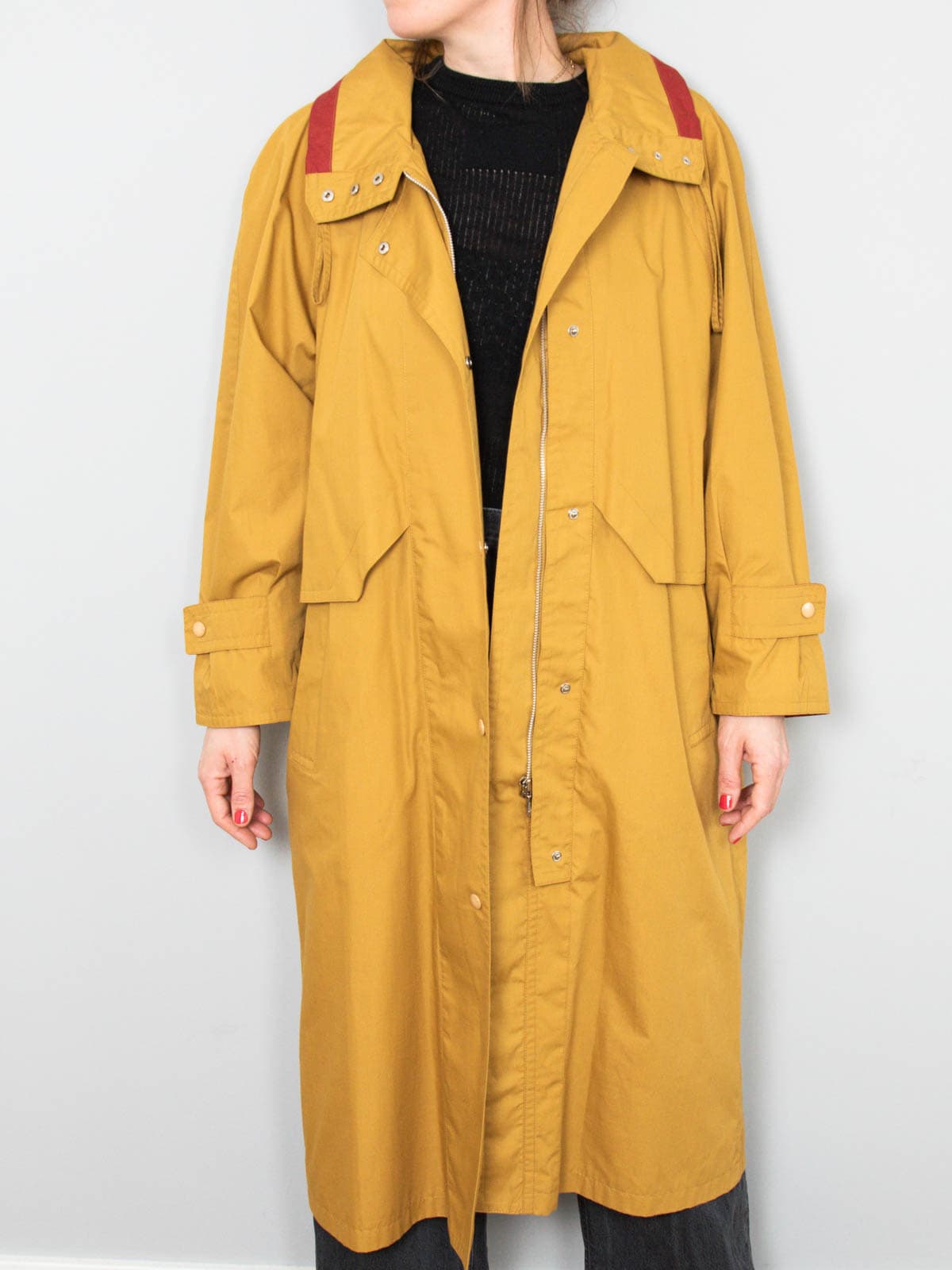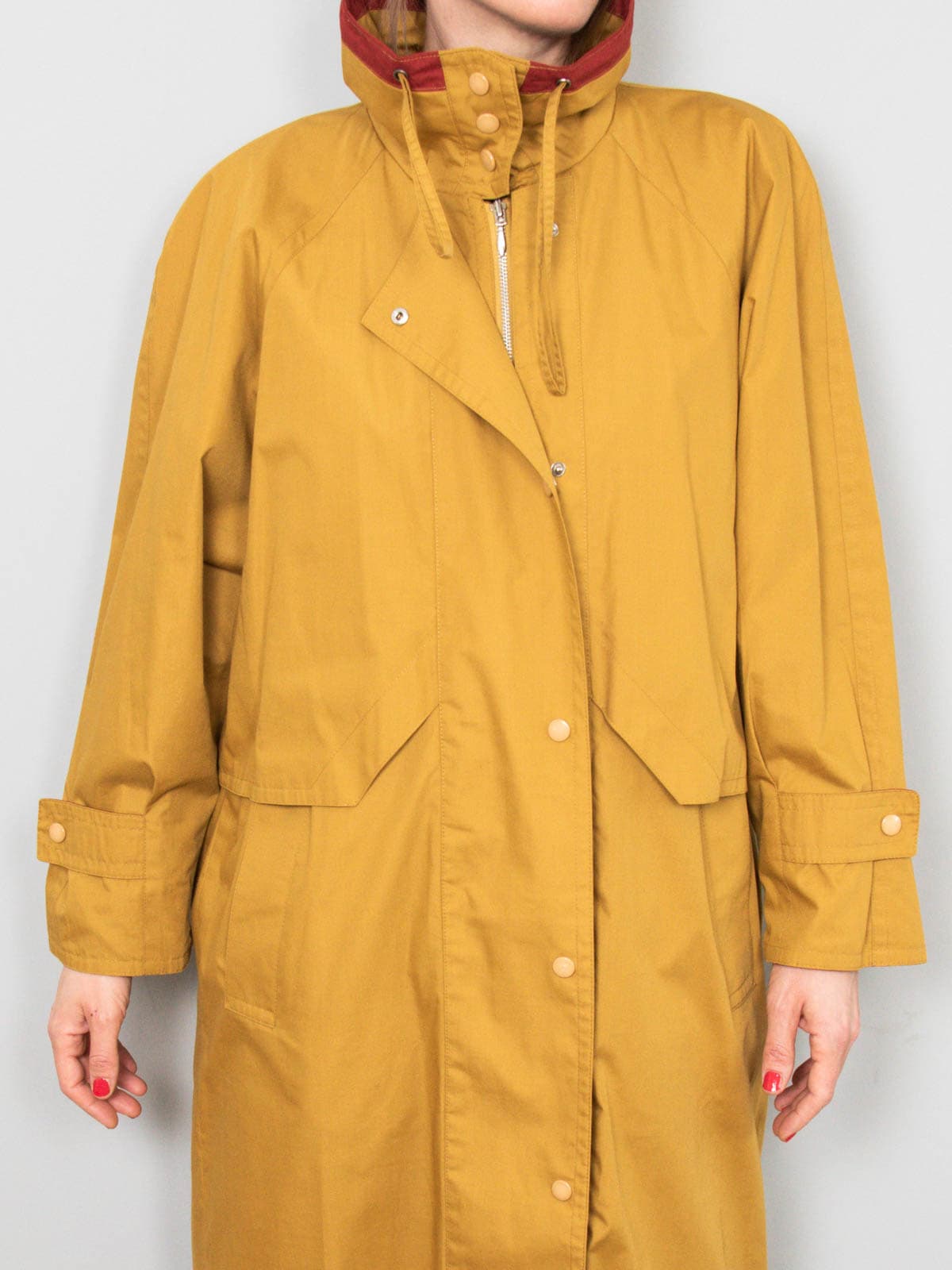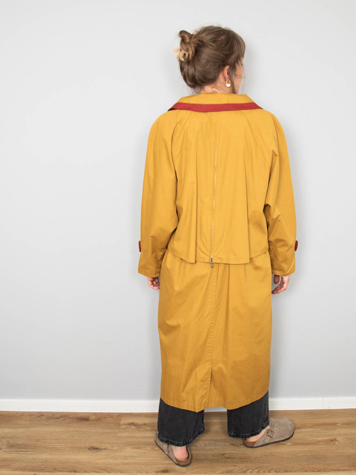 Beschreibung: Toller Vintage Mantel in Ocker. Ausgestattet mit zwei Seitentaschen, verschließbar mit Reißverschluss plus Knöpfen.