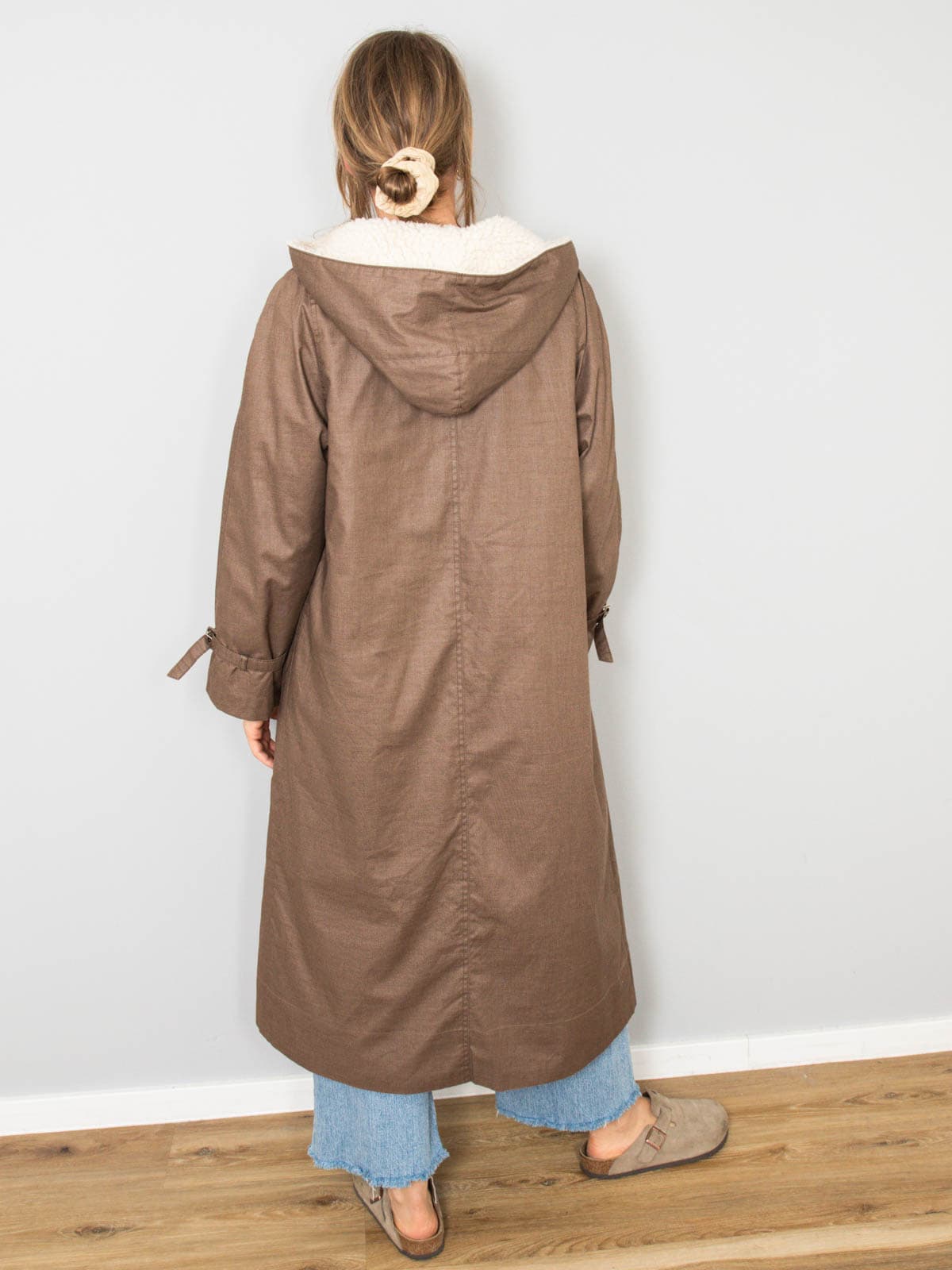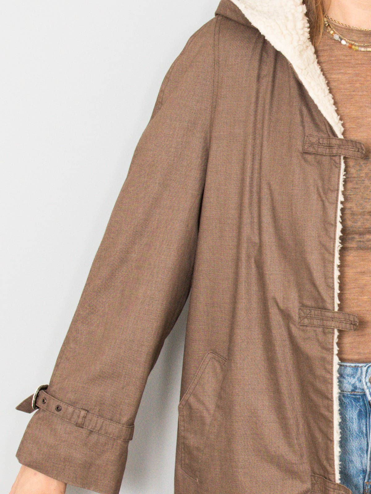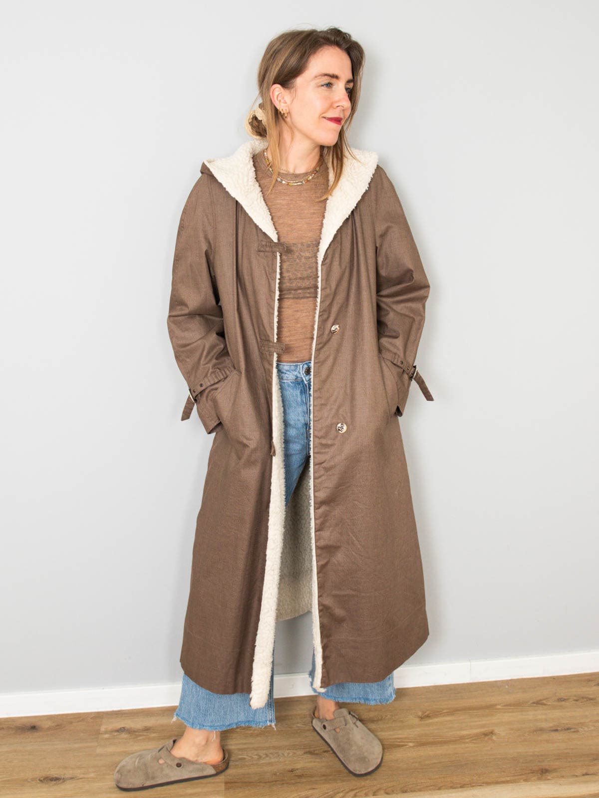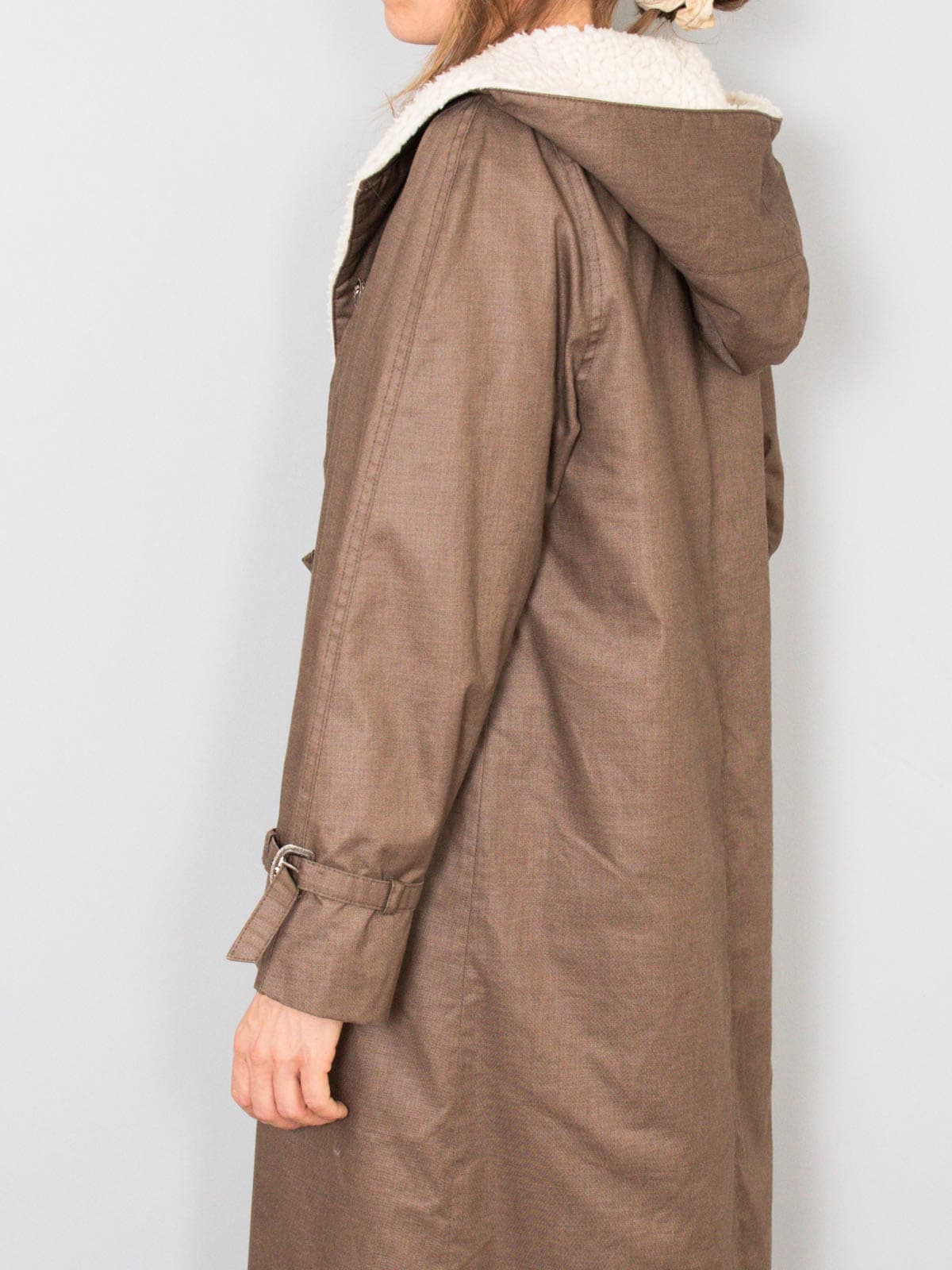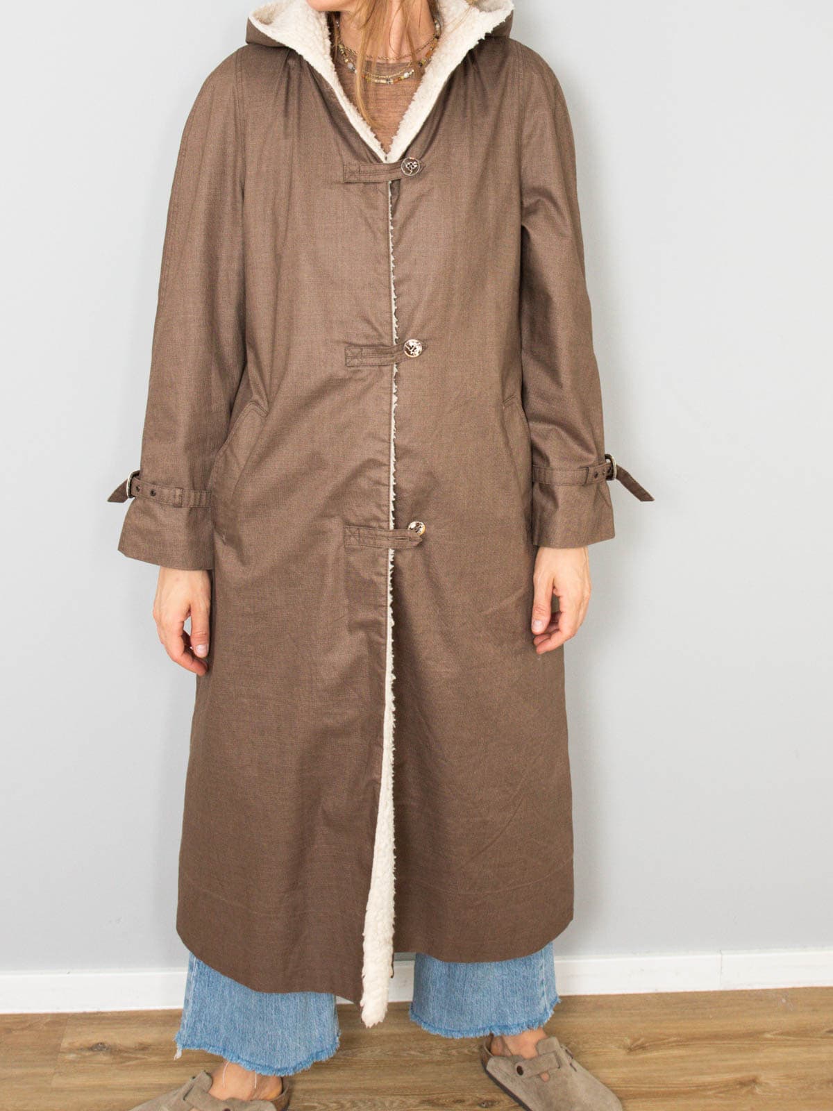 Beschreibung: Brauner Vintage Mantel mit Kapuze, gefüttert mit kuscheligem Tedyfell. Ausgestattet mit zwei Seitentaschen.