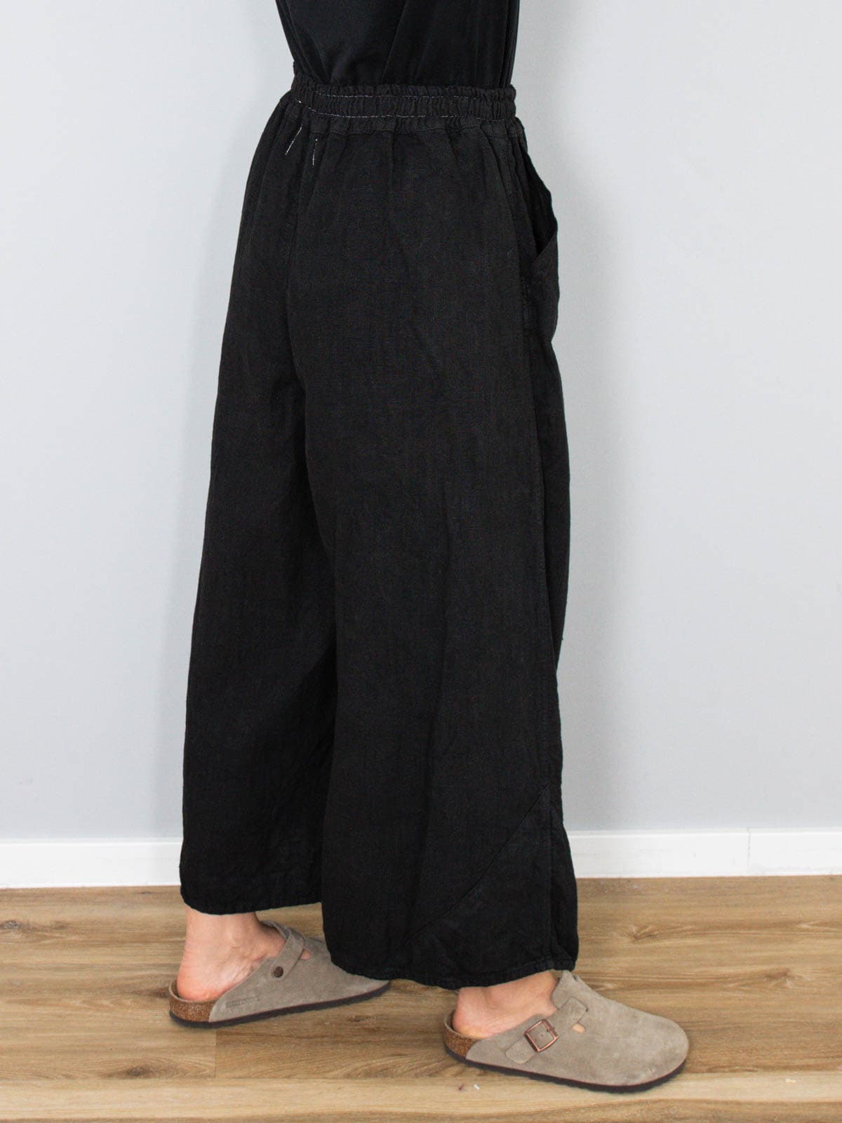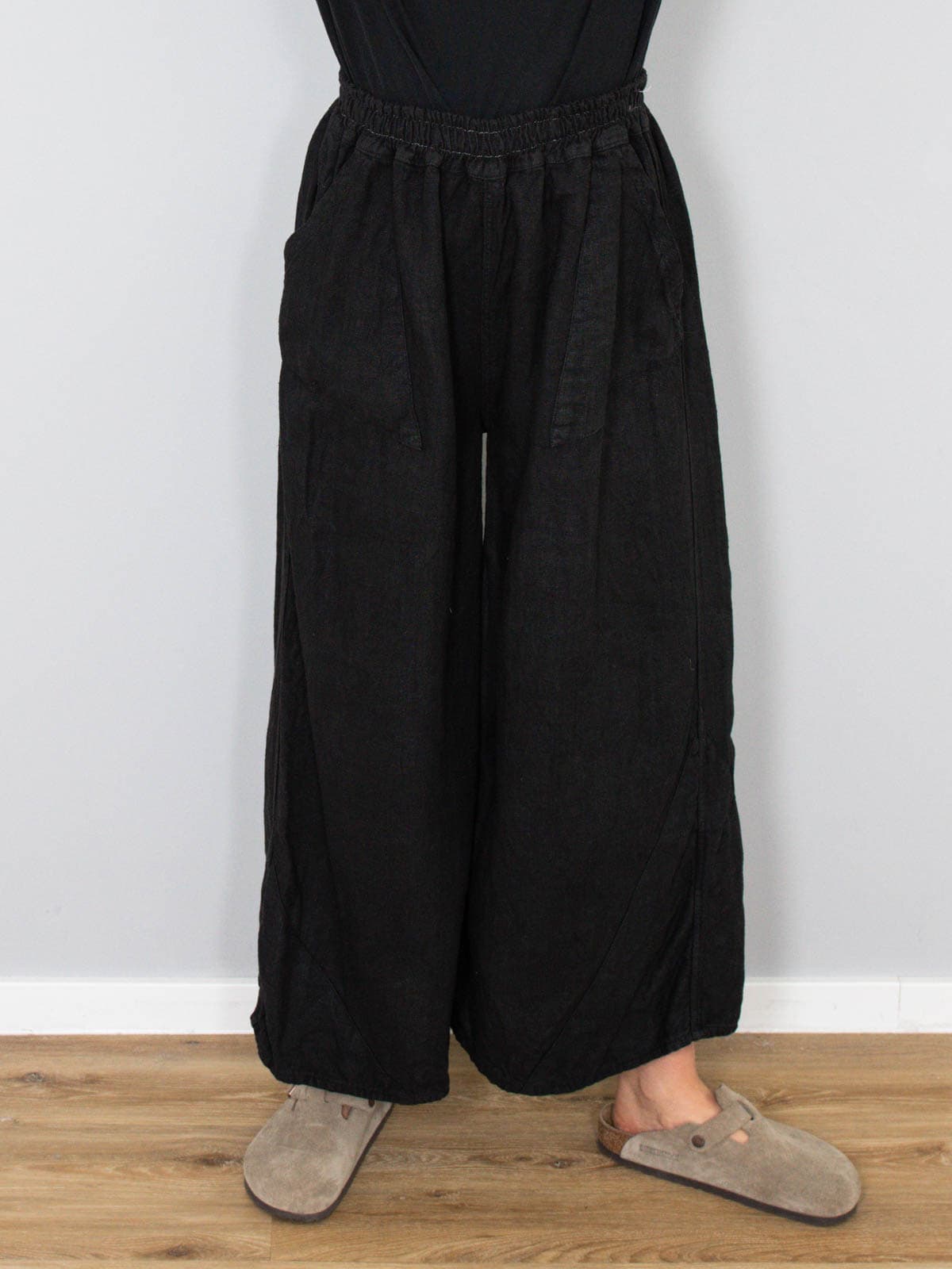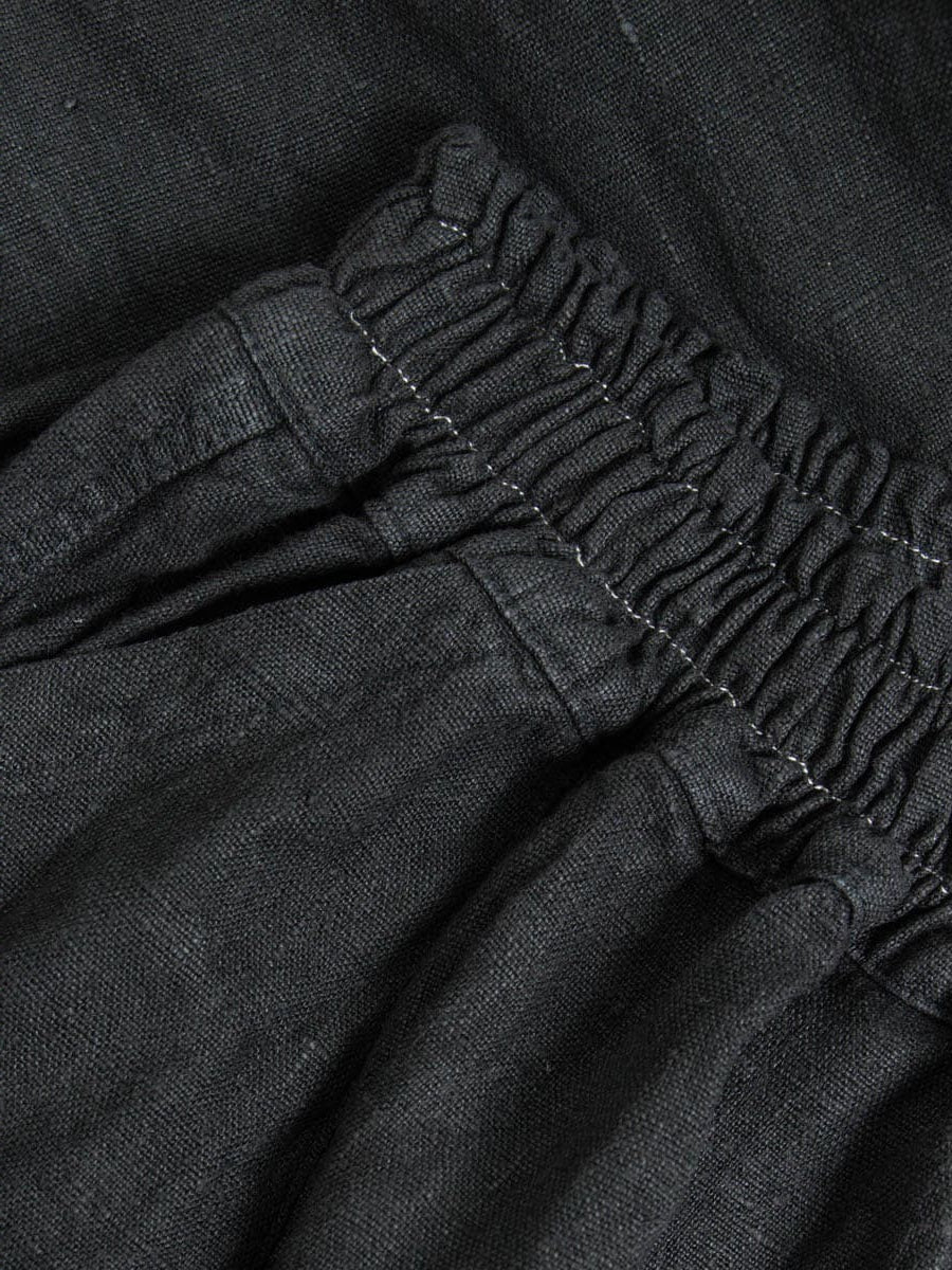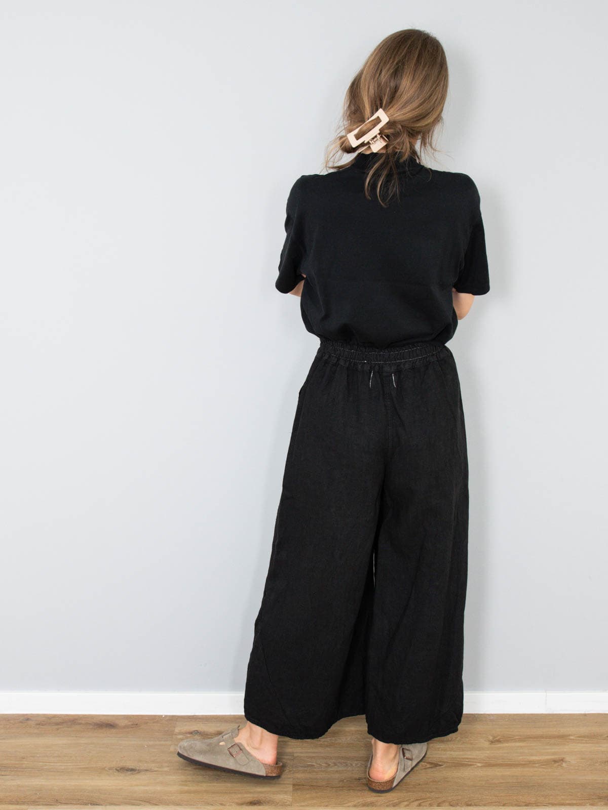 Beschreibung: Hoch geschnittene, schwarze Marlenehose aus Leinen. Ausgestattet mit einem elastischen Bund und zwei Seitentaschen.