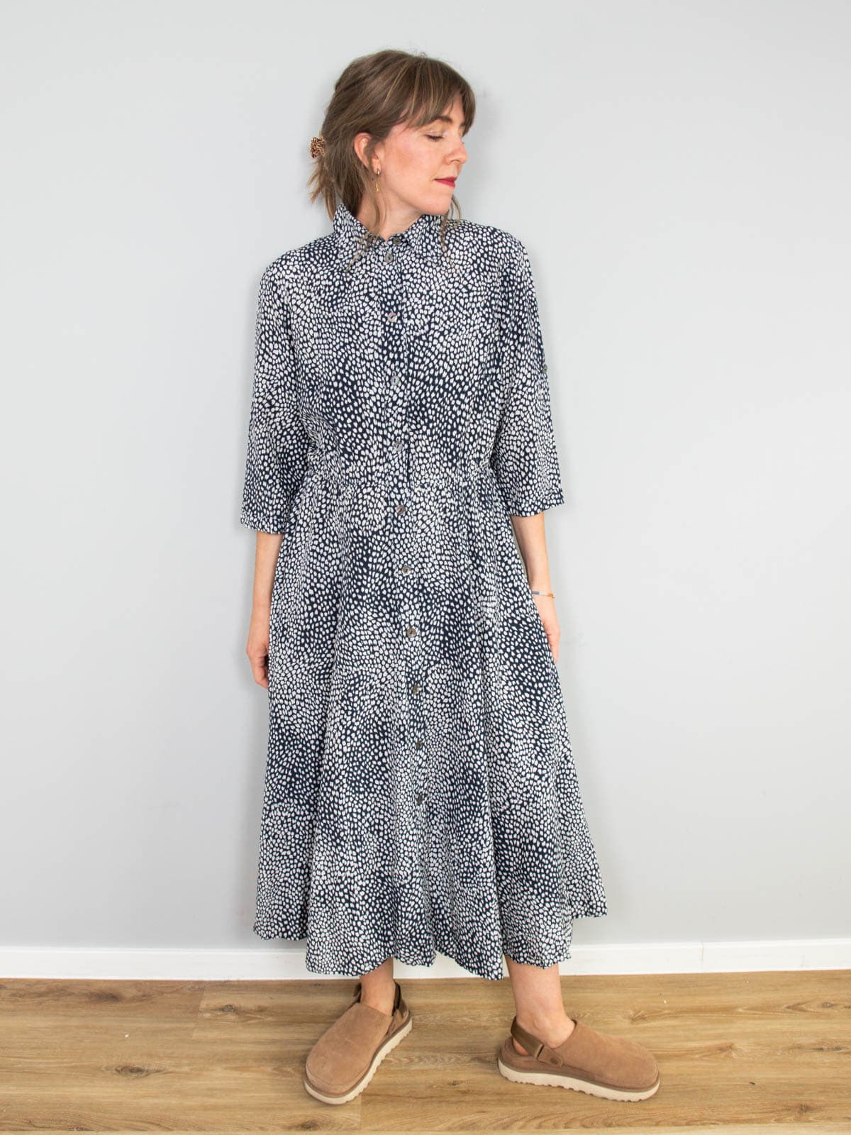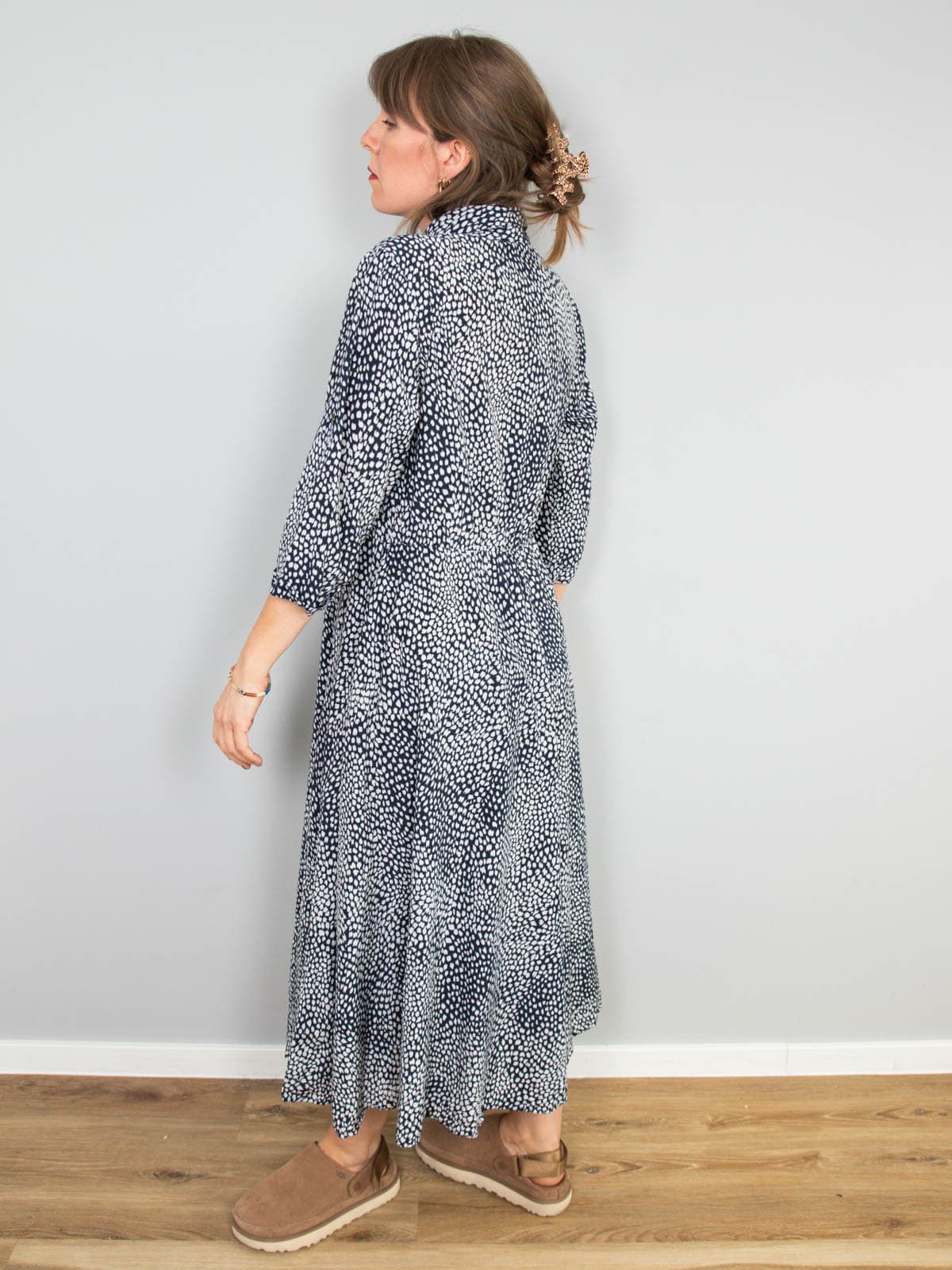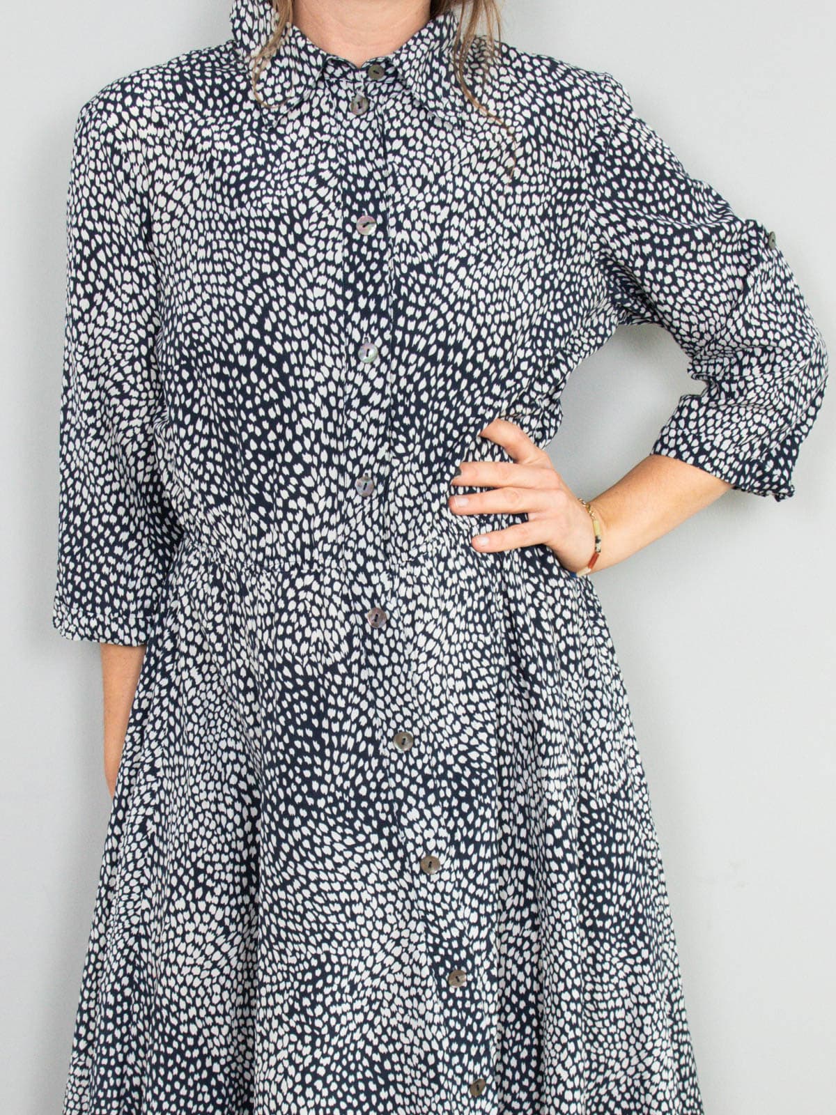 Beschreibung: Wunderschönes Maxikleid mit hohem Seidenanteil, elastischer Taille und durchgehender Knopfleiste.