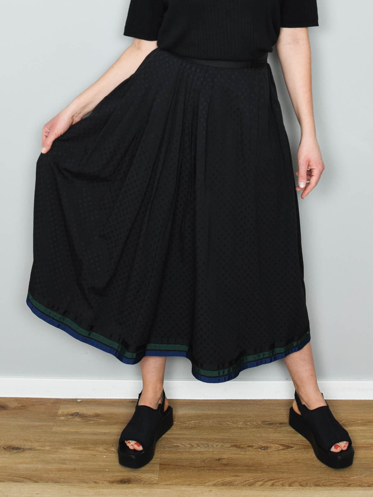 Beschreibung: Schwarzer Vintage Rock mit Bordüre in Grün und Blau.
