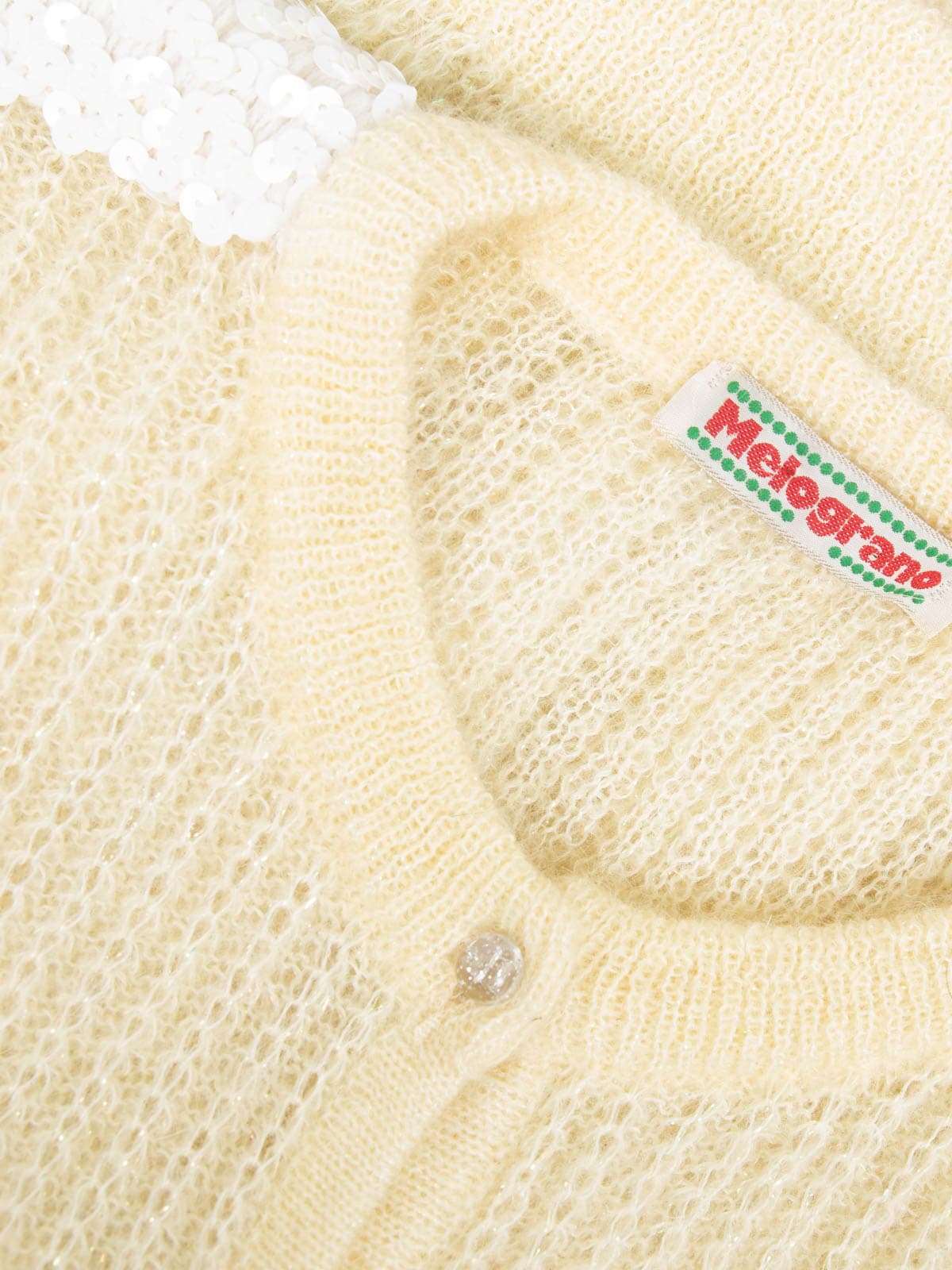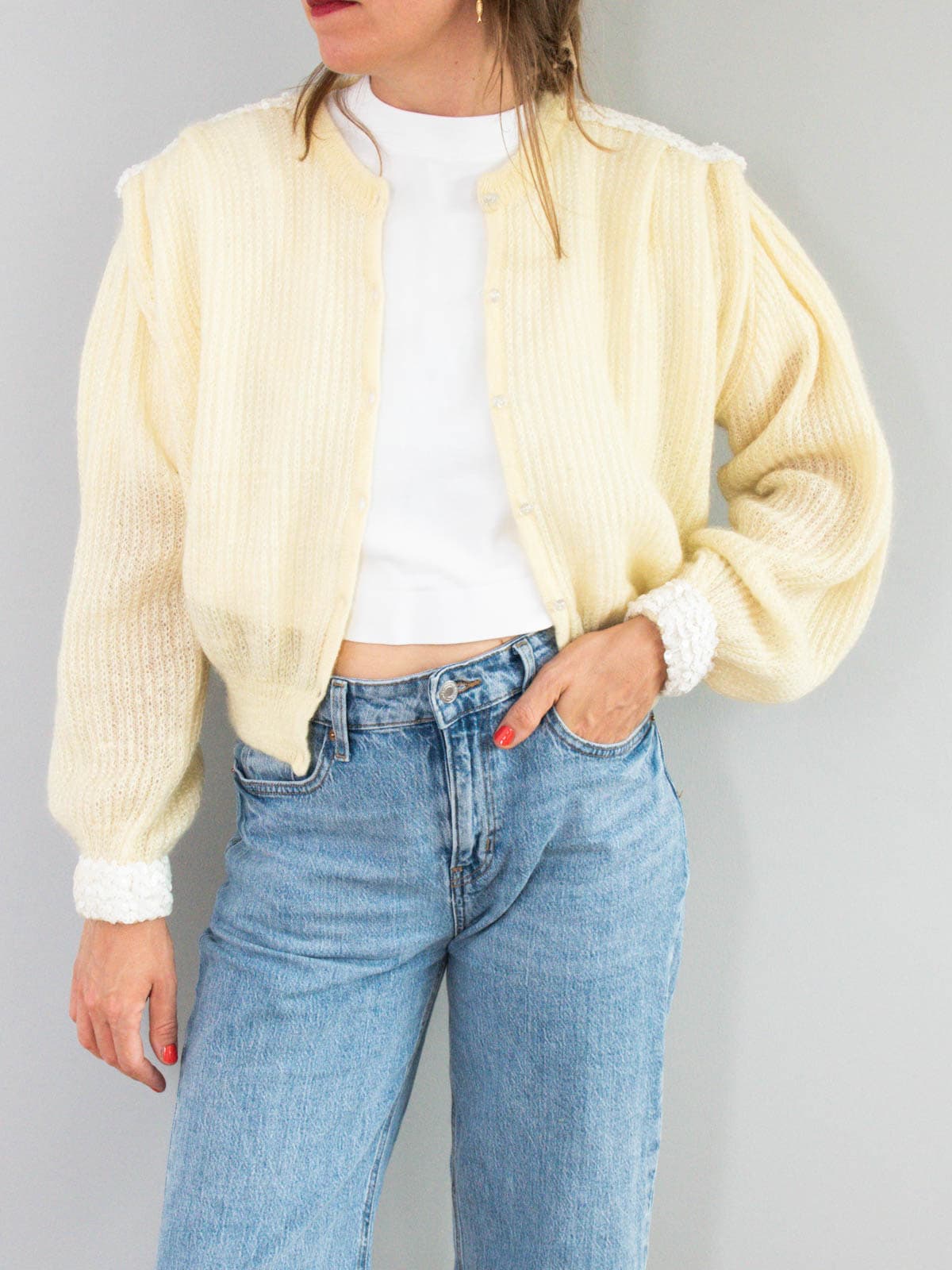 Beschreibung: Ausgefallener Vintage Cardigan in Gelb aus den 80er Jahren mit Puffärmeln. Verschließbar mit transparenten Knöpfen und geschmückt mit weißen Pailletten.