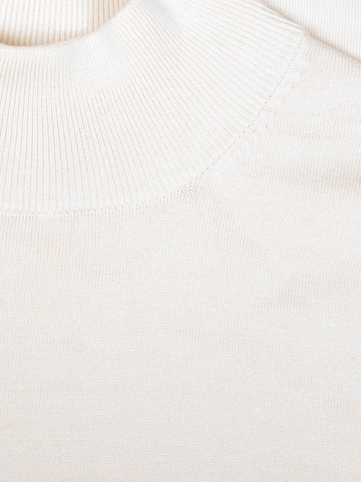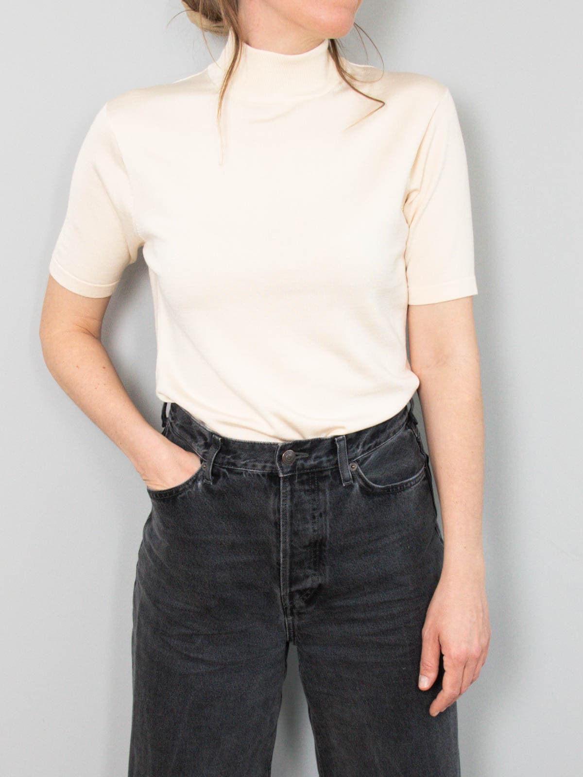 Beschreibung: Zeitloses und elastisches Oberteil in Creme mit Stehkragen und hohem Seidenanteil.