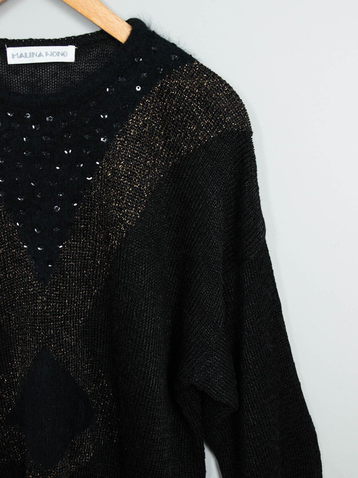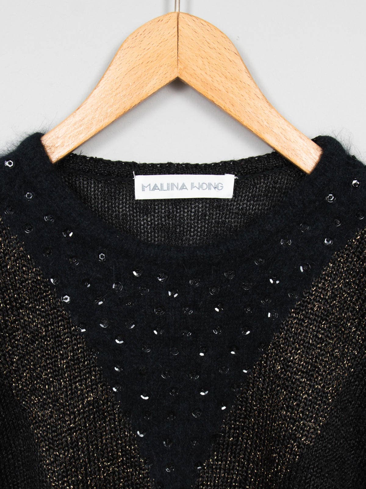 Beschreibung: Eleganter Vintage Pullover in Schwarz mit Pailletten auf Vorderseite und goldenen Highlights.