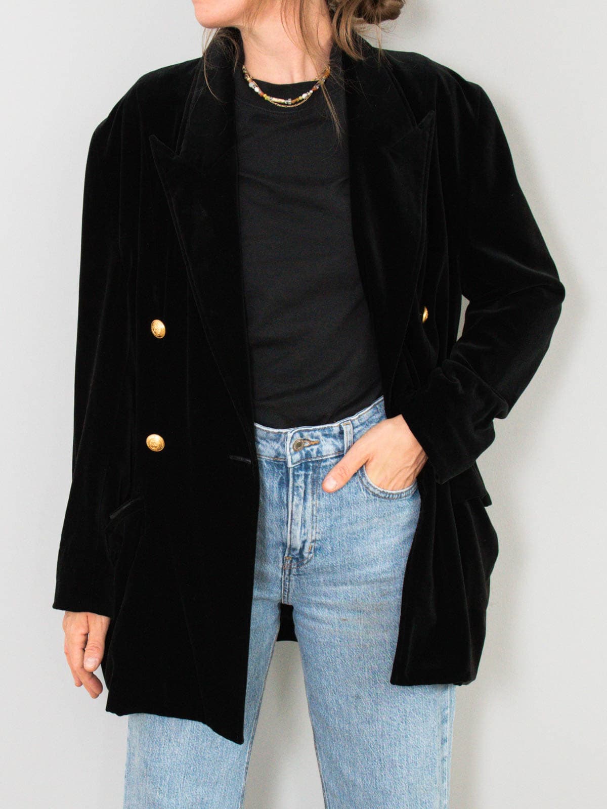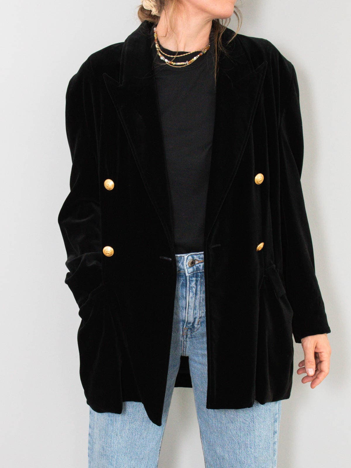 Beschreibung: Ein kuschelweicher Longblazer aus Samt. Geschmückt mit goldenen Knöpfen und zwei Seitentaschen.