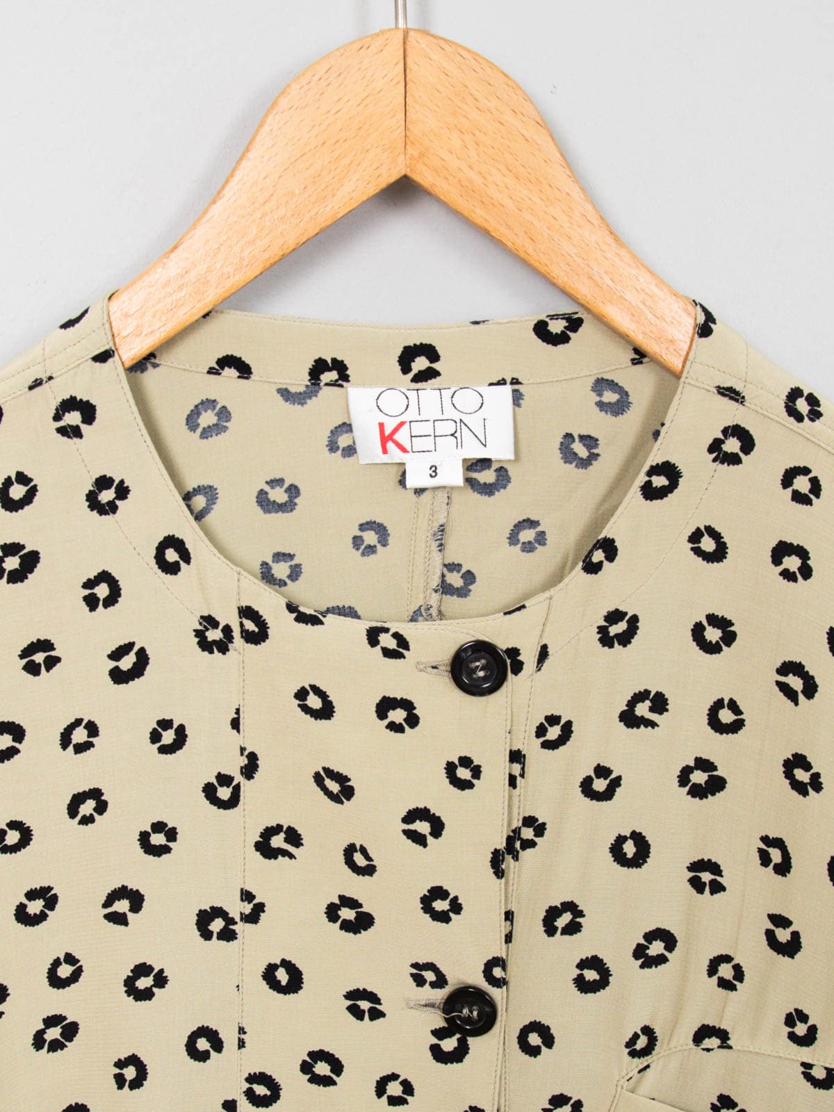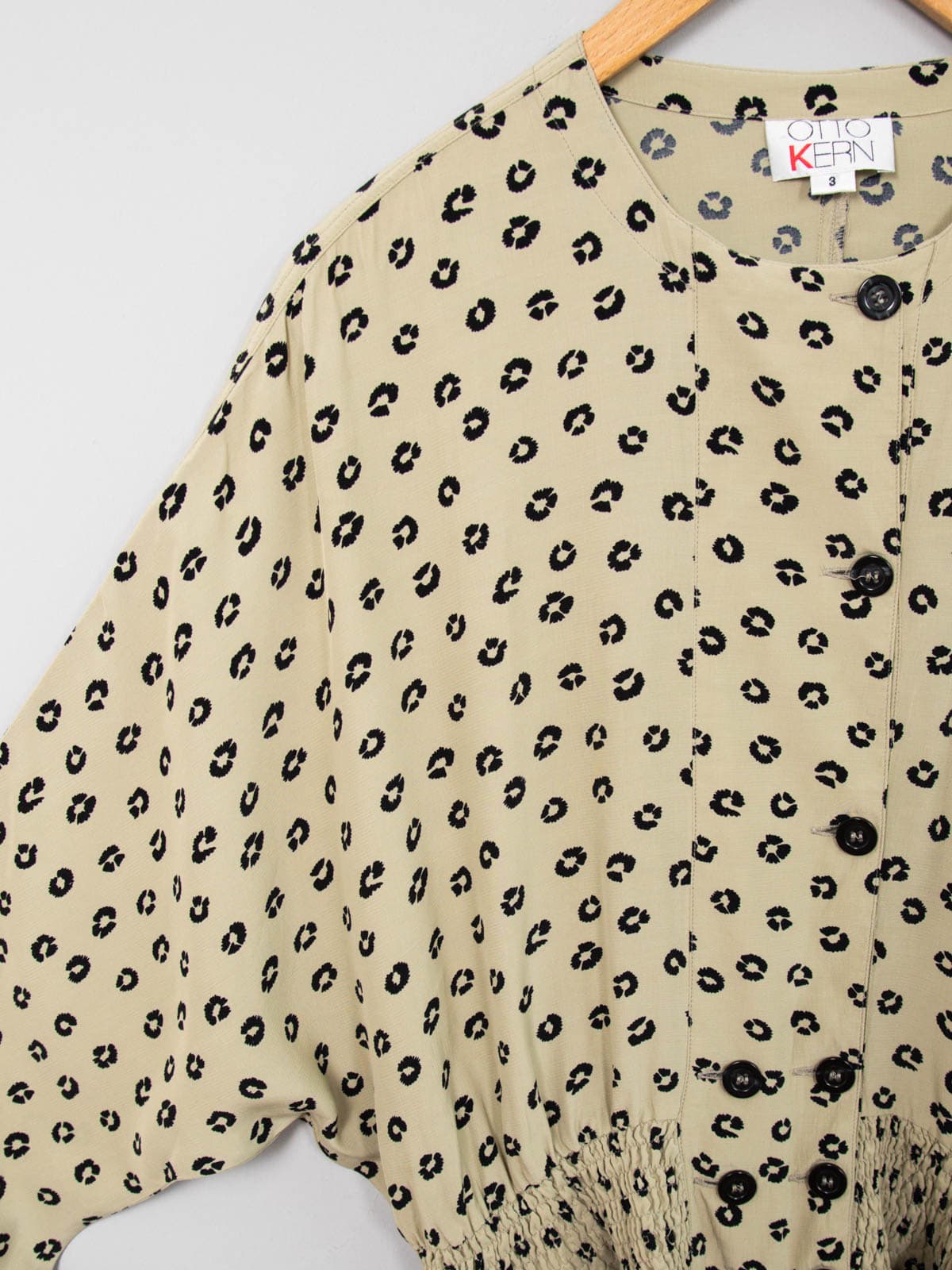 Beschreibung: Sehr coole, kragenlose und verkürzt geschnittene Vintage Bluse mit dehnbarer Taille und weitem Armschnitt.