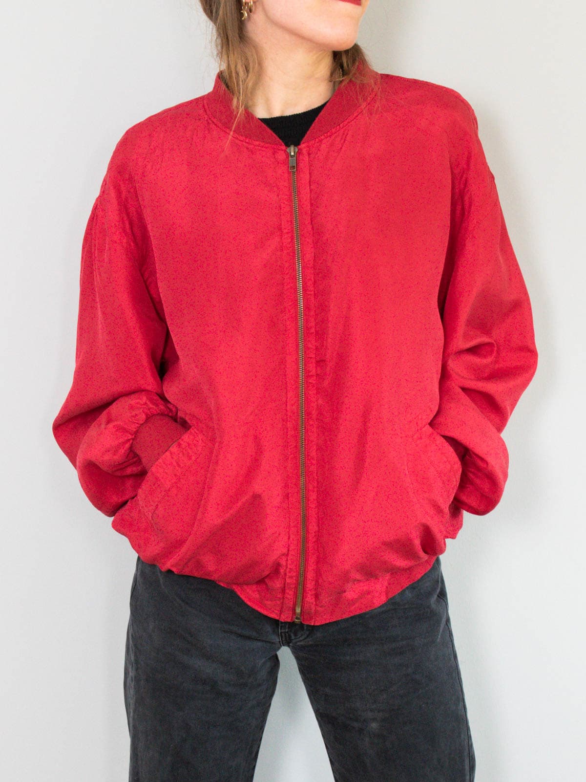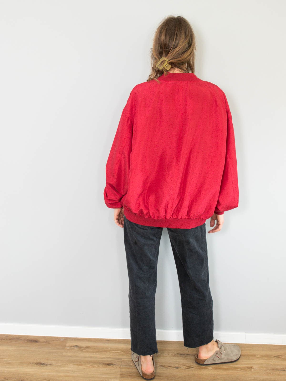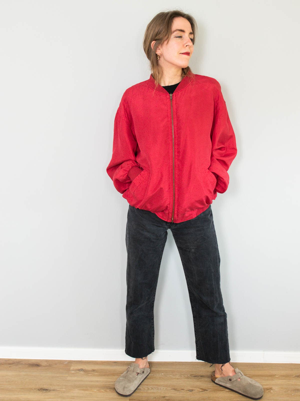 Beschreibung: Ein luftig leichtes Vintage Seidenblouson in knalligem Rot. Ausgestattet mit zwei Taschen und unterfüttert.