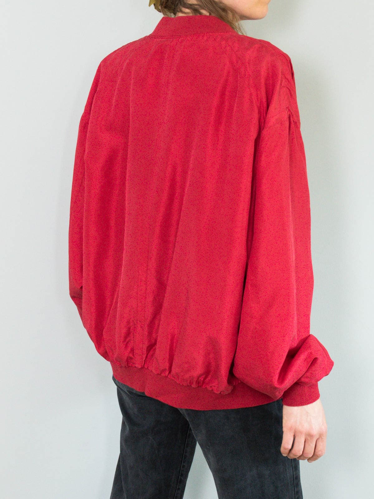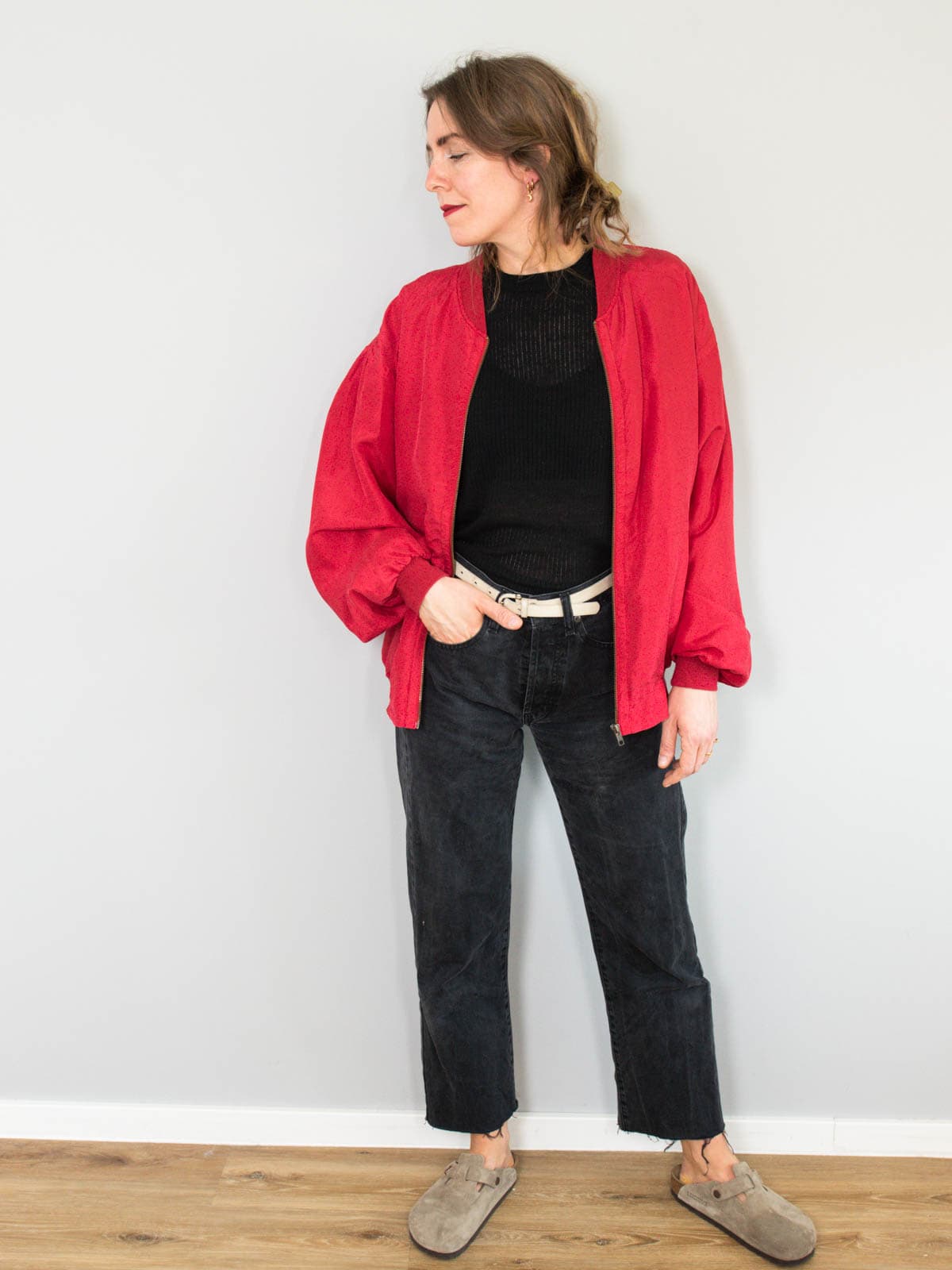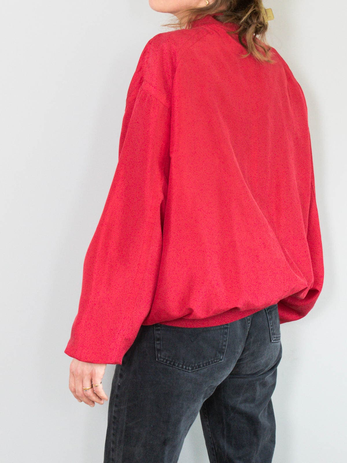Beschreibung: Ein luftig leichtes Vintage Seidenblouson in knalligem Rot. Ausgestattet mit zwei Taschen und unterfüttert.