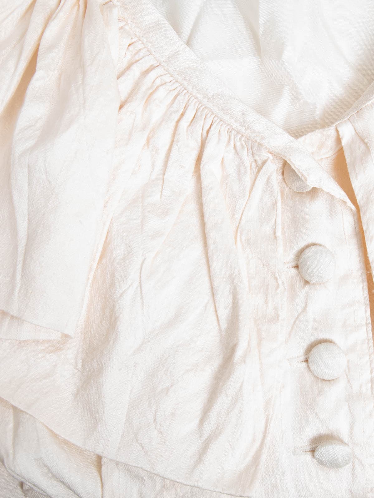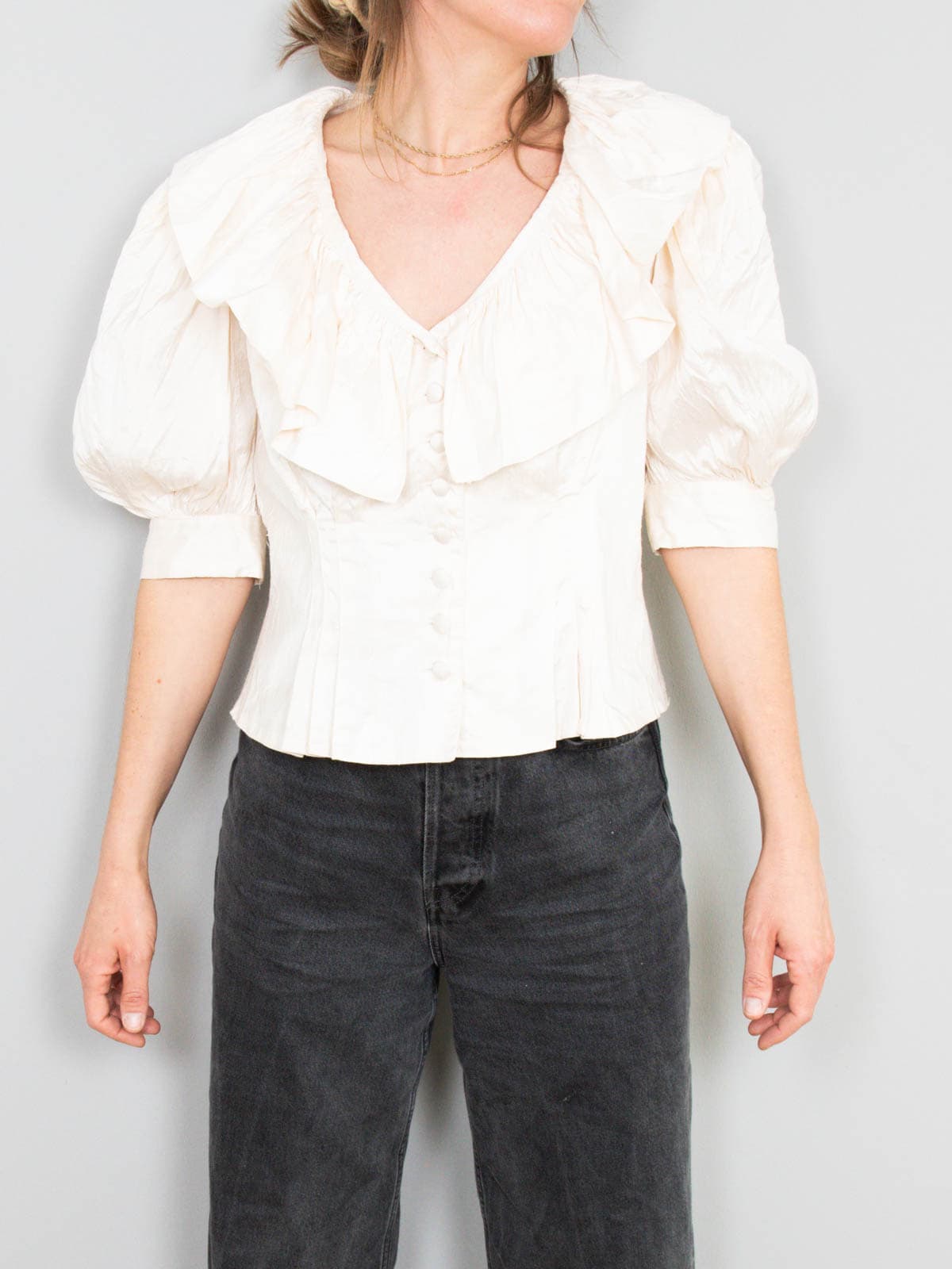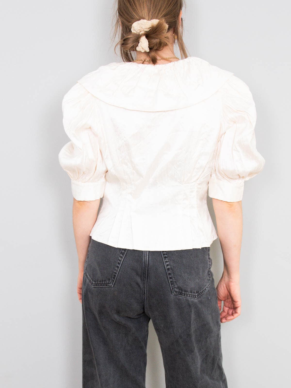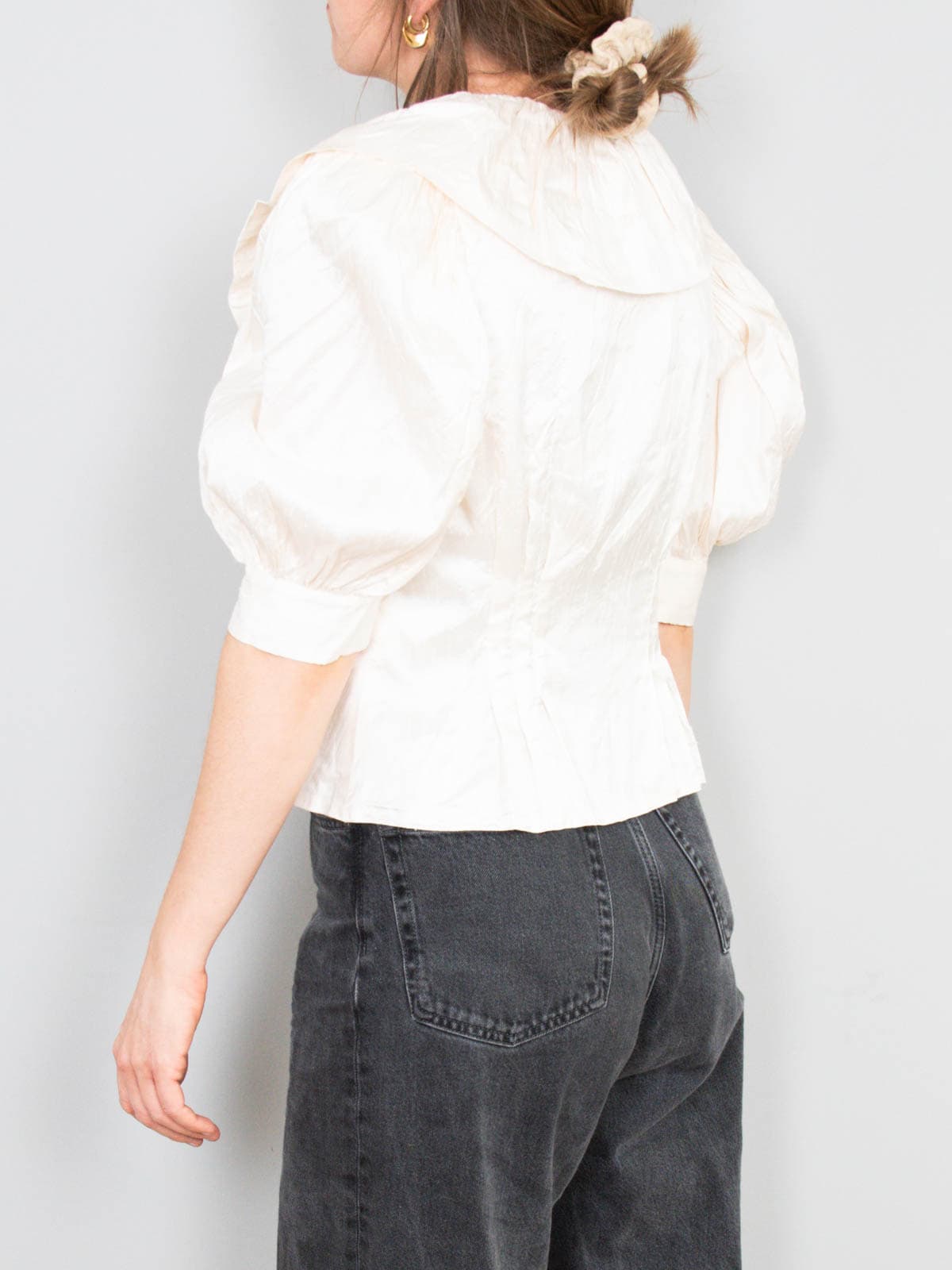 Beschreibung: Edle Vintage Seidenbluse in Creme mit Puffärmeln und gerüschtem Matrosenkragen. Verschließbar mit stoffüberzogenen Knöpfen.