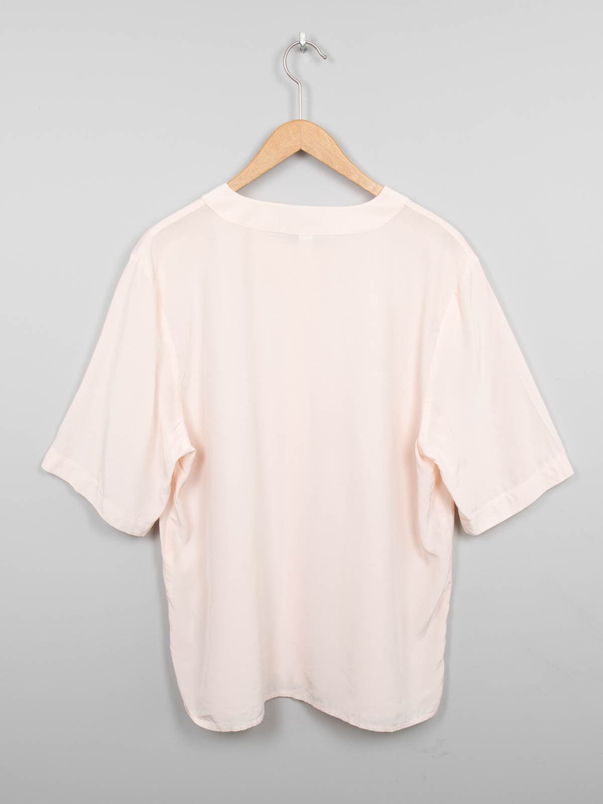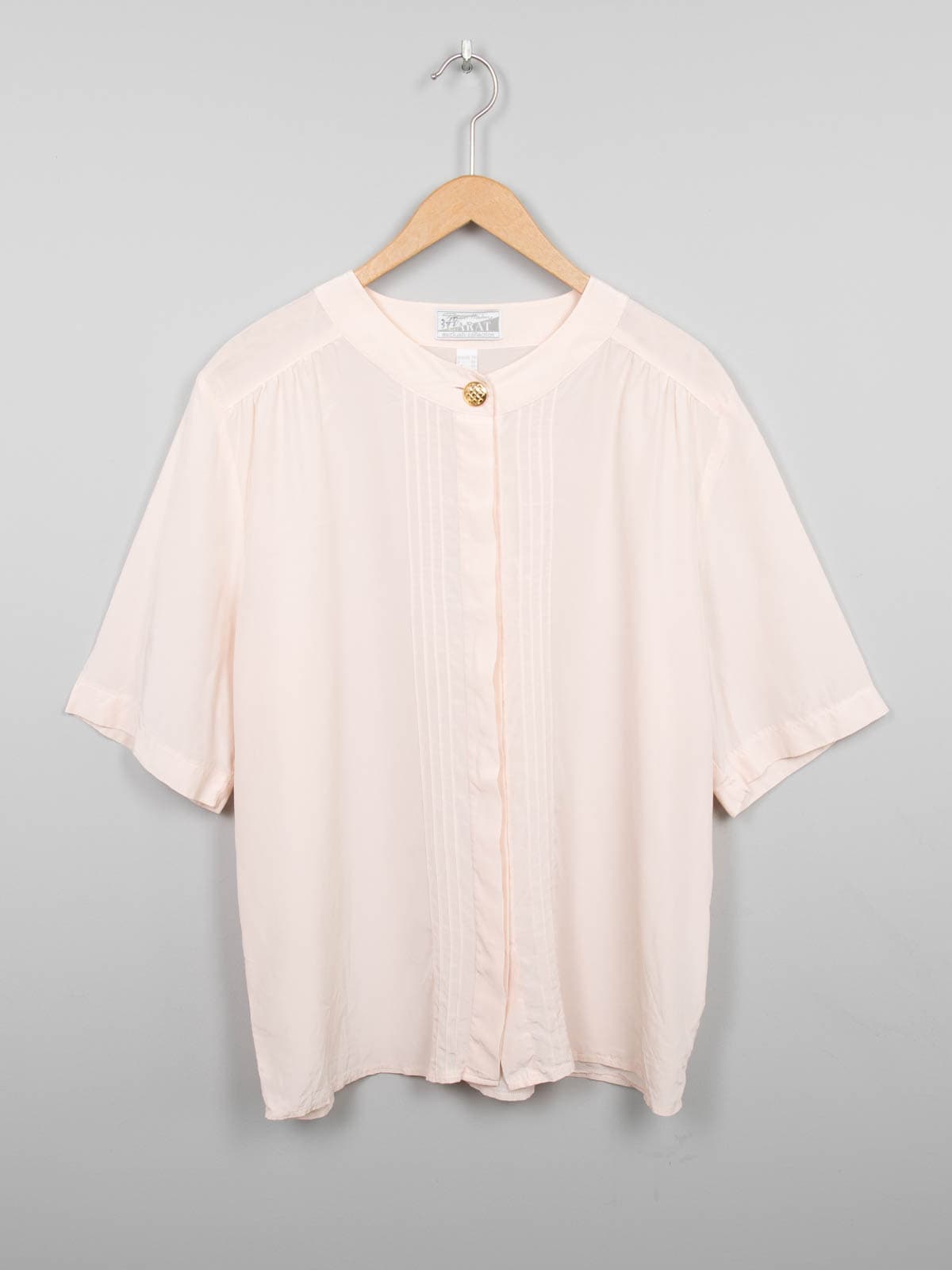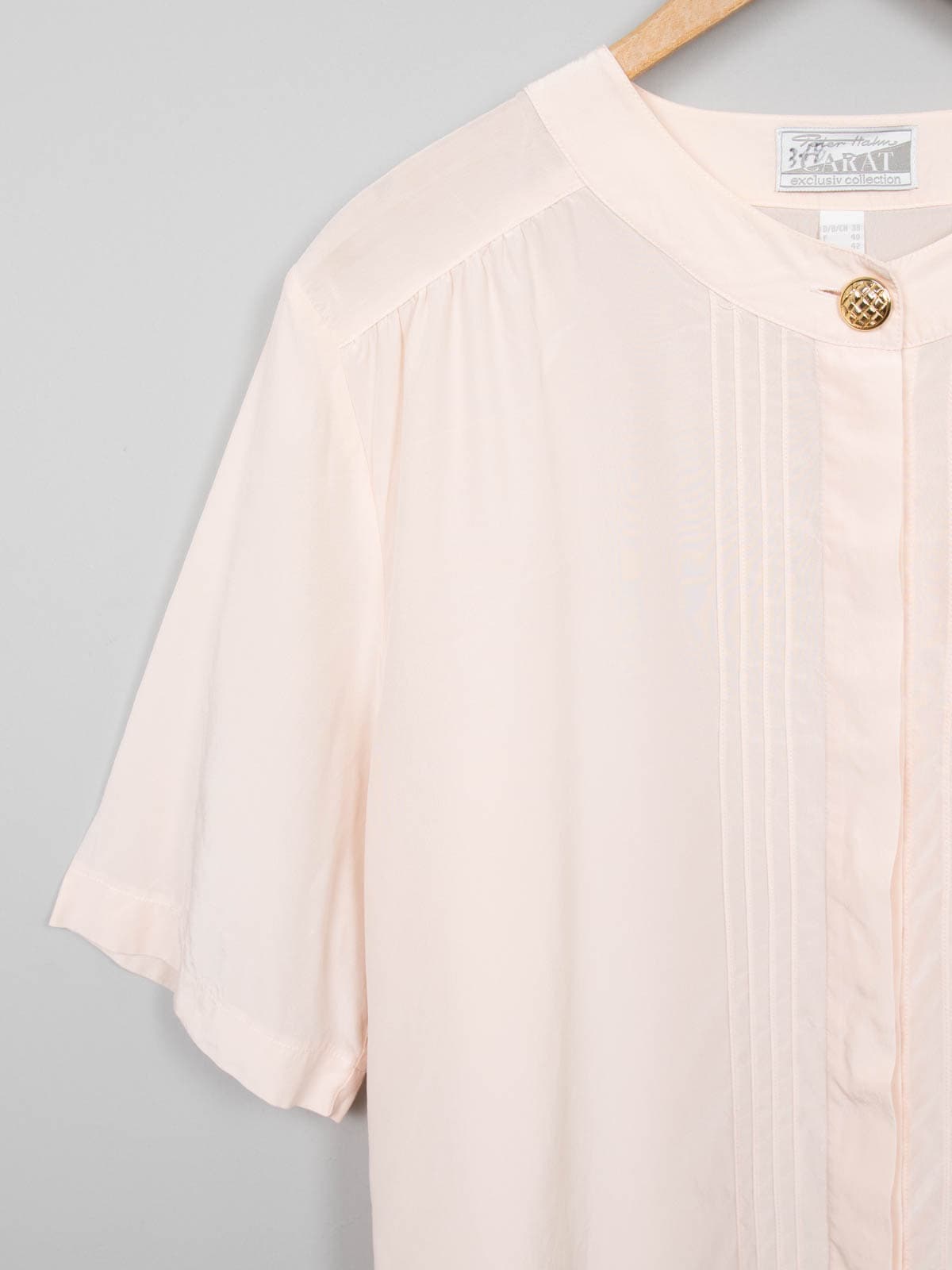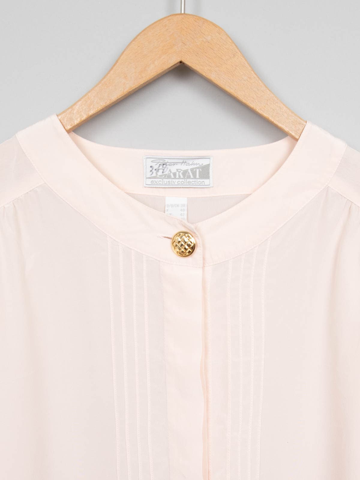 Beschreibung: Elegante Vintage Seidenbluse in zartem Roséton und mit tollem, goldfarbenem Schmuckknopf.