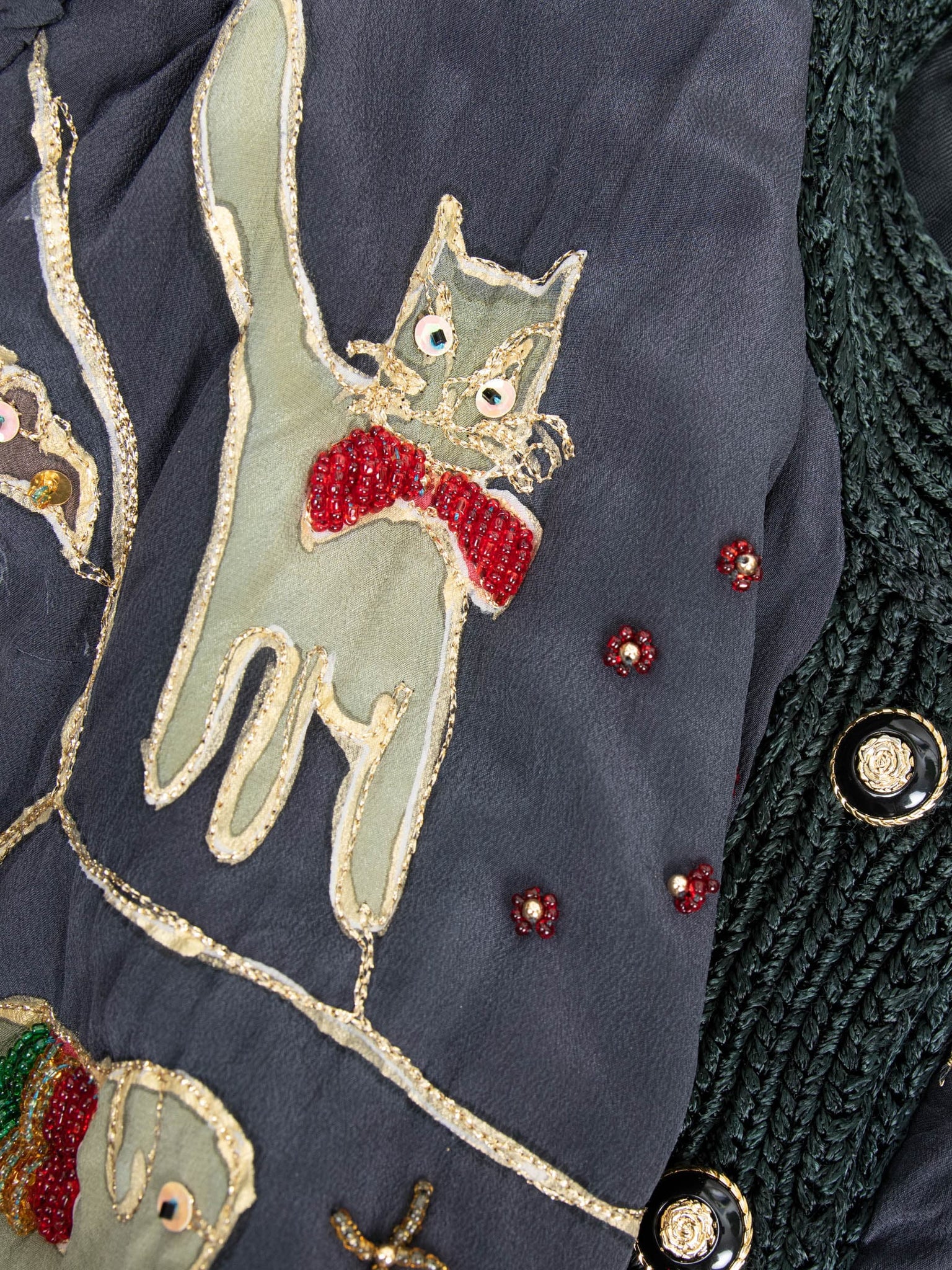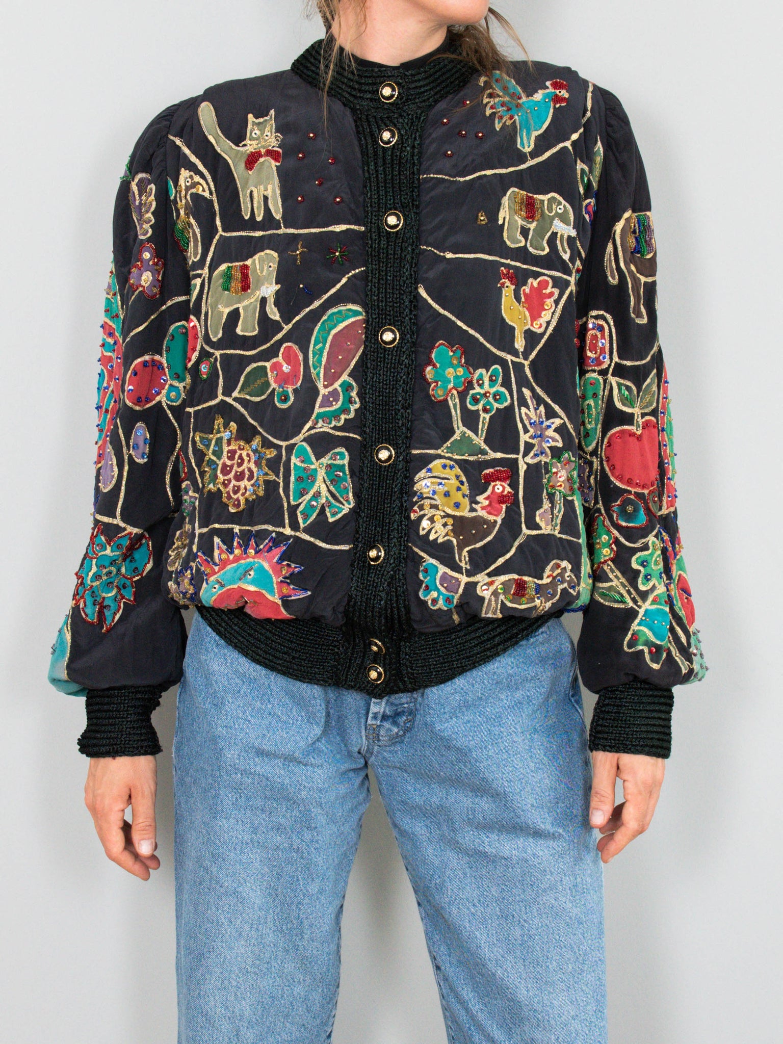 Beschreibung: Außergewöhnliche und elegante Seidenjacke mit Puffärmeln, handbemalt und bestickt mit bunten Pailletten. Unterfüttert und ausgestattet mit zwei Seitentaschen.