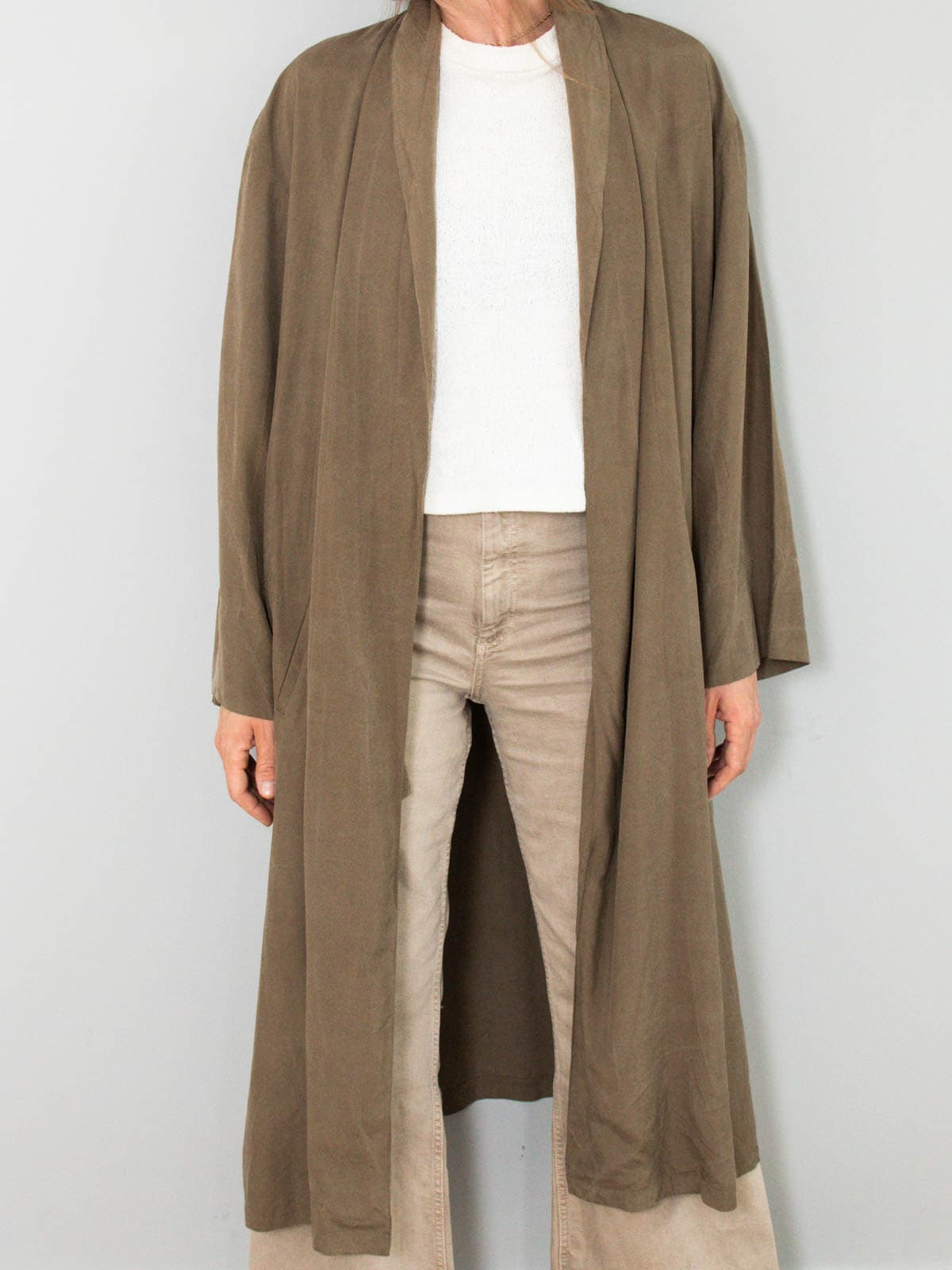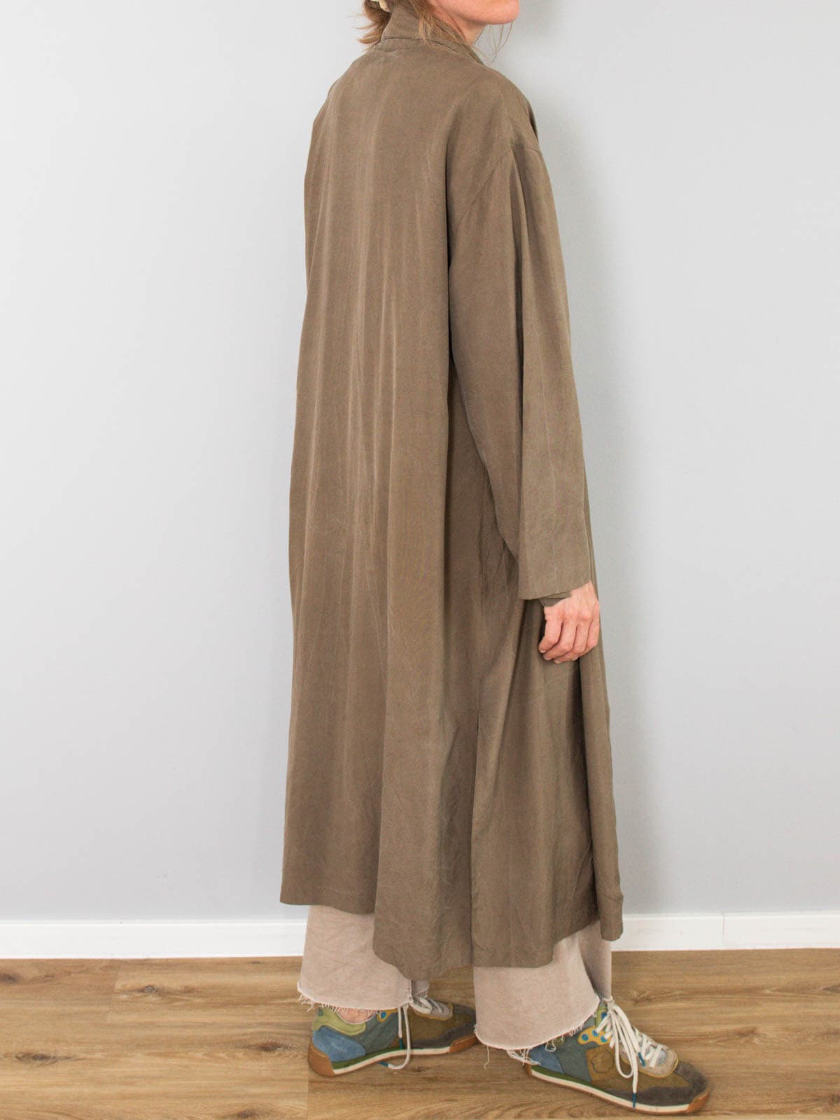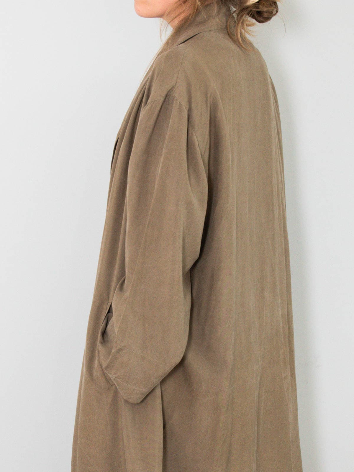 Beschreibung: Wunderschönster und leichter Vintage Mantel aus reiner Seide. Ausgestattet mit zwei Seitentaschen und nicht zu verschließen.