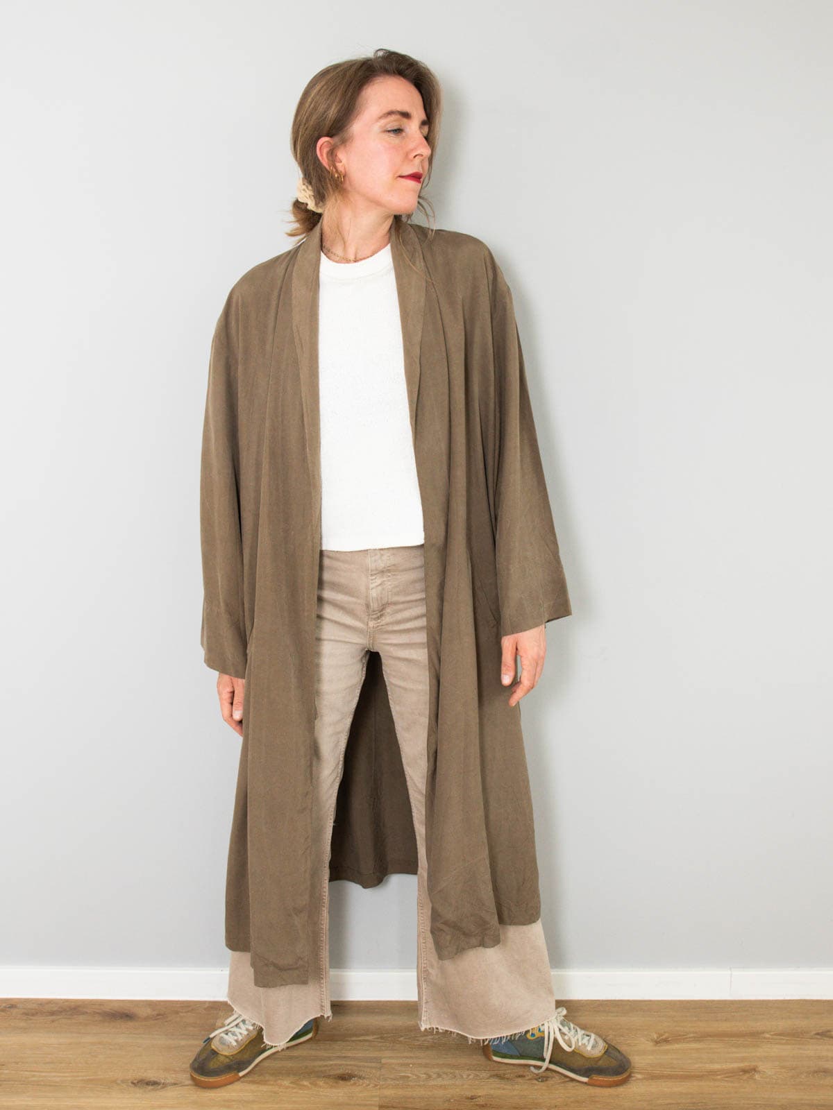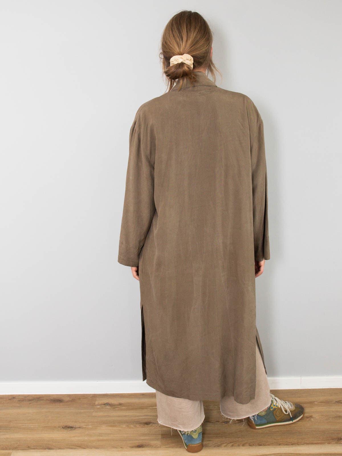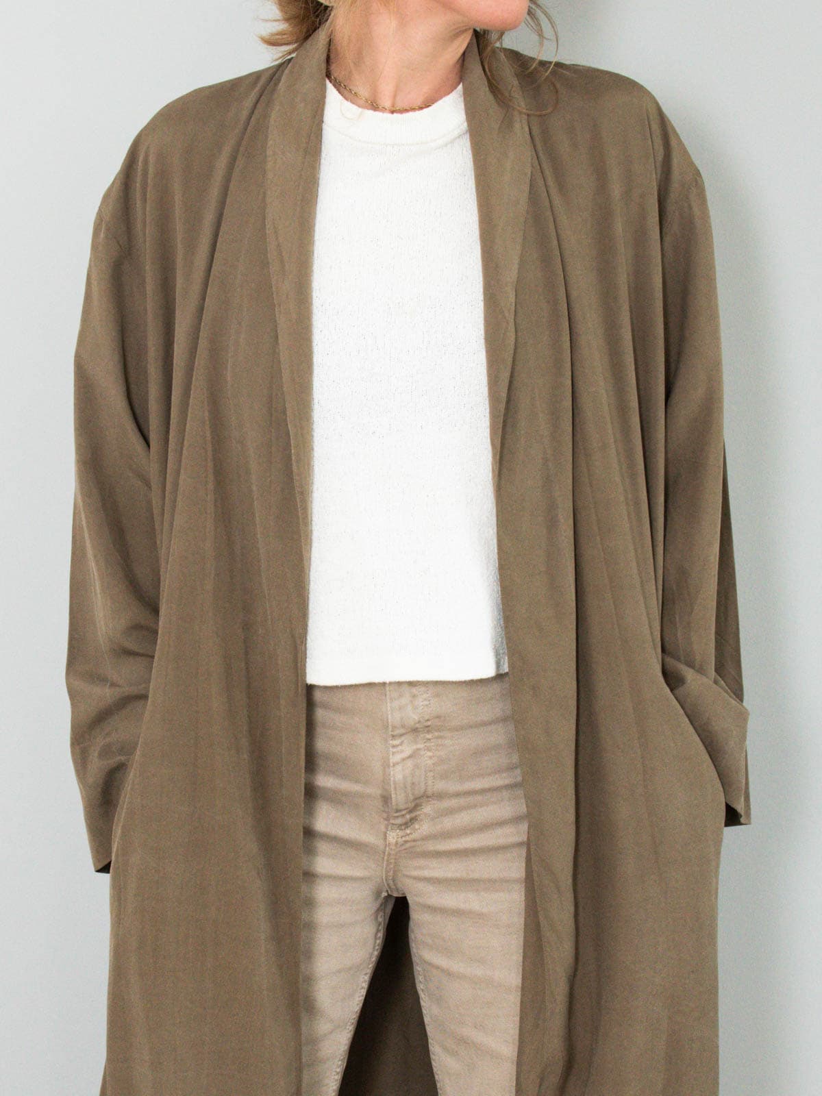 Beschreibung: Wunderschönster und leichter Vintage Mantel aus reiner Seide. Ausgestattet mit zwei Seitentaschen und nicht zu verschließen.