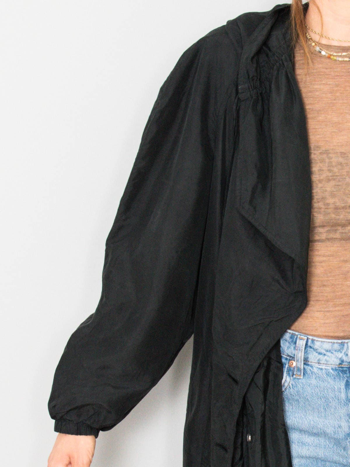 Beschreibung: Sehr toller, luftig leichter Oversize Seidenmantel in Schwarz mit Kapuze. Verschließbar mit drei Knöpfen und ausgestattet mit zwei Seitentaschen.