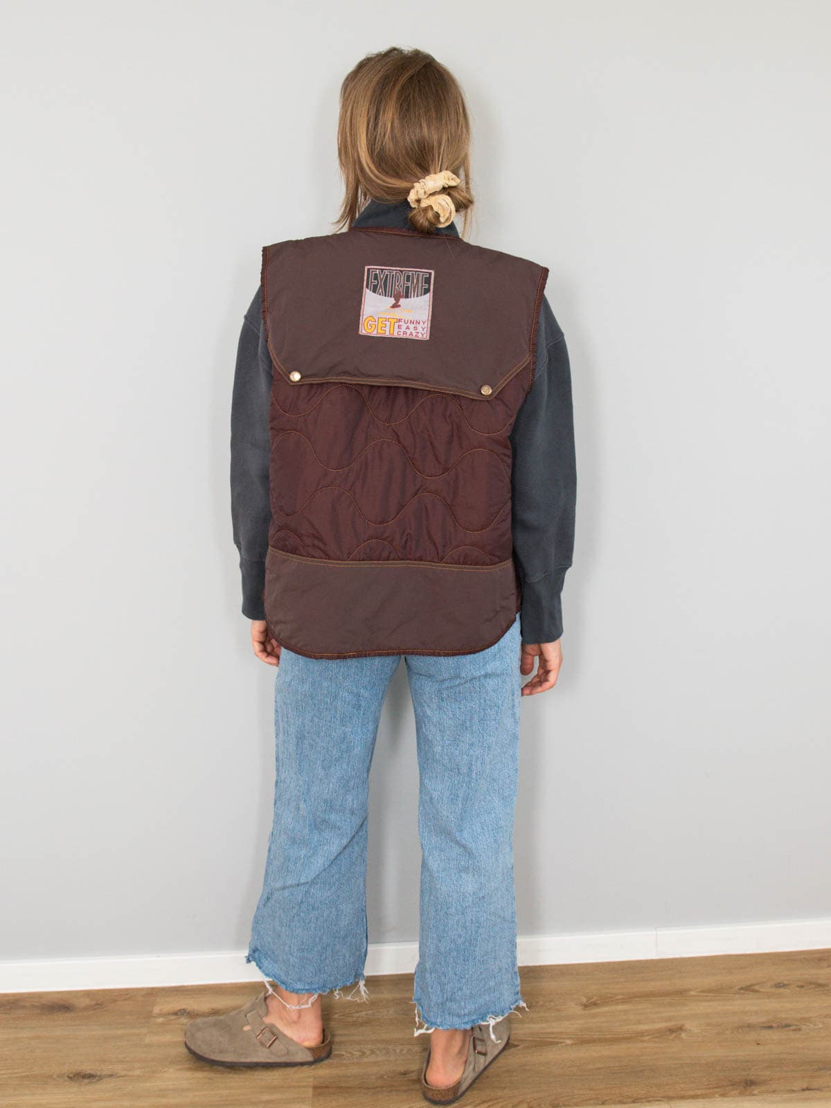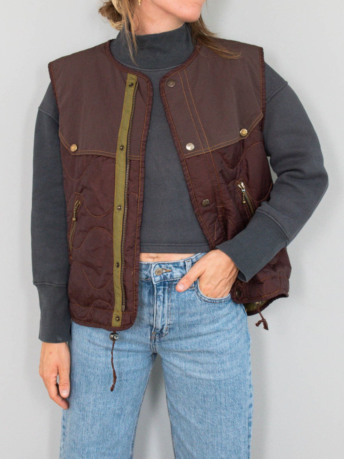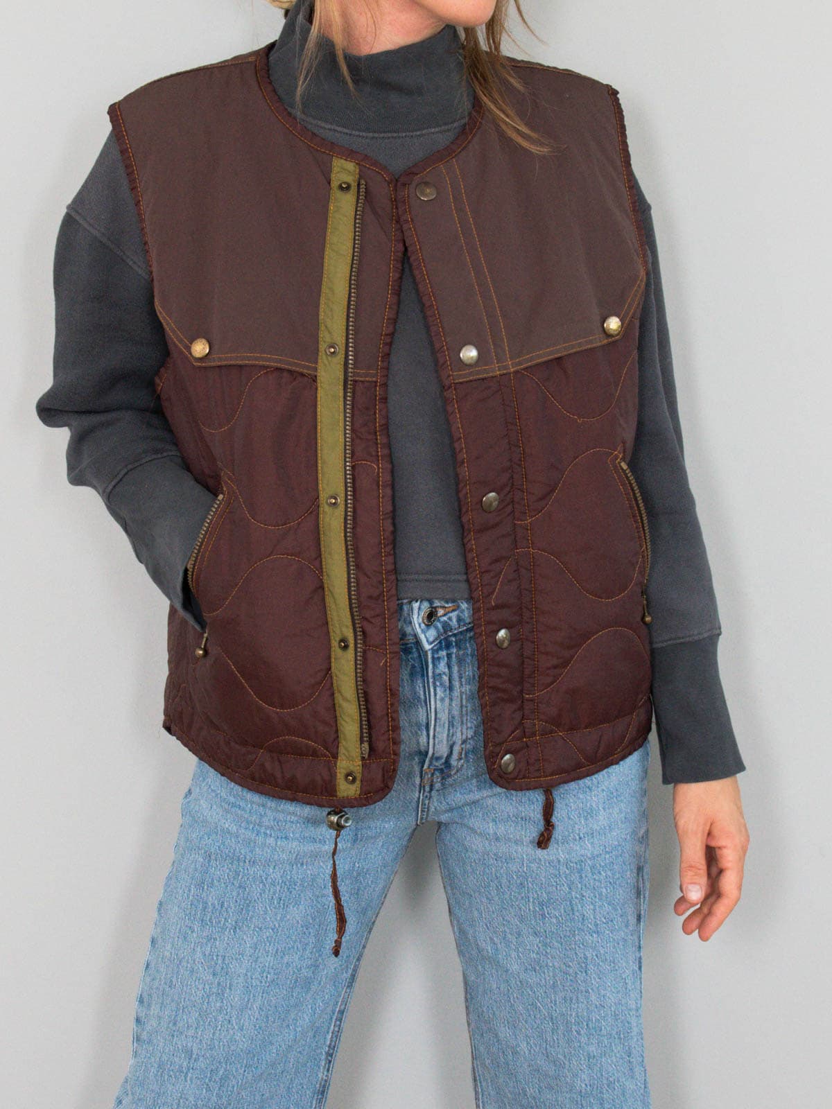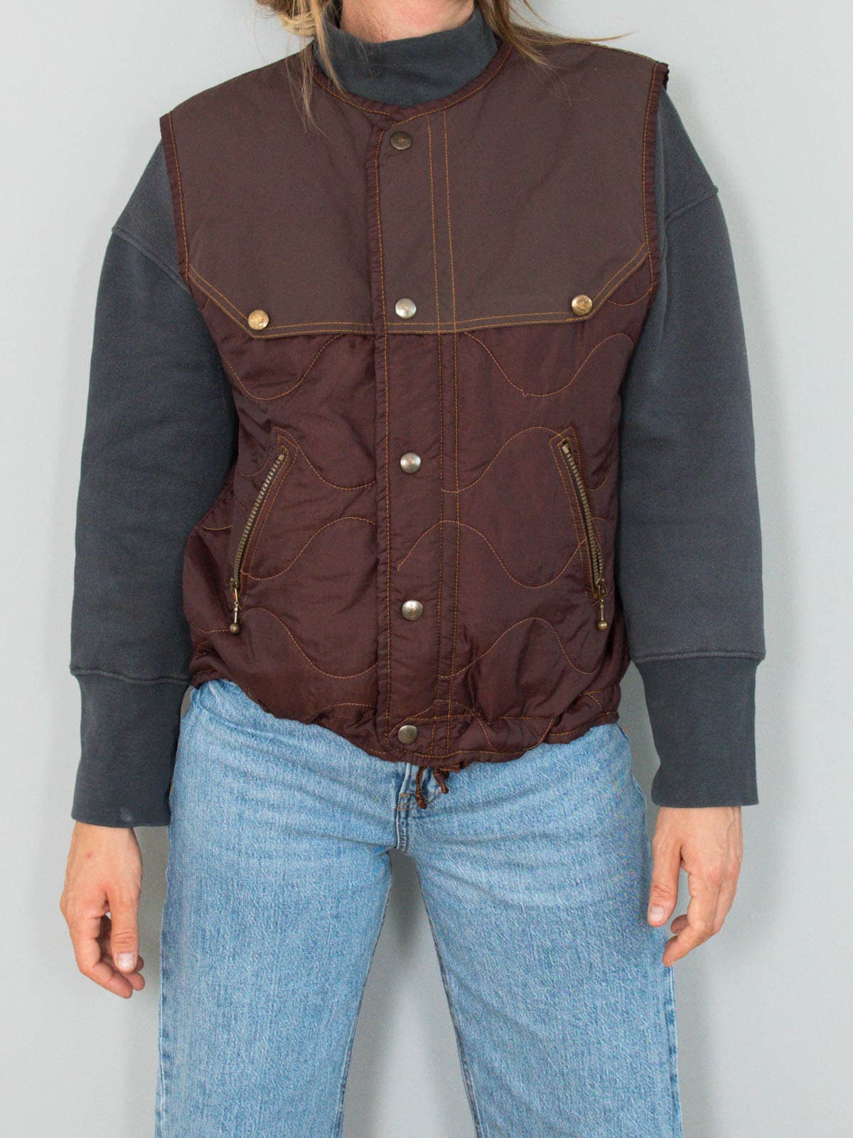 Beschreibung: Vintage Weste in Rotbraun, verschließbar mit Reißverschluss plus Druckknöpfen und ausgestattet mit zwei Taschen. Ein preloved Fundstück aus Frankreich.