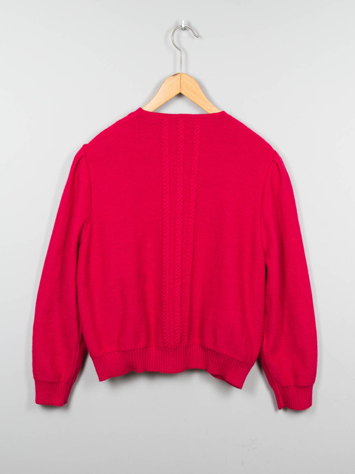 Beschreibung: Vintage Strickjacke in knalligem Pink mit goldfarbenen Schmuckknöpfen, dezenten Puffärmeln und Zopmuster auf der Front.