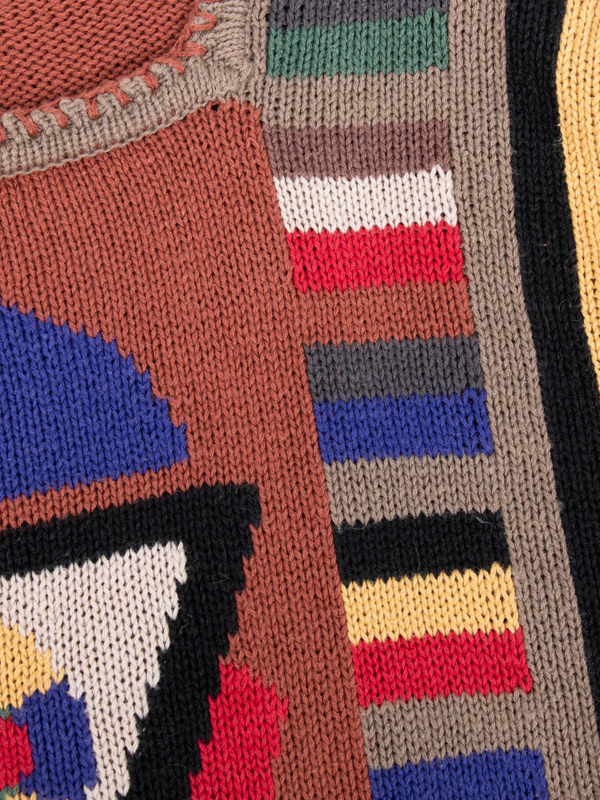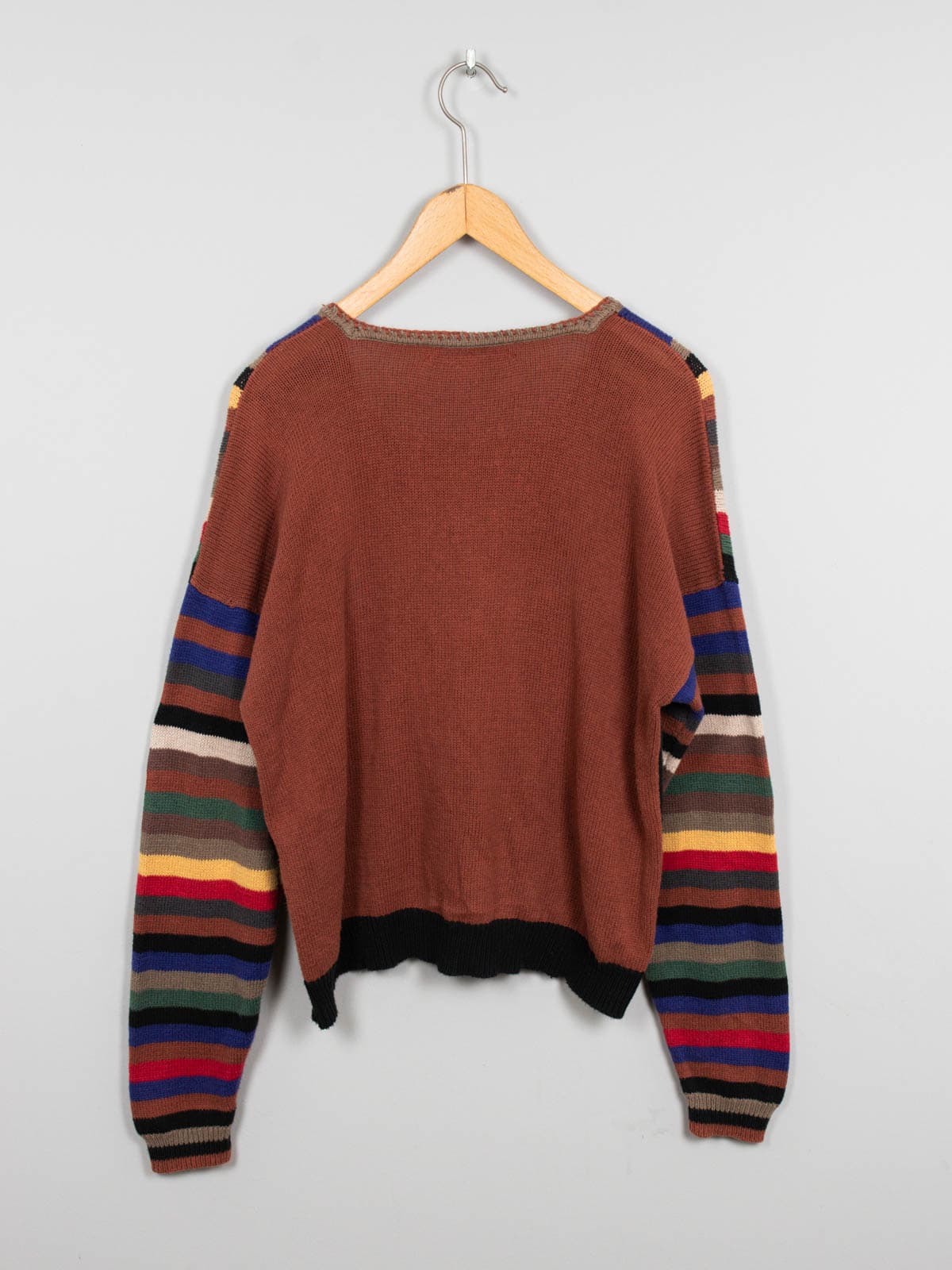 Beschreibung: Geringelter und kunterbunter Vintage Strickpullover aus Baumwolle.