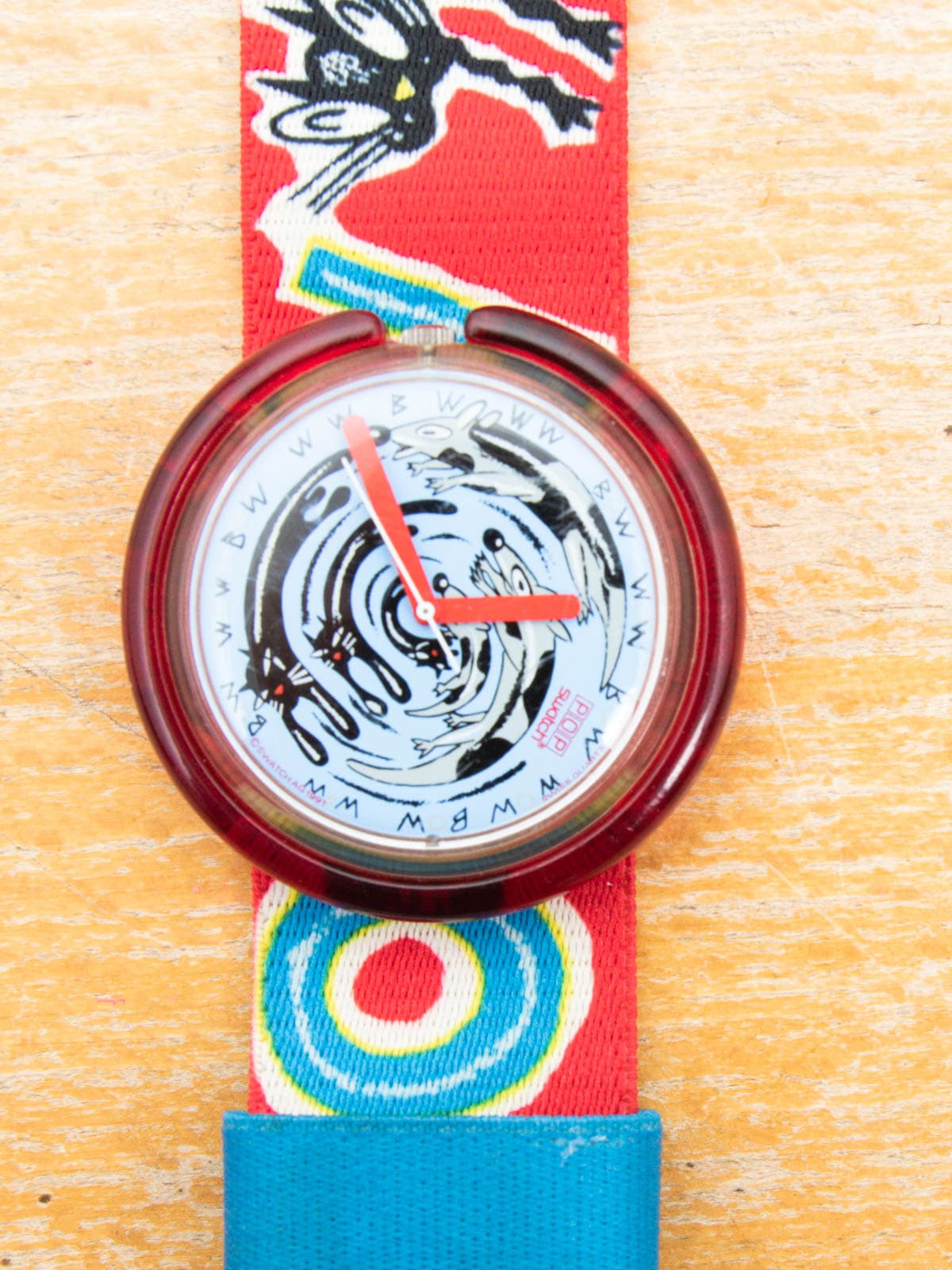 Beschreibung: Rote 90er Jahre Swatch Pop Armbanduhr mit witzigem Katz & Maus Motiv. Die Uhr wird mit einer frisch gewechselten Batterie geliefert.