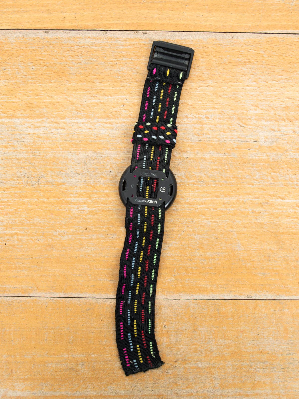 Beschreibung: Schwarze Swatch Pop Armbanduhr mit bunten Punkten aus den 90er Jahren. Die Uhr wird mit einer frisch gewechselten Batterie geliefert.