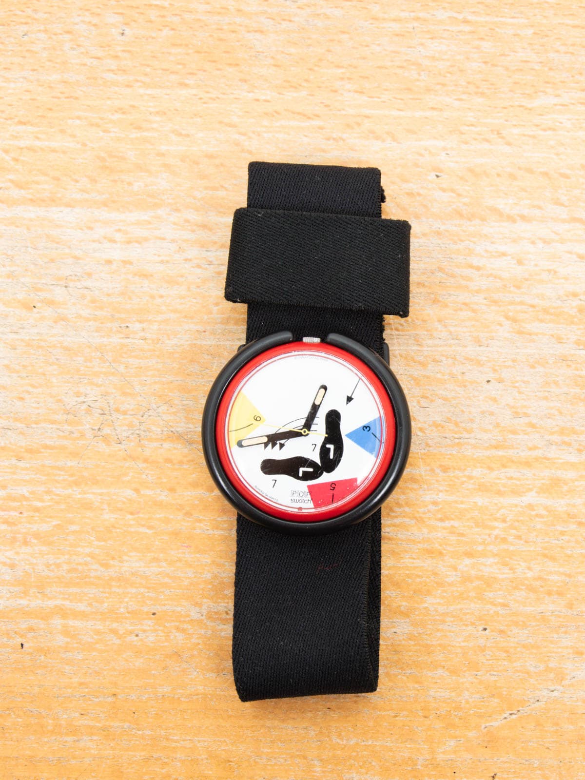 Beschreibung: Schwarze 90er Jahre Swatch Pop Armbanduhr mit bunten Highlights. Die Uhr wird mit einer frisch gewechselten Batterie geliefert.