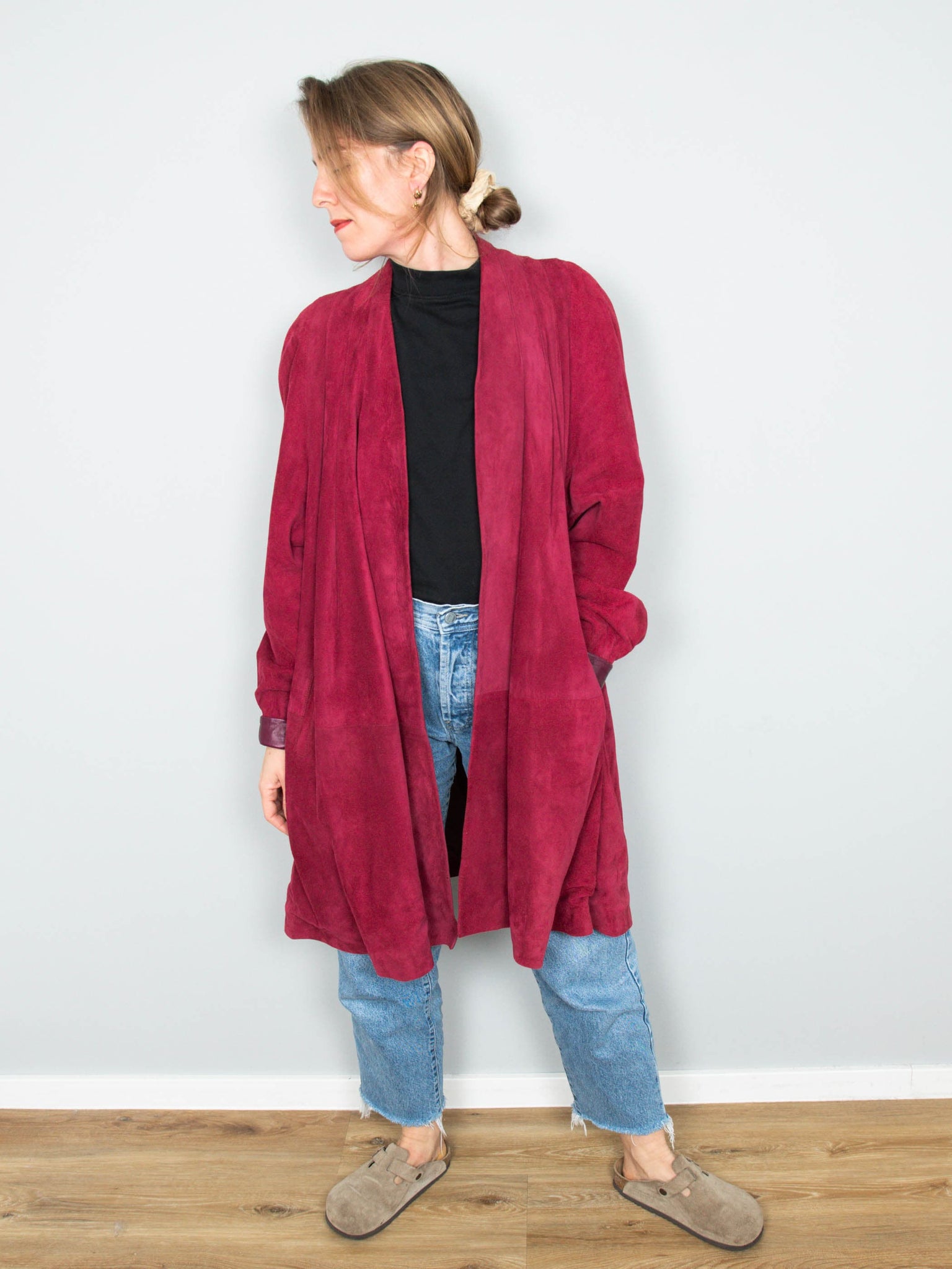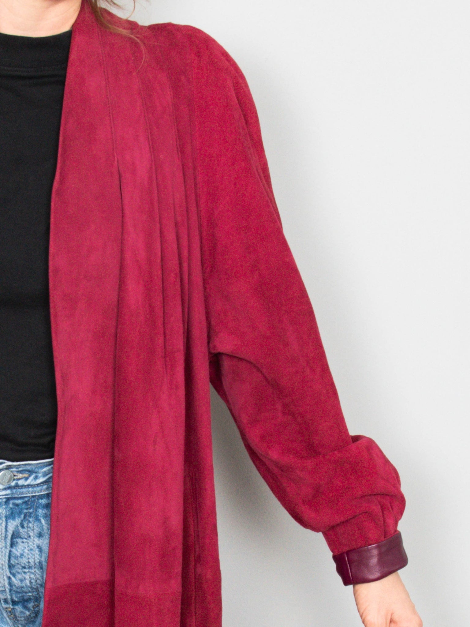 Beschreibung: Ein wunderschöner und ausgefallener Wildledermantel in kräftigem und dunklem Pink. Das Wildleder ist butterweich und der Vintage Wildledermantel lässt sich nicht verschließen und ist offen auszuführen. Ausgestattet ist der Mantel mit zwei Seitentaschen.